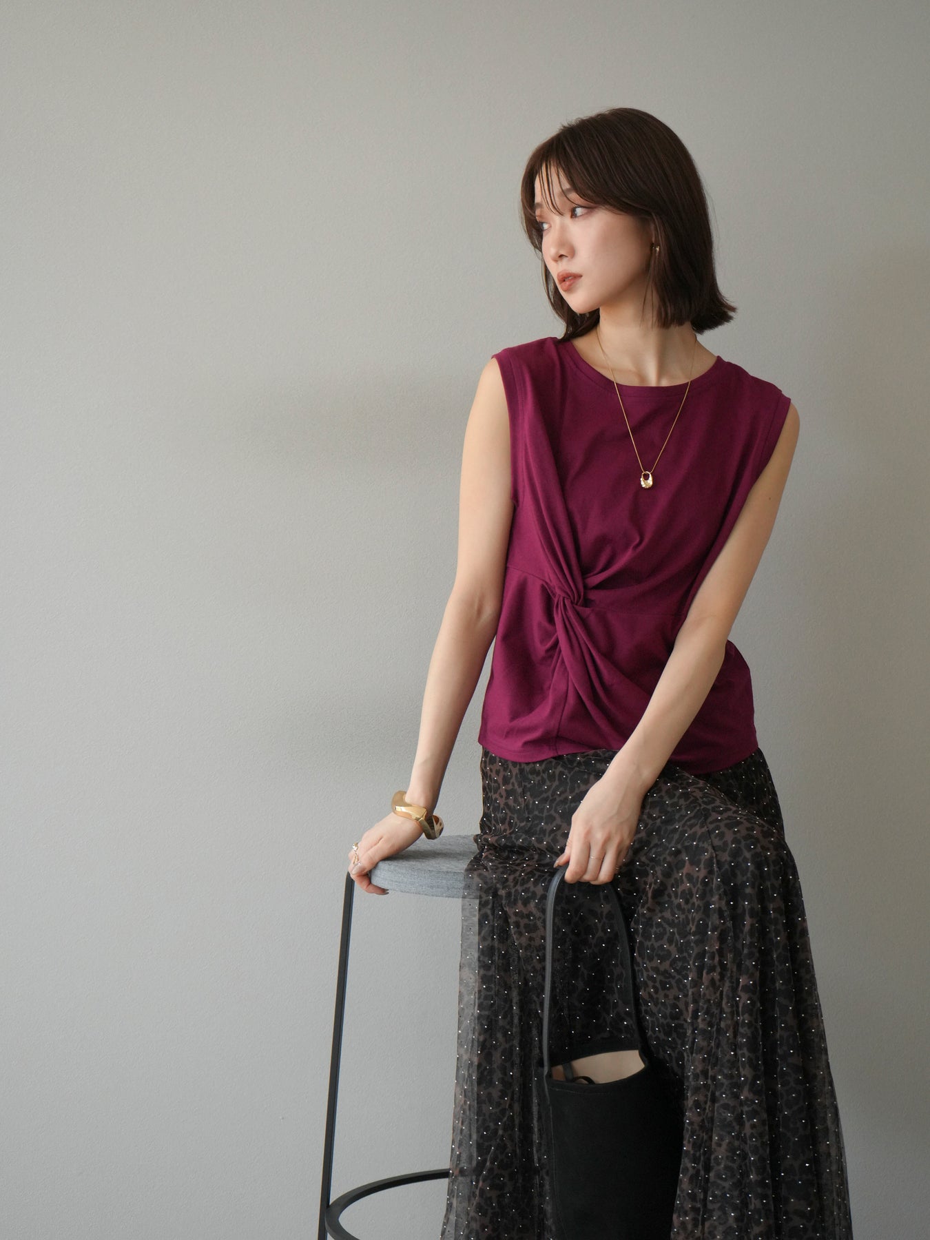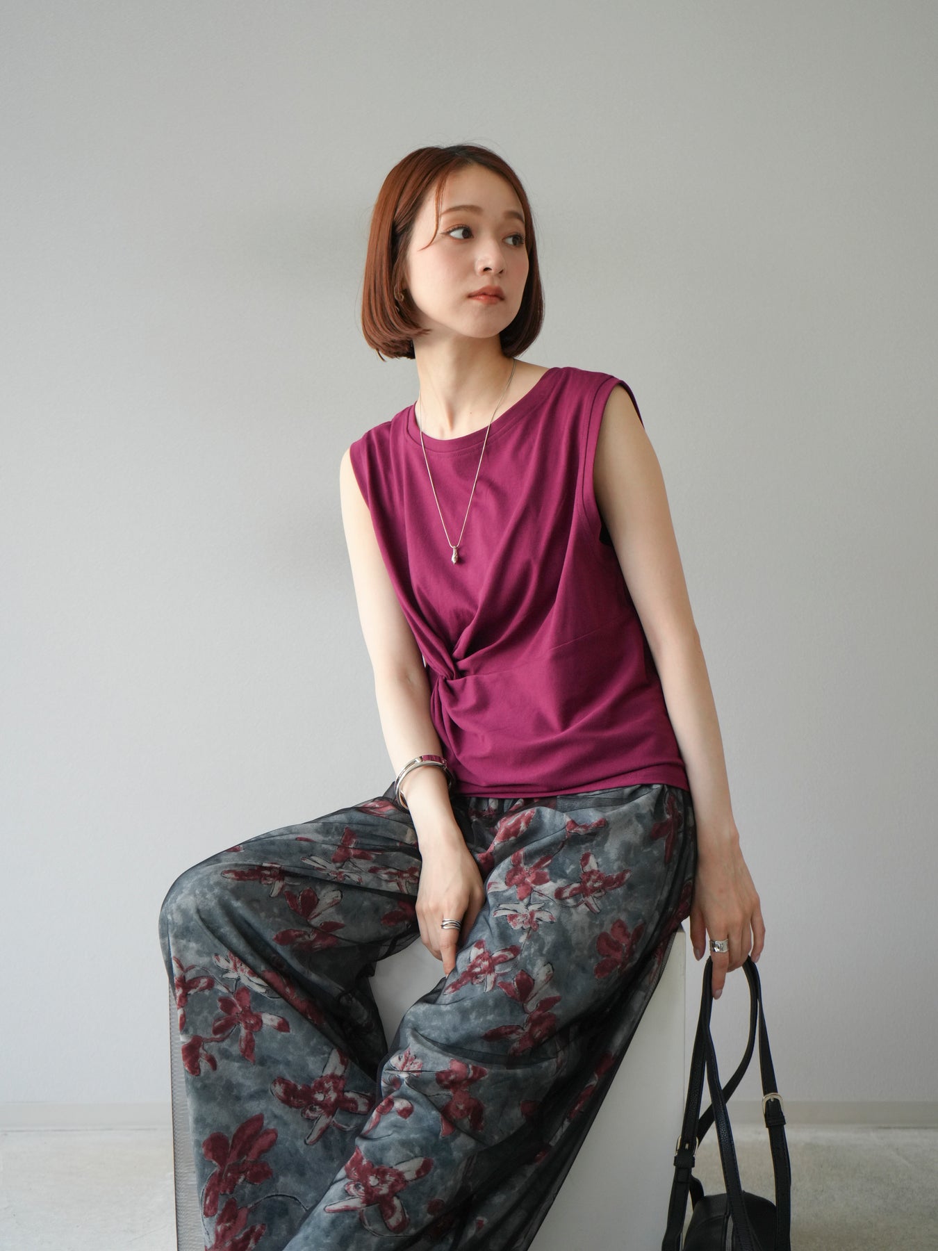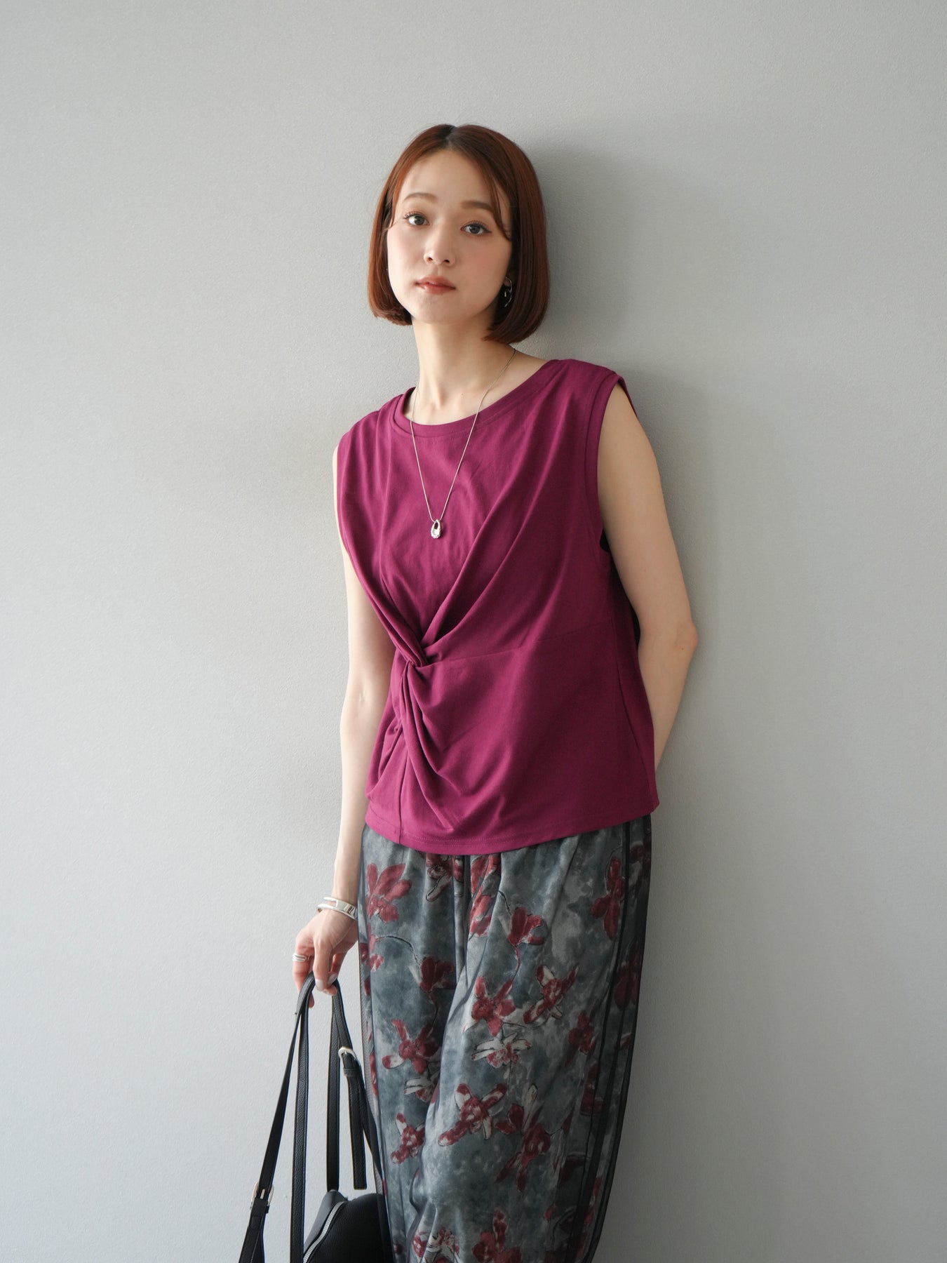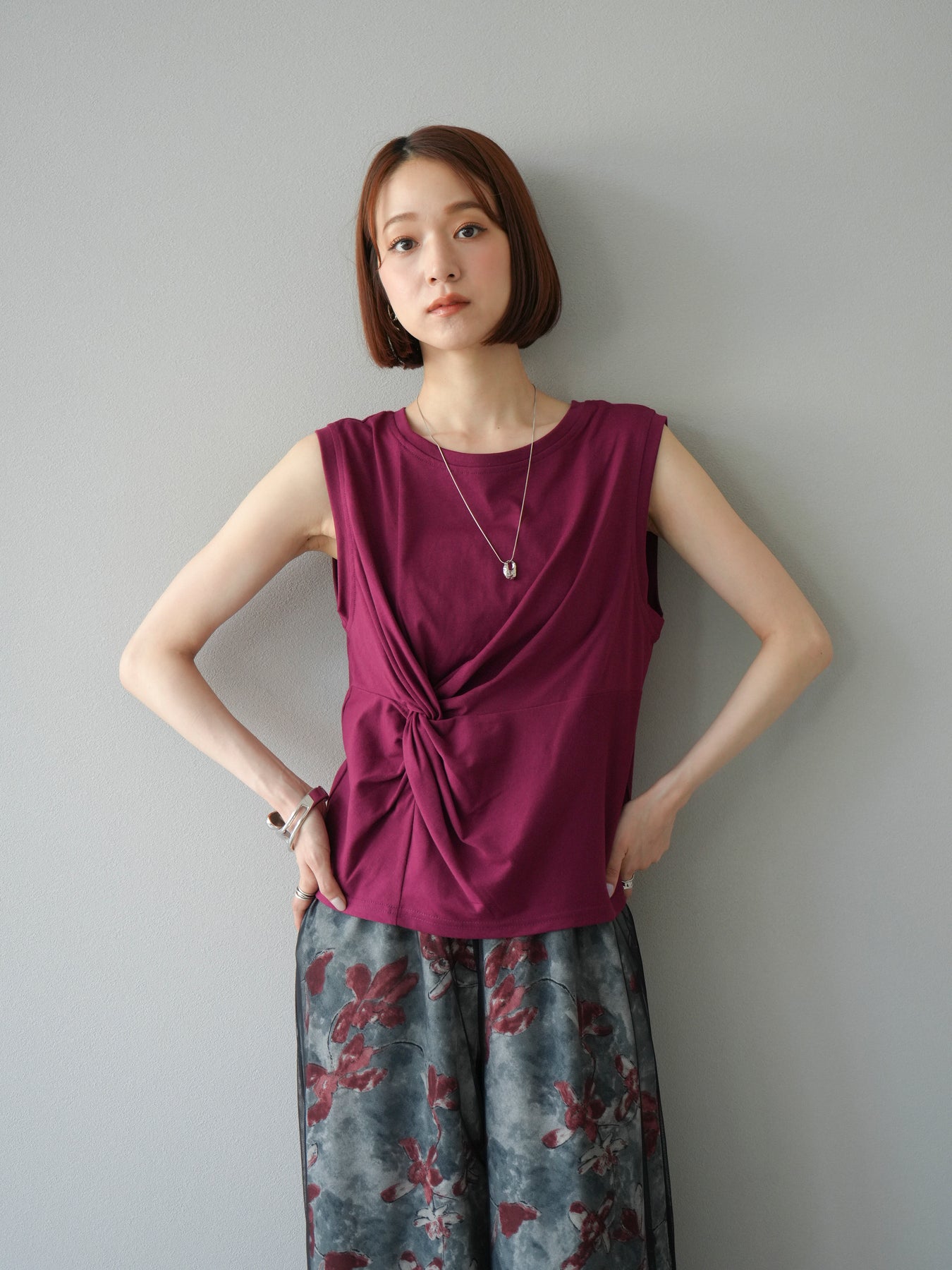 フロントに施したツイストデザインが、立体感と女性らしさを引き立てるノースリーブカットソー。 シンプルな中にもひねりを効かせたデザインで、1枚で着映えする主役トップスに。ウエストラインを自然にシェイプするツイストディテールが、スタイルアップ効果も演出します。 程よい厚みのカットソー生地で、さらっと快適な着心地も魅力。ワイドパンツやロングスカートと合わせれば、バランスよく決まります。 カジュアルからきれいめまで幅広く活躍する、夏の万能トップスです。