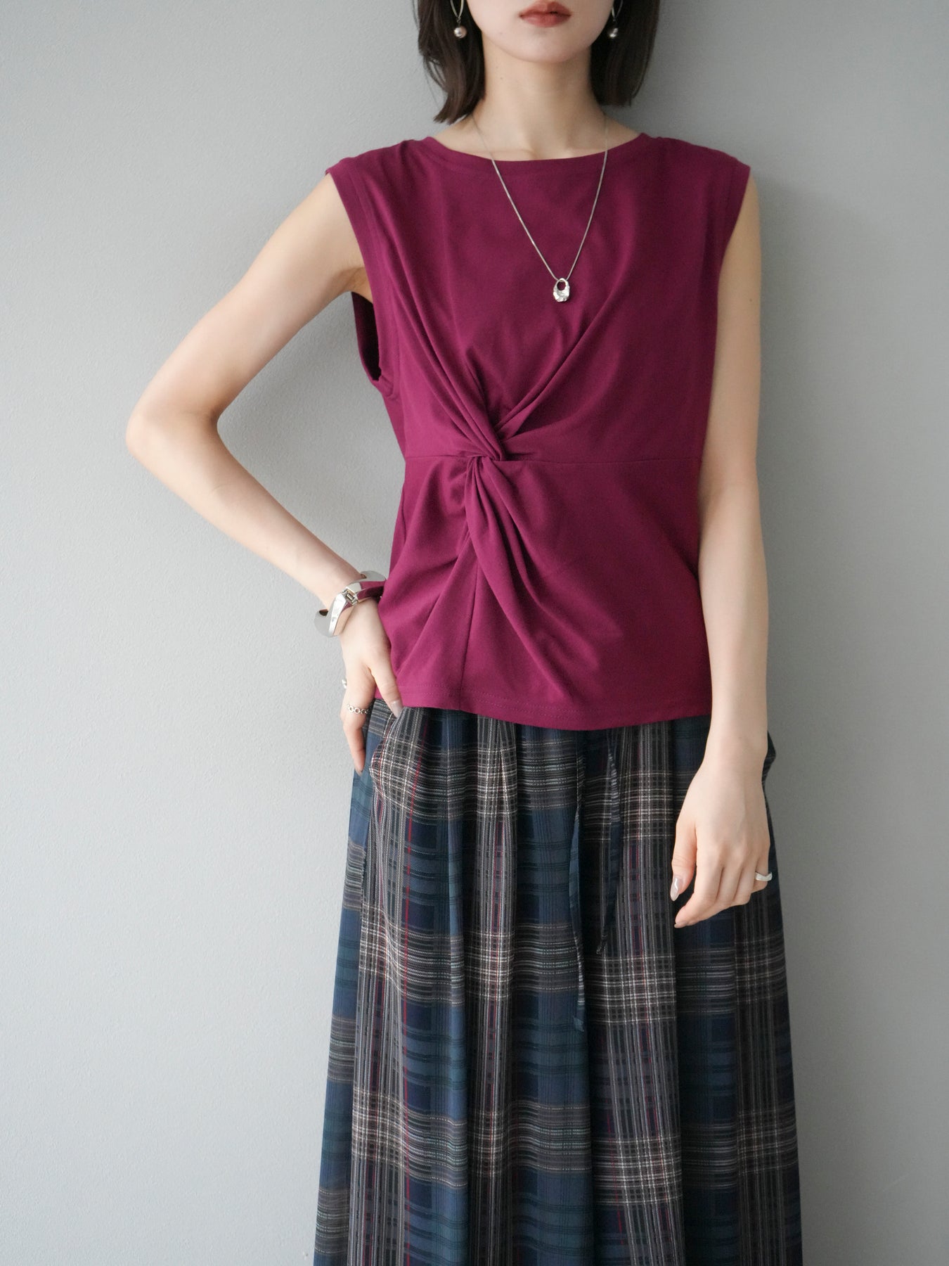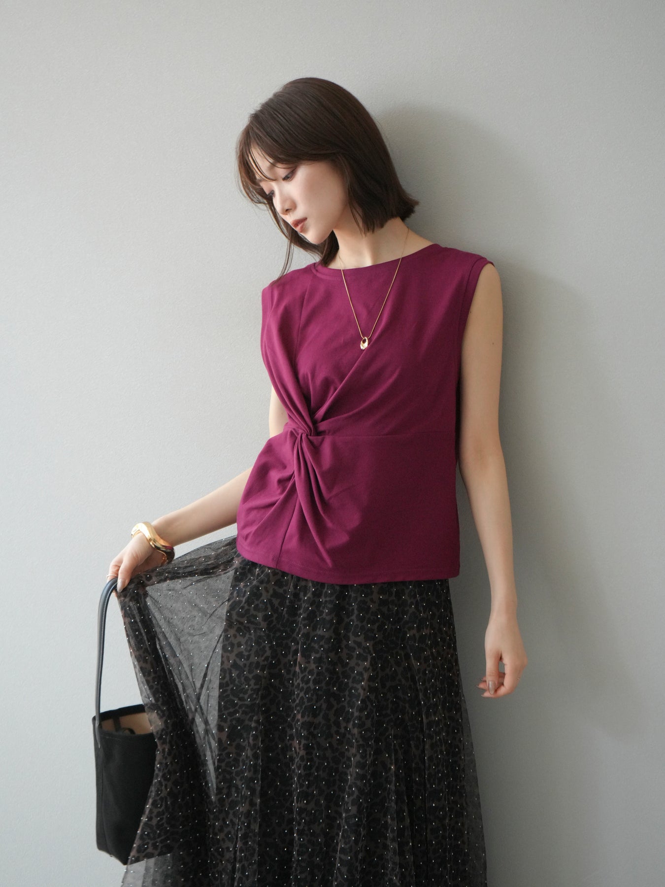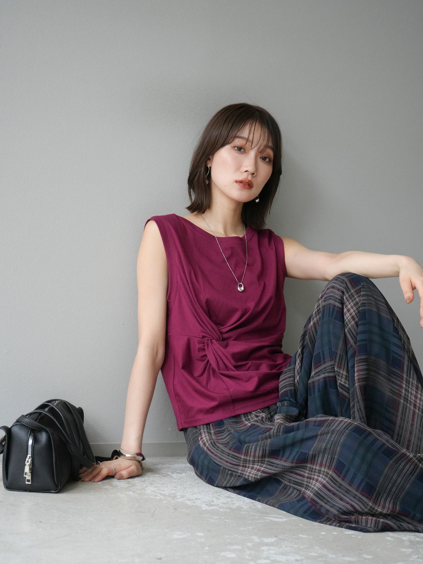 フロントに施したツイストデザインが、立体感と女性らしさを引き立てるノースリーブカットソー。 シンプルな中にもひねりを効かせたデザインで、1枚で着映えする主役トップスに。ウエストラインを自然にシェイプするツイストディテールが、スタイルアップ効果も演出します。 程よい厚みのカットソー生地で、さらっと快適な着心地も魅力。ワイドパンツやロングスカートと合わせれば、バランスよく決まります。 カジュアルからきれいめまで幅広く活躍する、夏の万能トップスです。