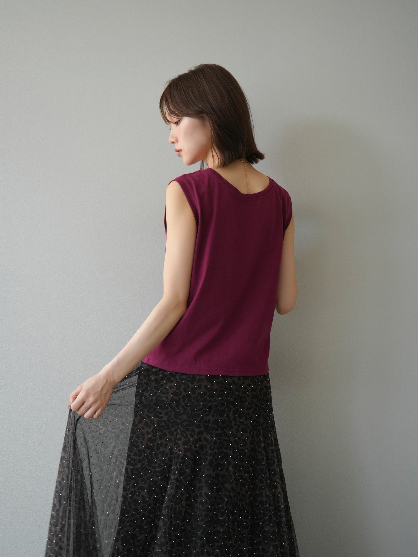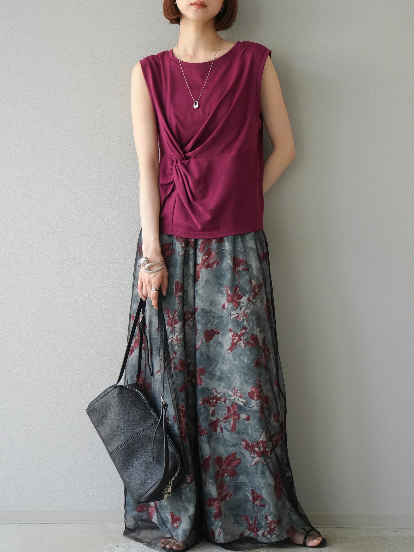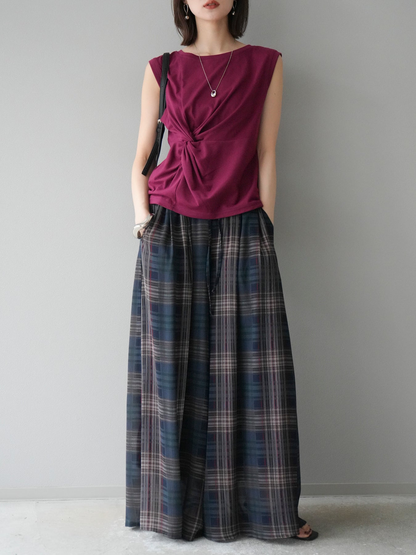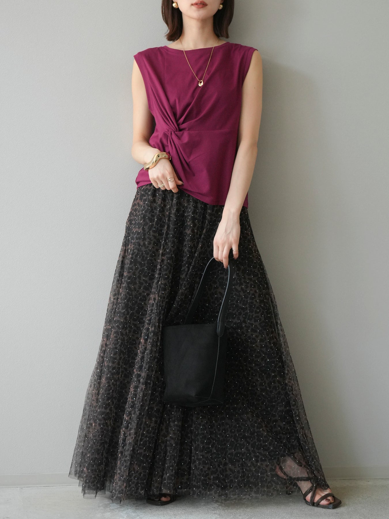 フロントに施したツイストデザインが、立体感と女性らしさを引き立てるノースリーブカットソー。 シンプルな中にもひねりを効かせたデザインで、1枚で着映えする主役トップスに。ウエストラインを自然にシェイプするツイストディテールが、スタイルアップ効果も演出します。 程よい厚みのカットソー生地で、さらっと快適な着心地も魅力。ワイドパンツやロングスカートと合わせれば、バランスよく決まります。 カジュアルからきれいめまで幅広く活躍する、夏の万能トップスです。