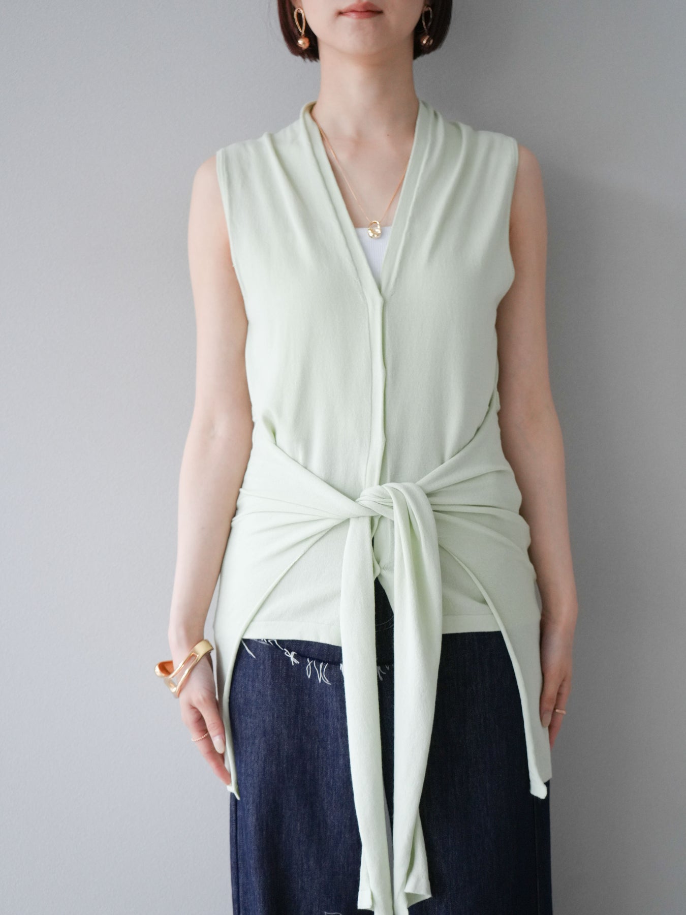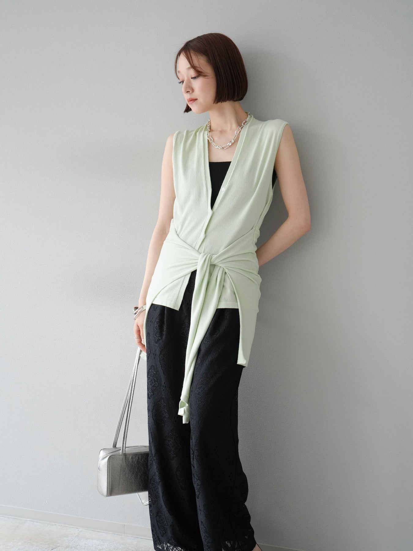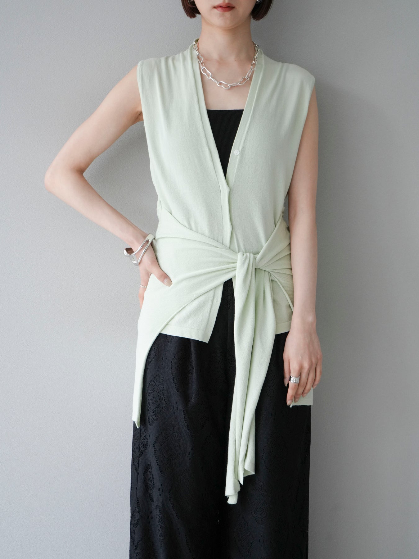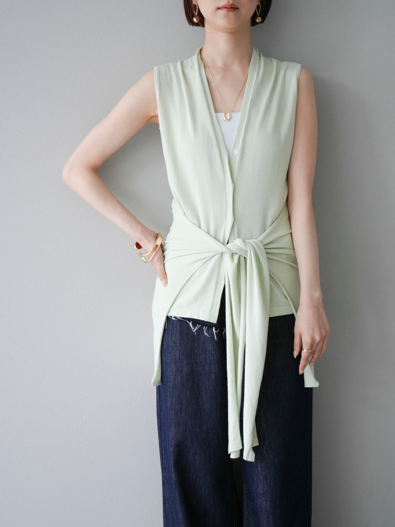 這款無袖針織開襟衫採用令人印象深刻的腰部裹身設計。正面採用簡約的V領開襟衫款式,下擺飾有假袖,獨特的細節設計使其看起來像是裹在腰部一樣。它能為您的造型增添俏皮精緻的感覺,非常適合搭配背心或T卹疊穿。柔軟垂墜的面料使其在春夏季節穿著涼爽舒適。 ※除下裝、吊帶背心(內衣)以外的商品均不含內衣。