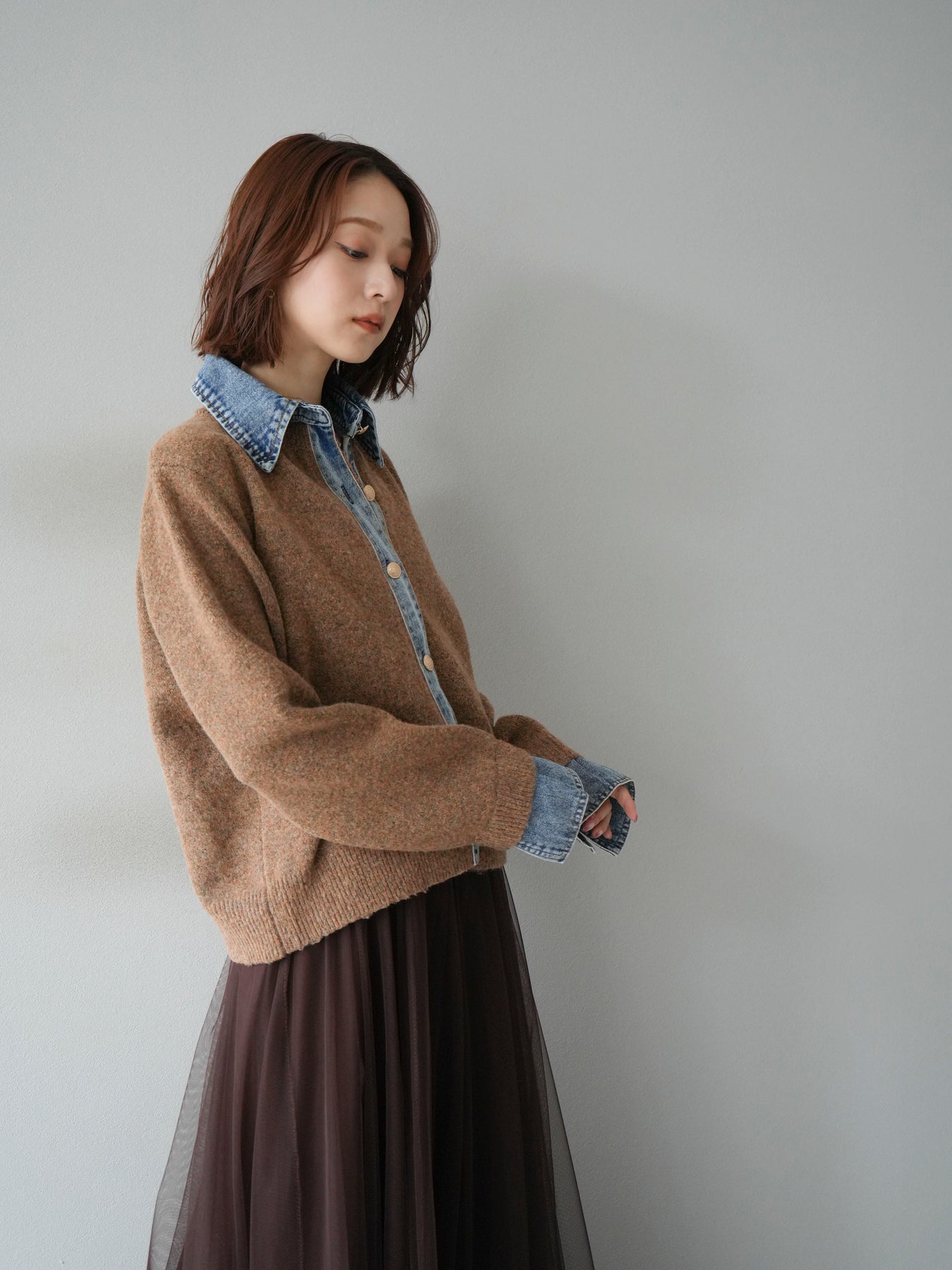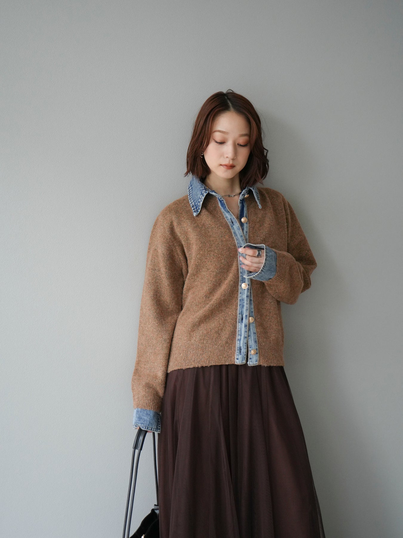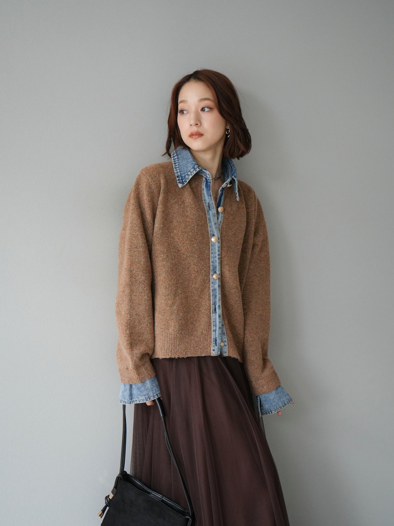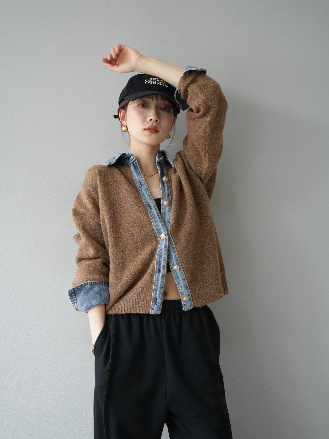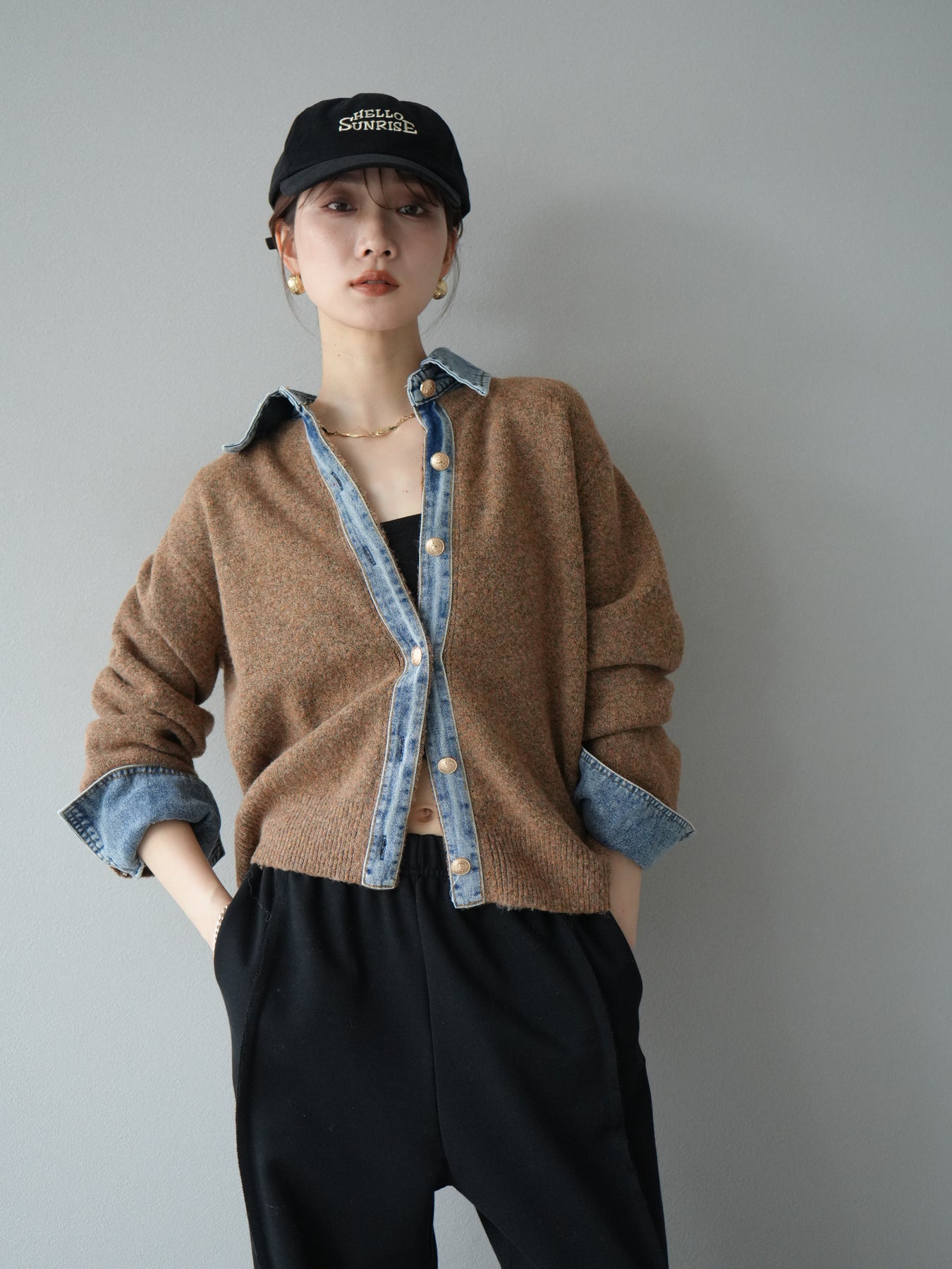 【預購】牛仔領紐扣針織開襟衫/駝色
