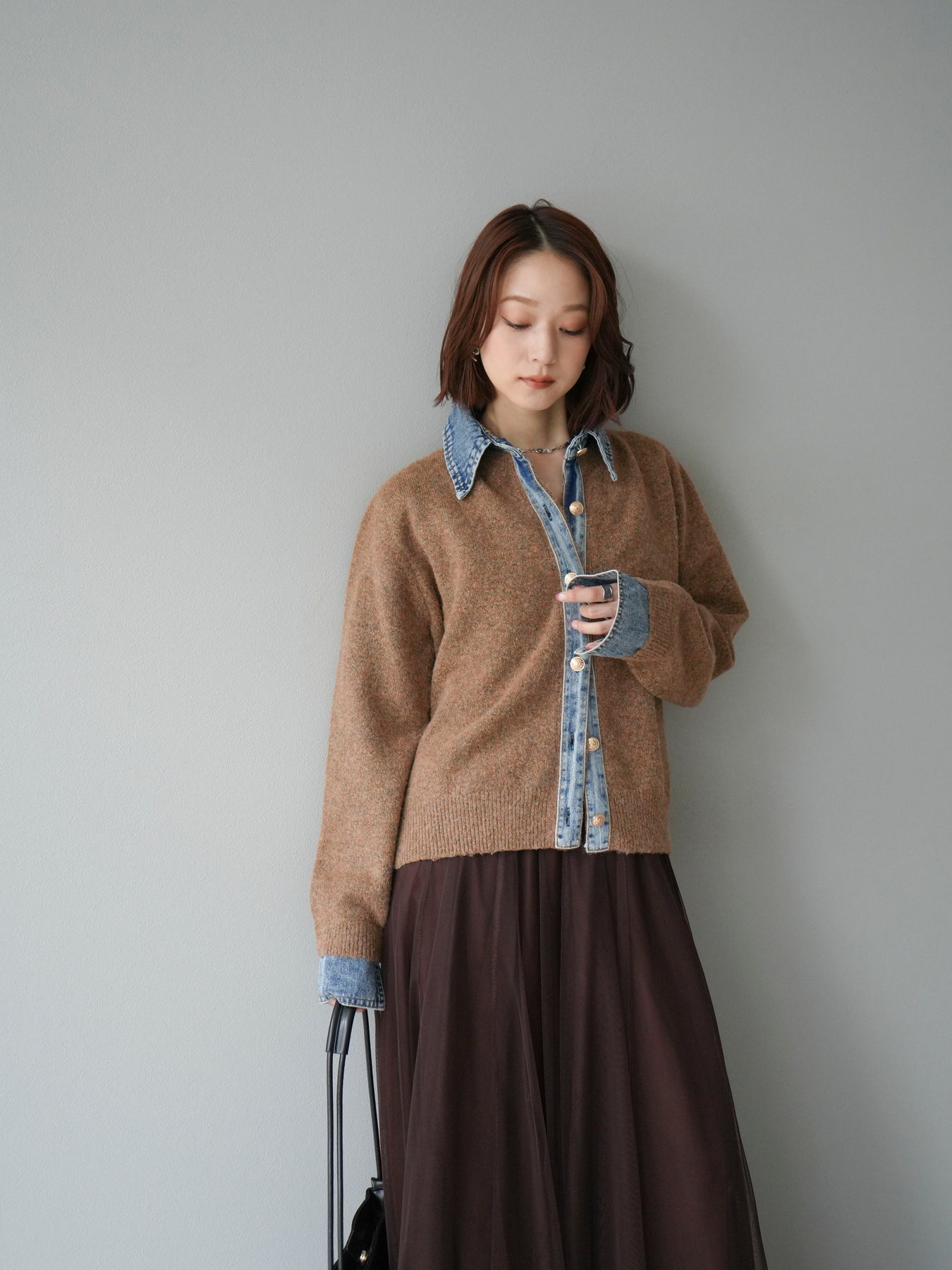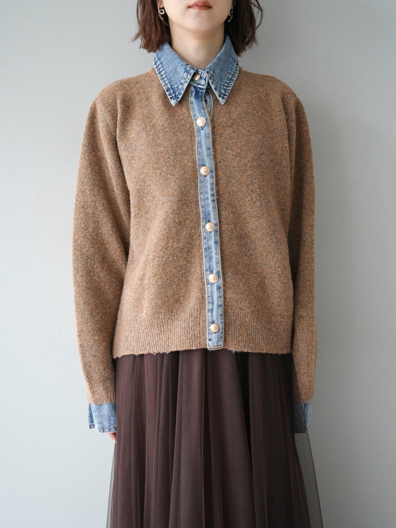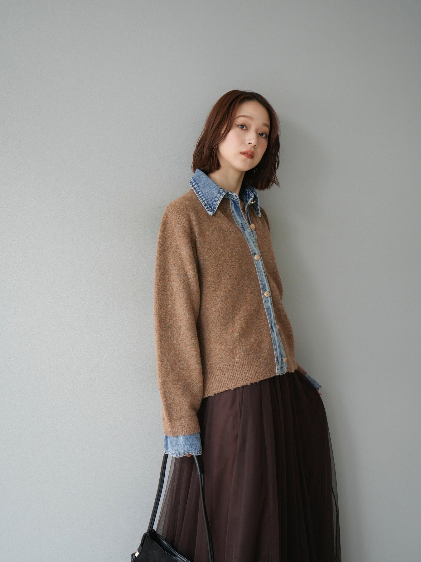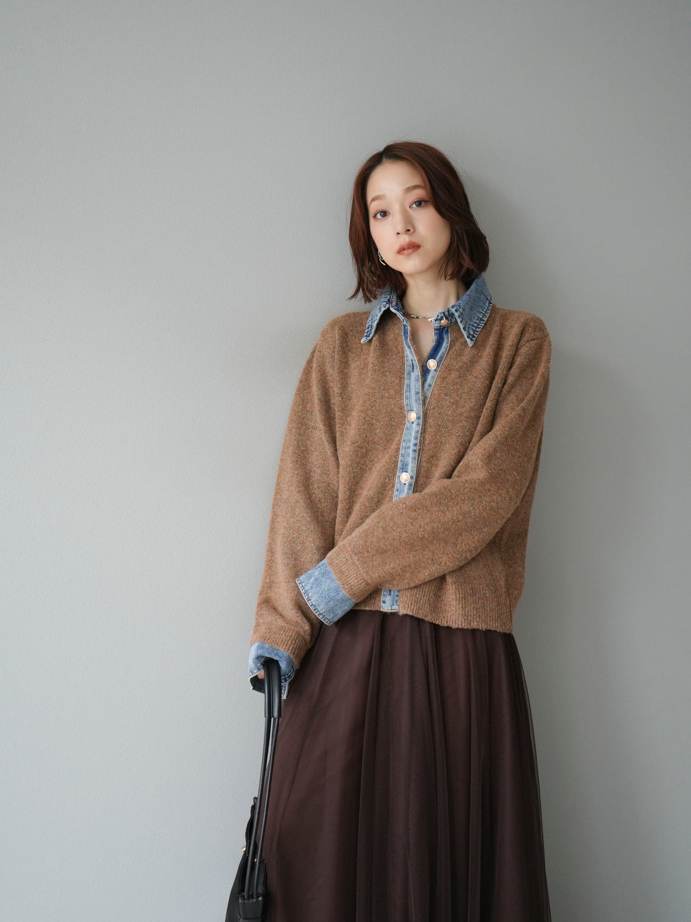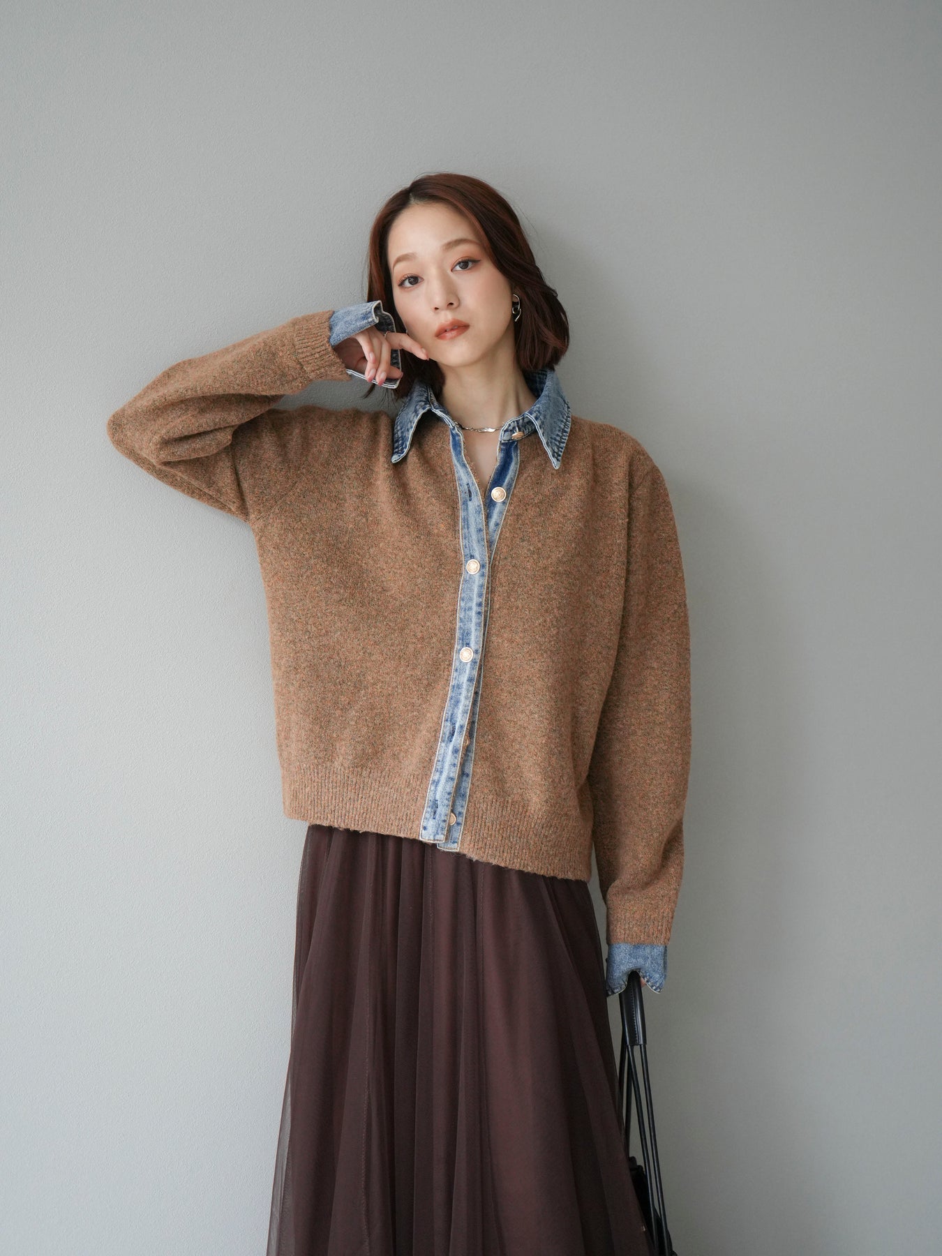 【預購】牛仔領紐扣針織開襟衫/駝色