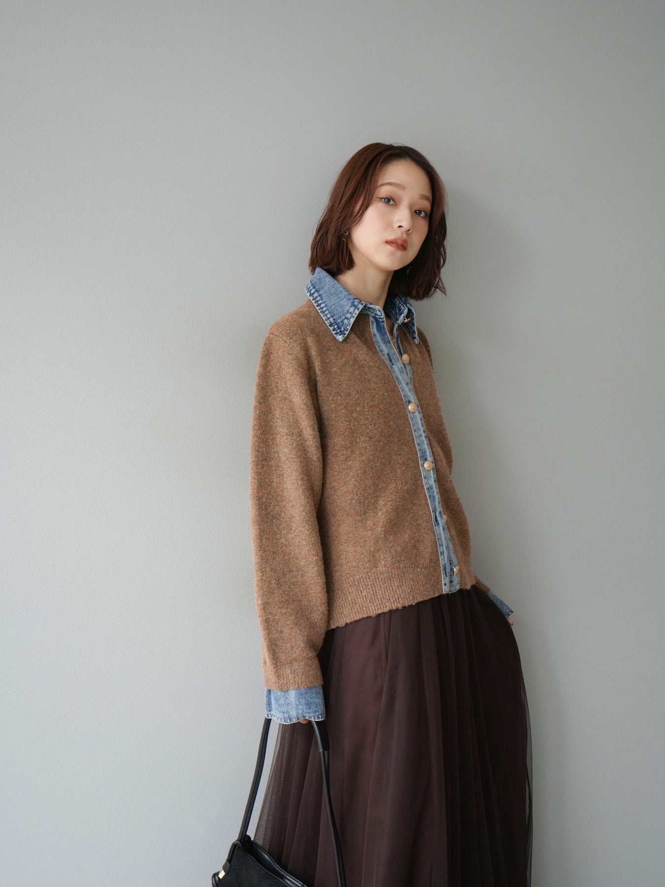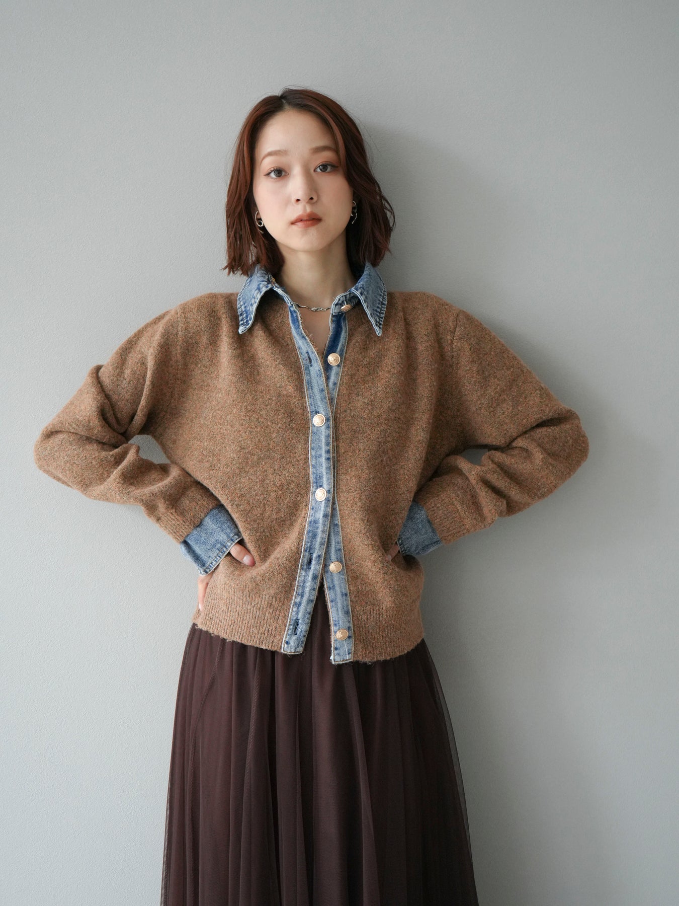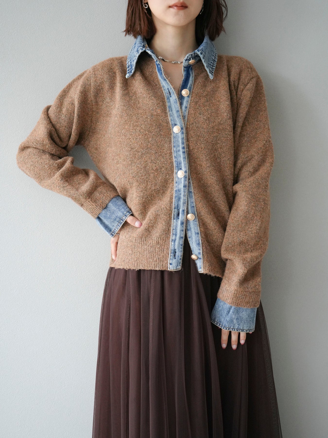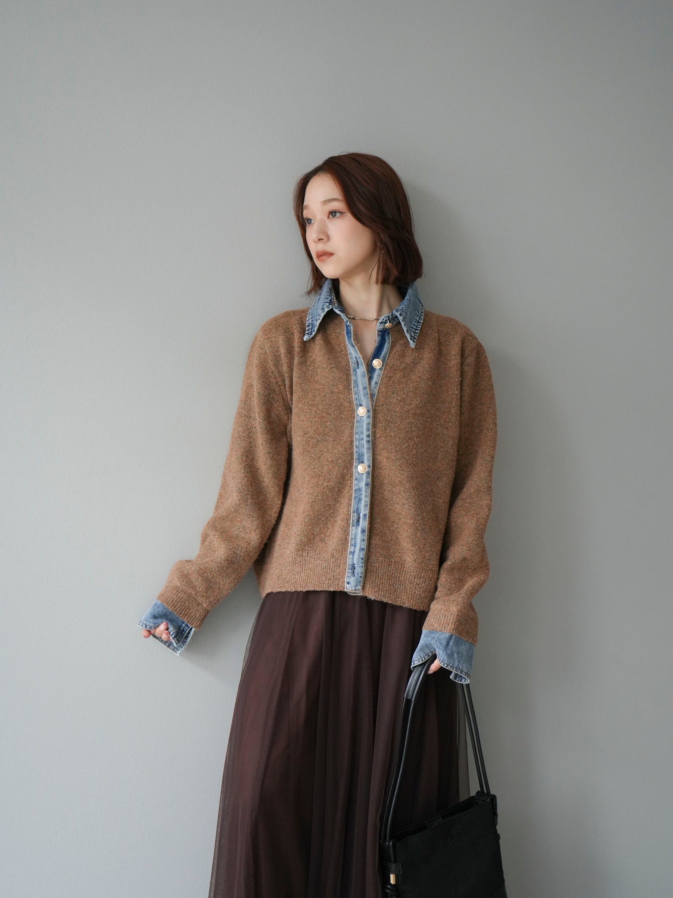 【預購】牛仔領紐扣針織開襟衫/駝色