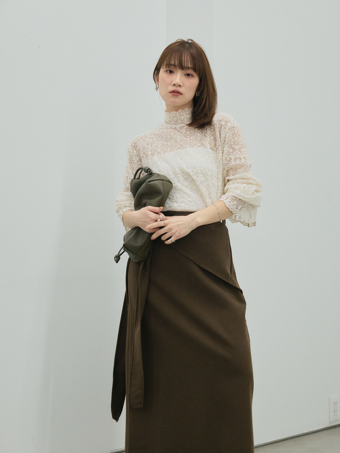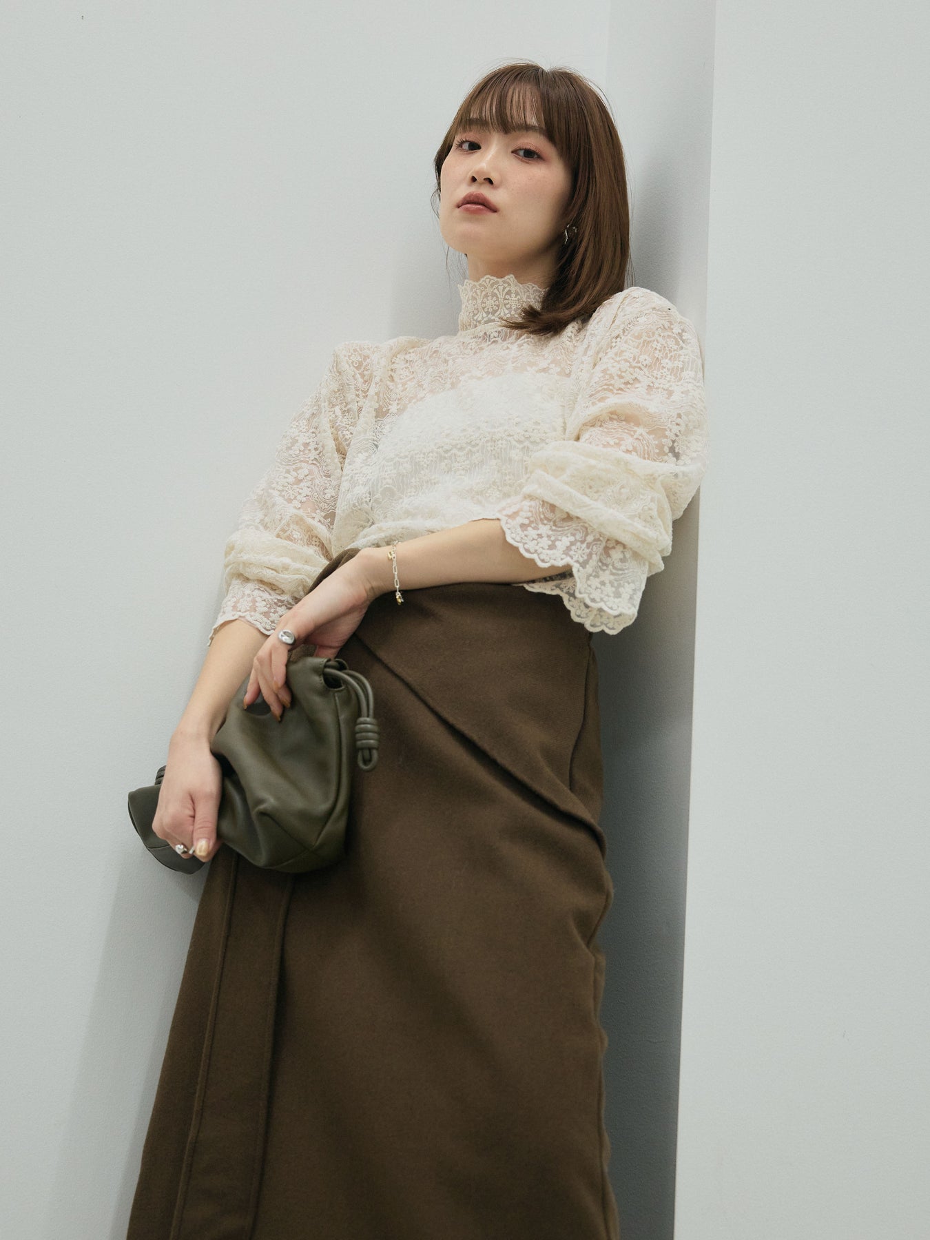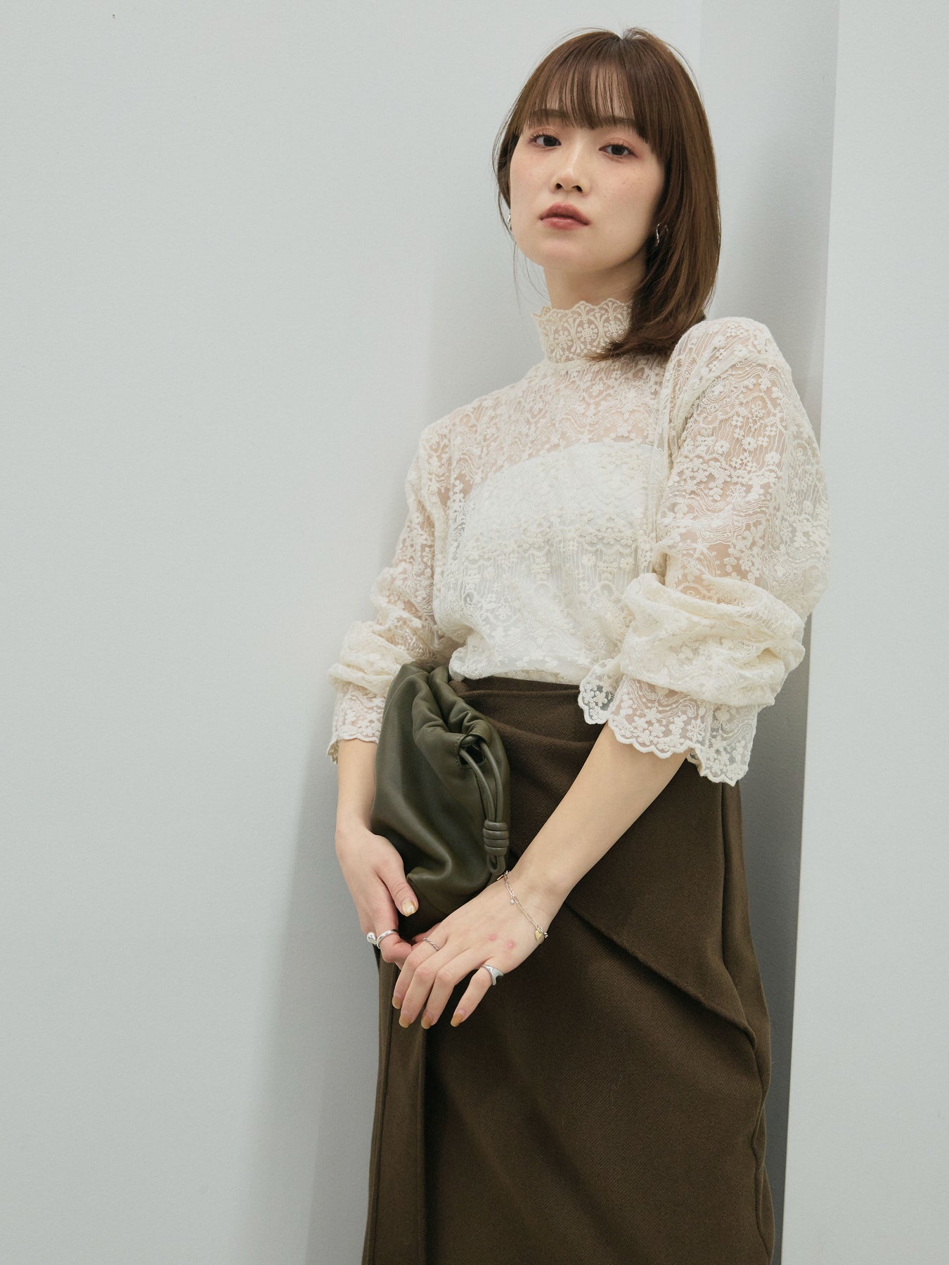 繊細なレース素材を贅沢に使用したハイネックトップス。 上品な透け感とクラシカルなスタンドネックデザインが、スタイリングに女性らしさとモード感をプラス。袖口と裾のスカラップディテールが、繊細な印象を引き立てます。 一枚で存在感がありつつ、ジャケットやベストのインナーとしても映えるデザイン。合わせるボトム次第で、甘めからクールまで幅広いテイストに対応可能です。