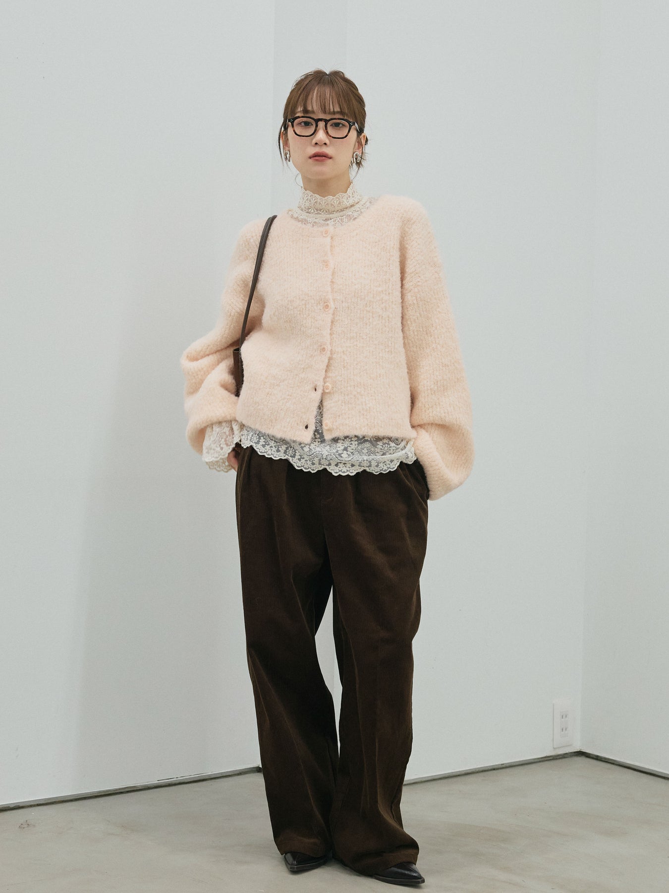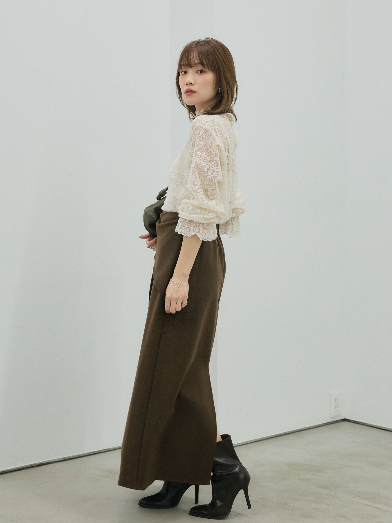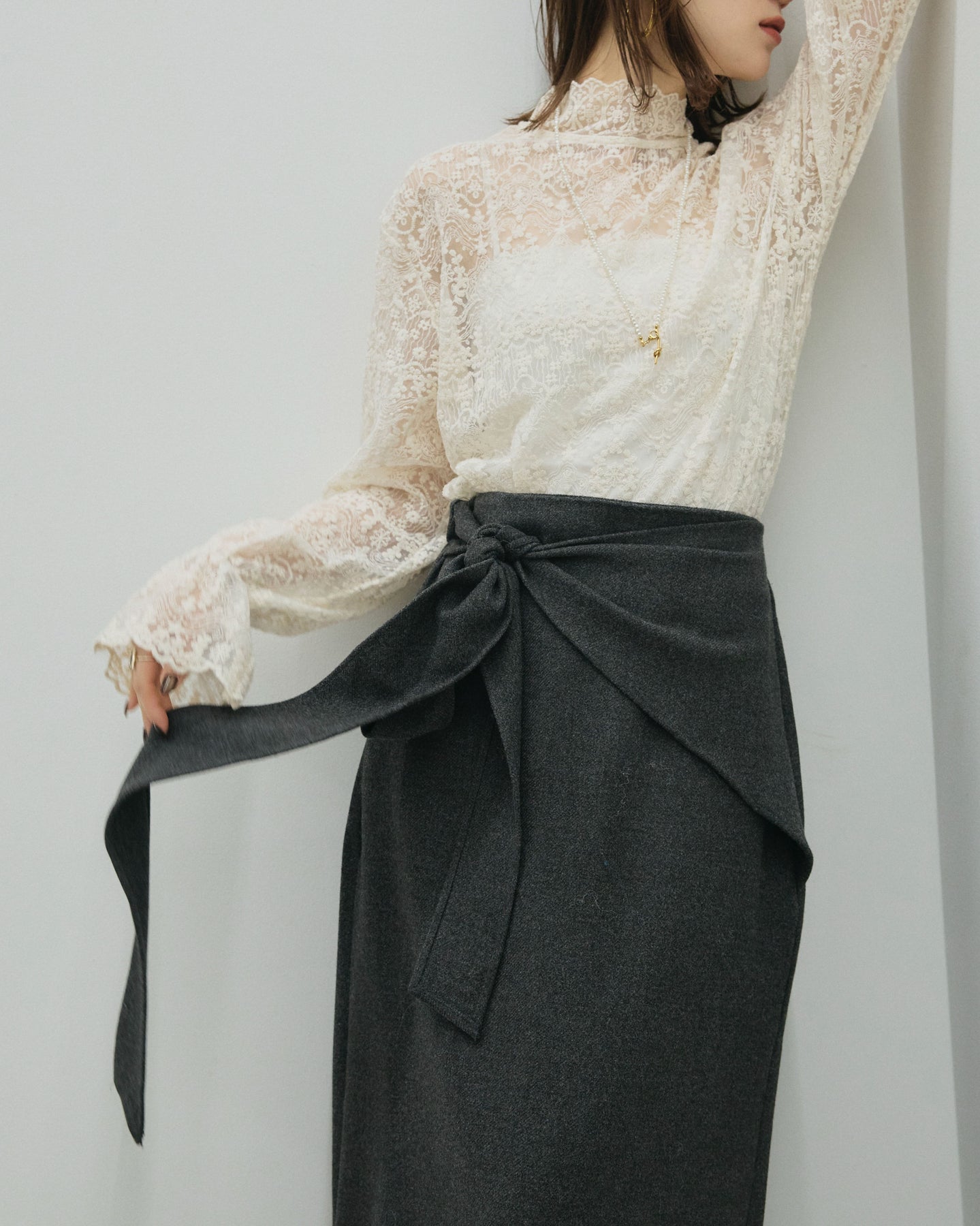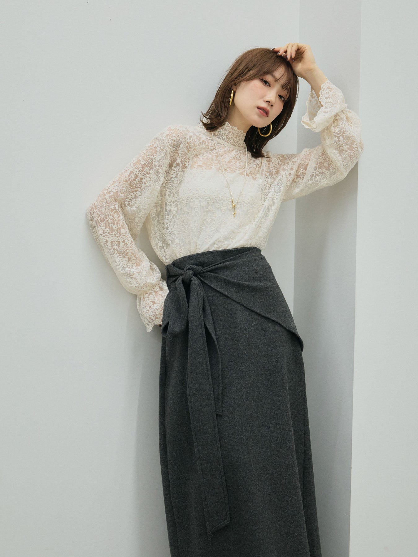 繊細なレース素材を贅沢に使用したハイネックトップス。 上品な透け感とクラシカルなスタンドネックデザインが、スタイリングに女性らしさとモード感をプラス。袖口と裾のスカラップディテールが、繊細な印象を引き立てます。 一枚で存在感がありつつ、ジャケットやベストのインナーとしても映えるデザイン。合わせるボトム次第で、甘めからクールまで幅広いテイストに対応可能です。