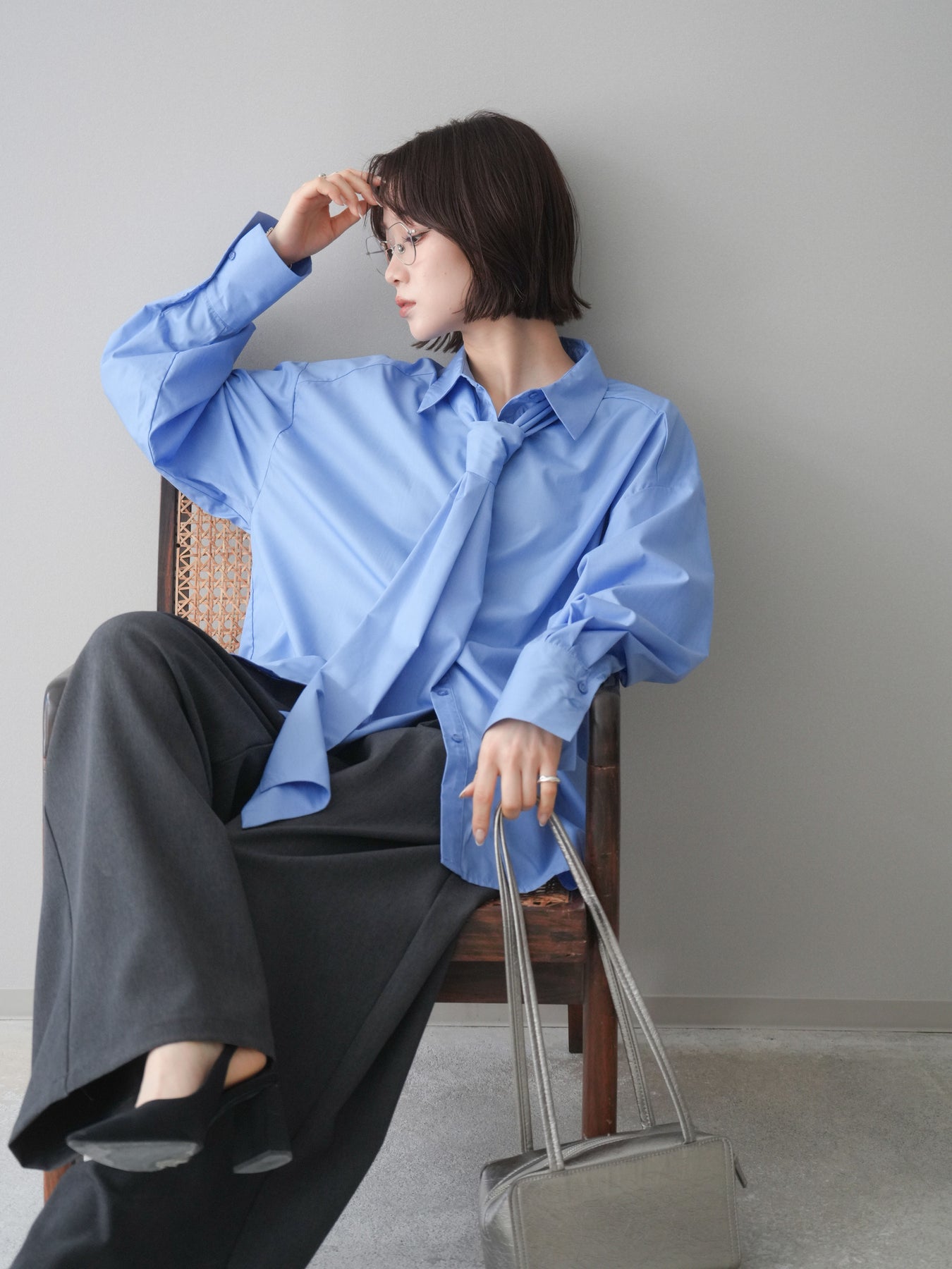 程よいハリ感のある素材が印象的な、ボウタイ付きオーバーシャツ。 ゆったりとしたシルエットに仕上げることで、肩の力を抜いた着こなしが叶う一枚です。 ボウタイは結び方次第で印象を変えられ、きちんと感のあるスタイルからラフなアレンジまで幅広く対応。 前を開けて羽織として着用するのもおすすめで、スタイリングに自然な奥行きをプラスします。 ヒップラインを程よくカバーする丈感で、パンツスタイルとの相性も良く、デイリーに取り入れやすいデザイン。 シンプルながらも着こなしにニュアンスを与えてくれる、着回し力の高いシャツアイテムです。 ※ボトムス、キャミソール(インナー)以外の商品は一律でインナーは付属していません。