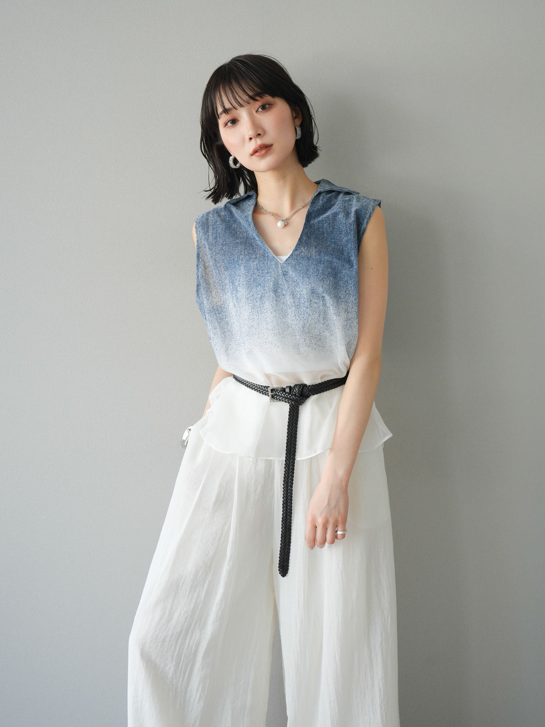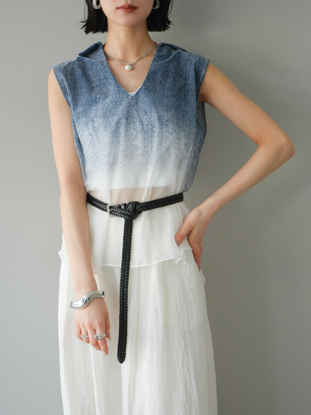 【預購】薄紗層疊條紋無袖上衣/薩克斯風