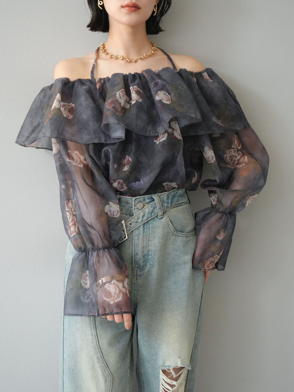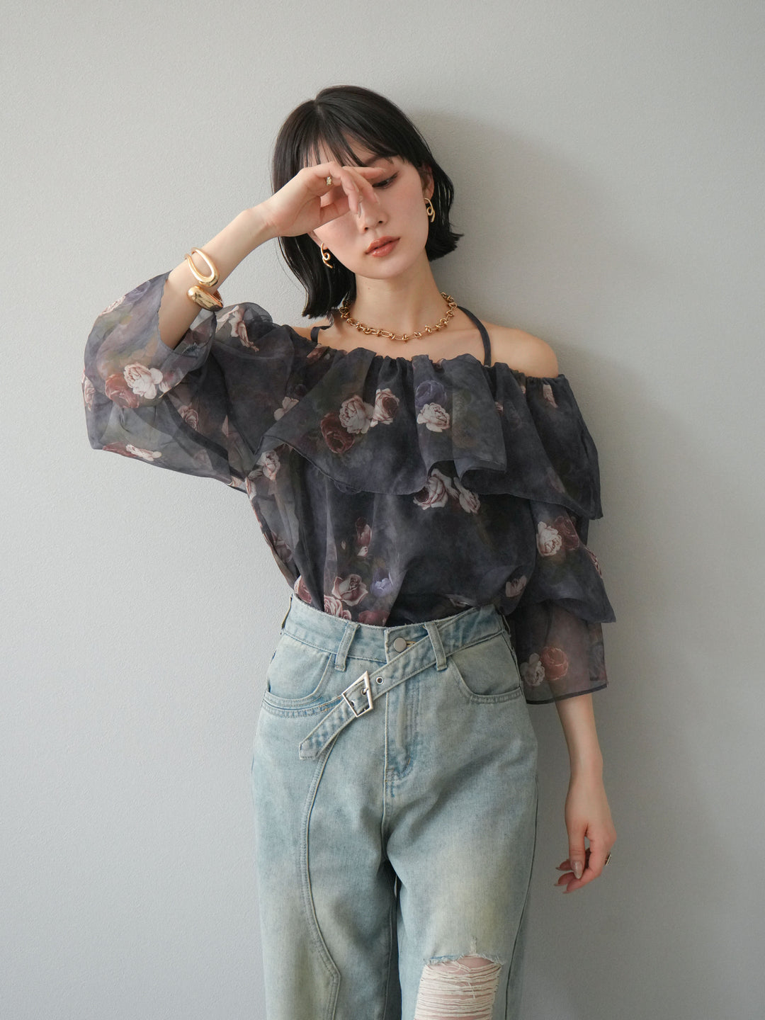 [預購] 花朵印花荷葉邊吊帶背心/黑色