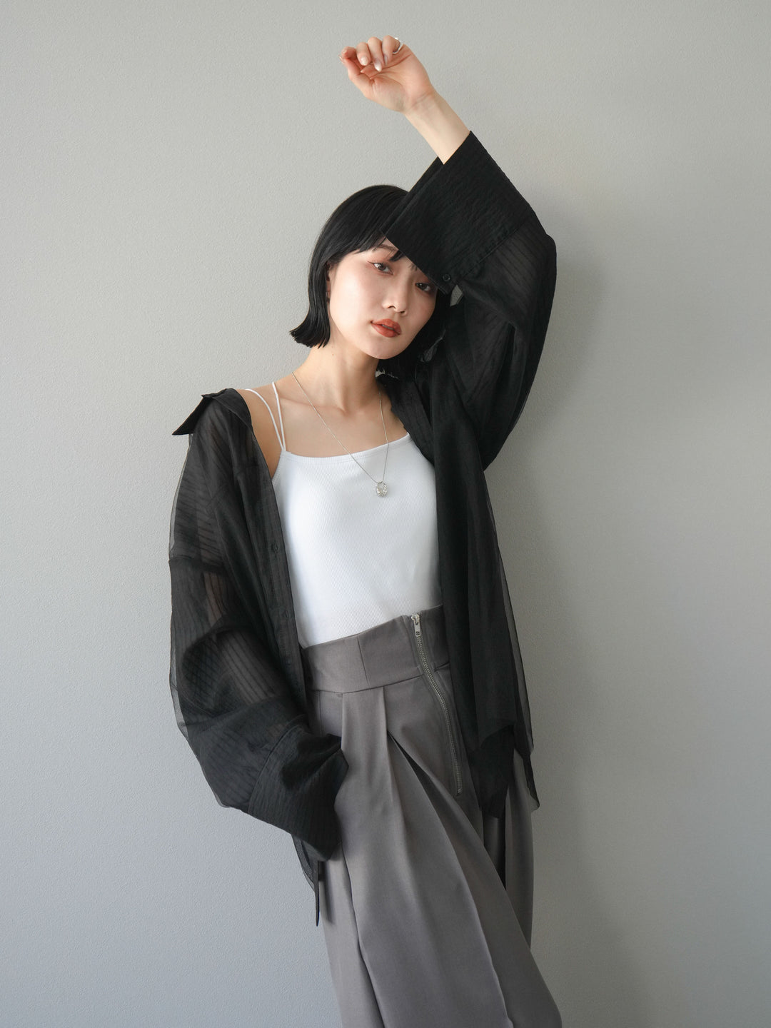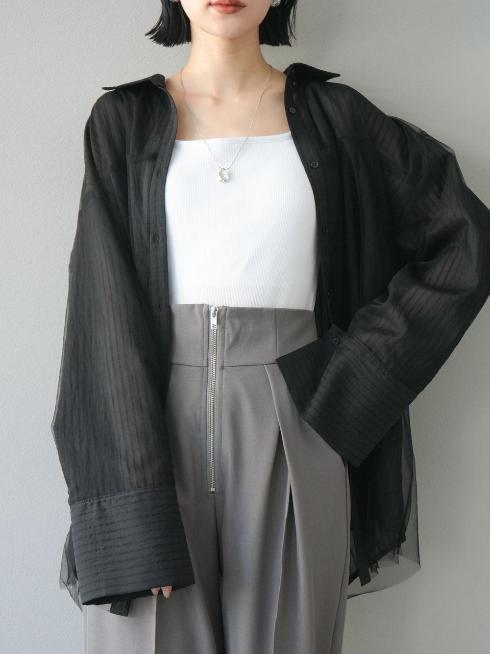 【預購】薄紗對接透視條紋大袖口oversized襯衫/黑色