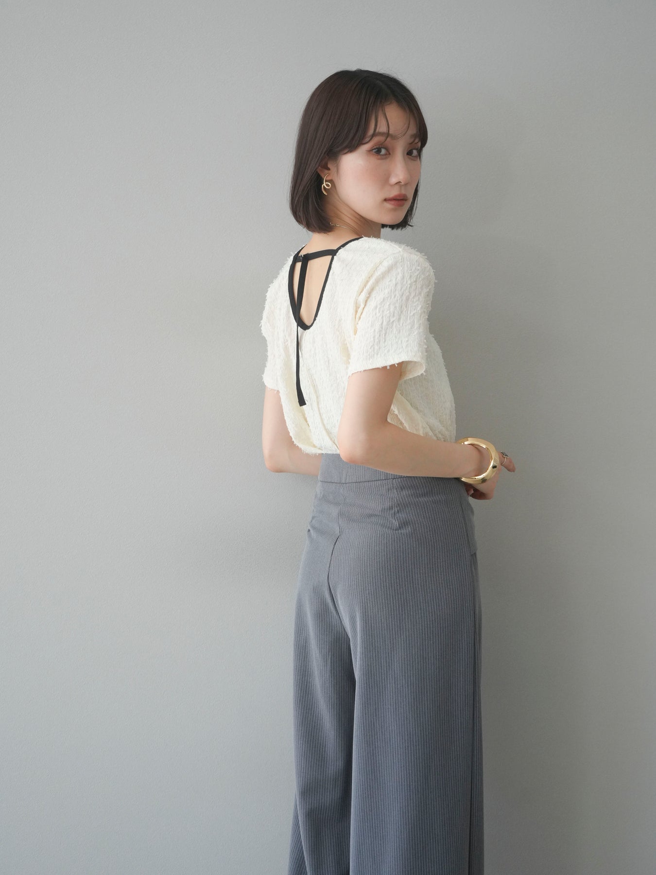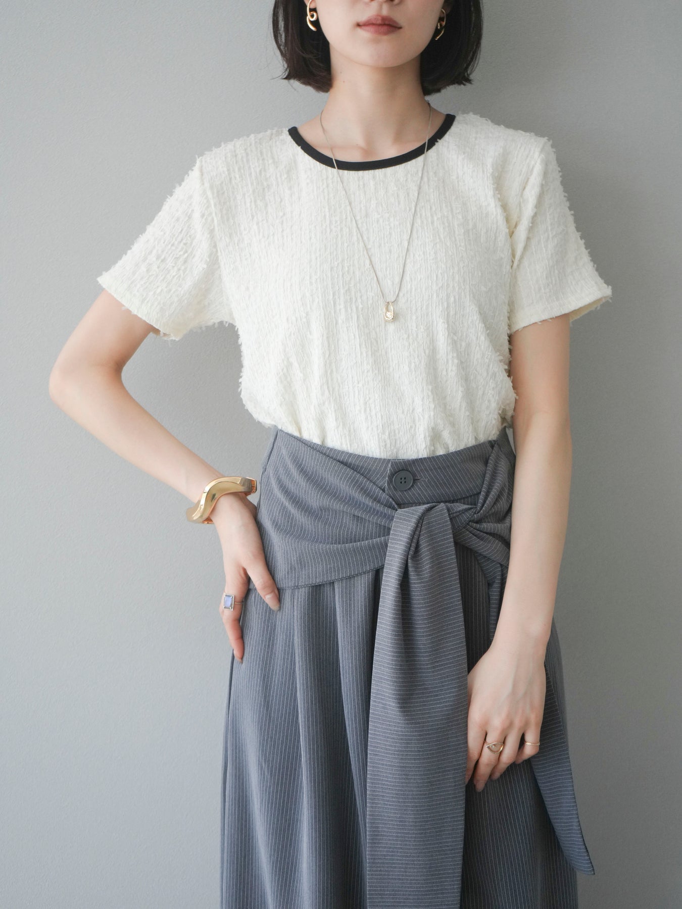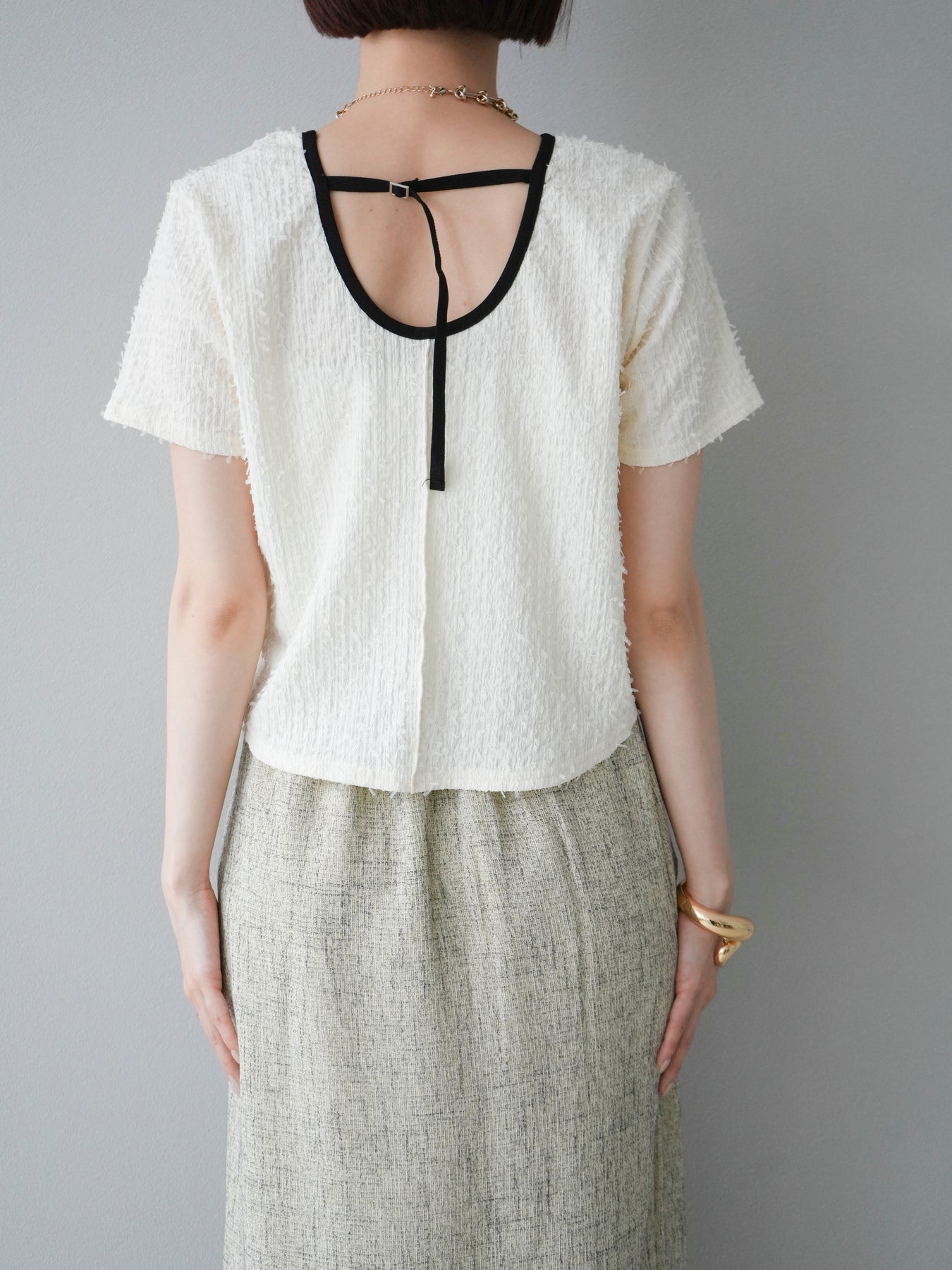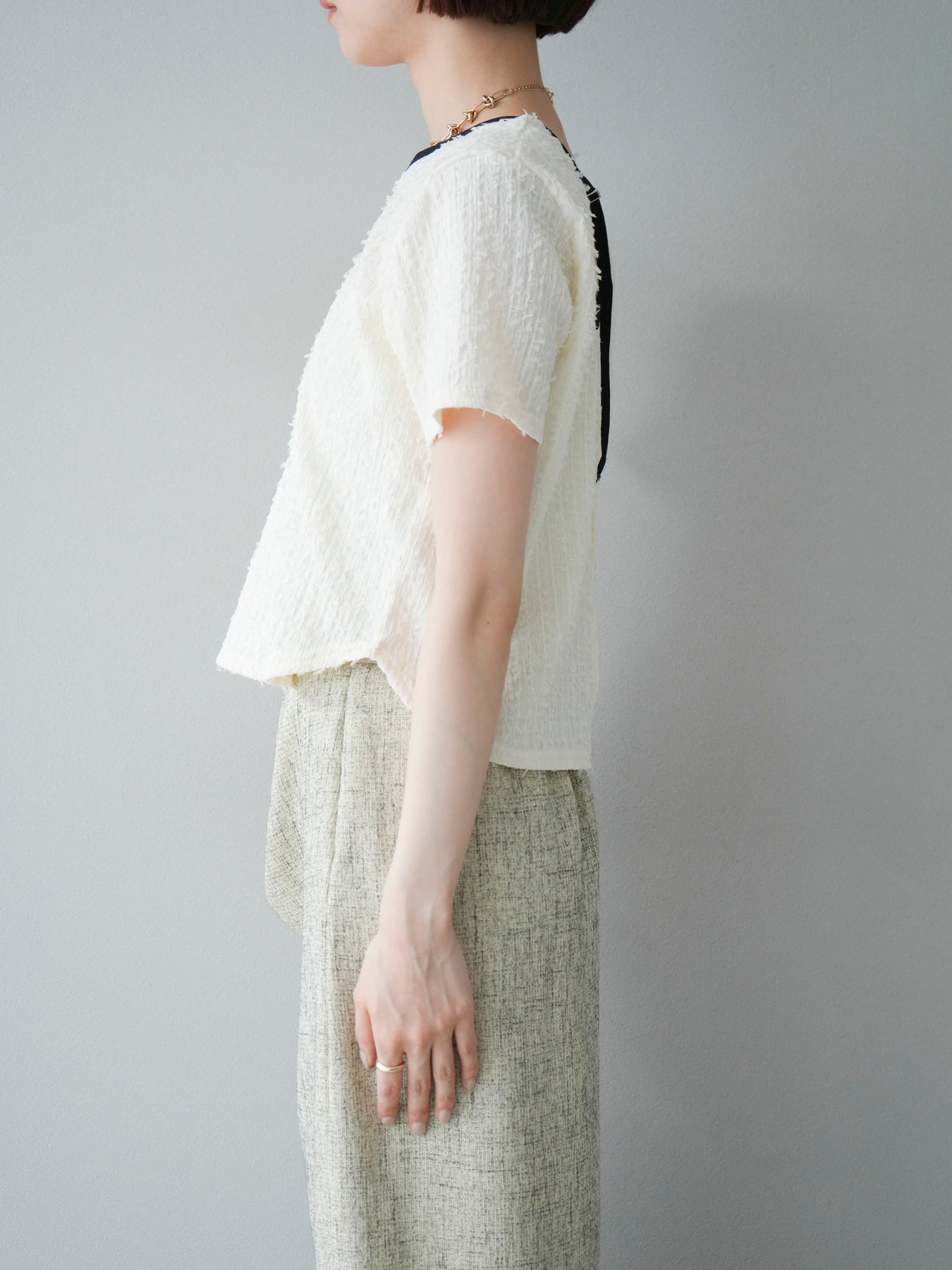 色彩協調的滾邊蓬鬆剪裁上衣,採用富有質感的蓬鬆面料和色彩協調的滾邊。立體感的布料更顯華麗,短款則更顯時尚感。領口和袖口的滾邊帶來適度的緊身感。後背採用水滴形設計,打造出休閒又不失魅力的造型。它適合搭配高腰褲或裙子,是一款適合大人穿著的簡潔上衣。 ※除下裝、吊帶背心(內衣)以外的商品均不含內衣。