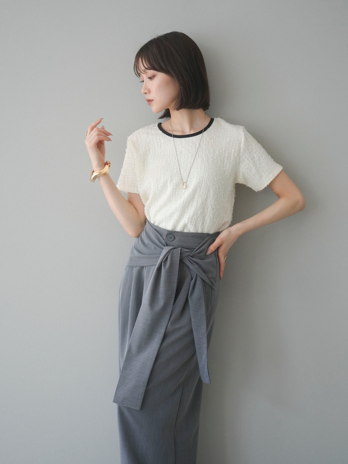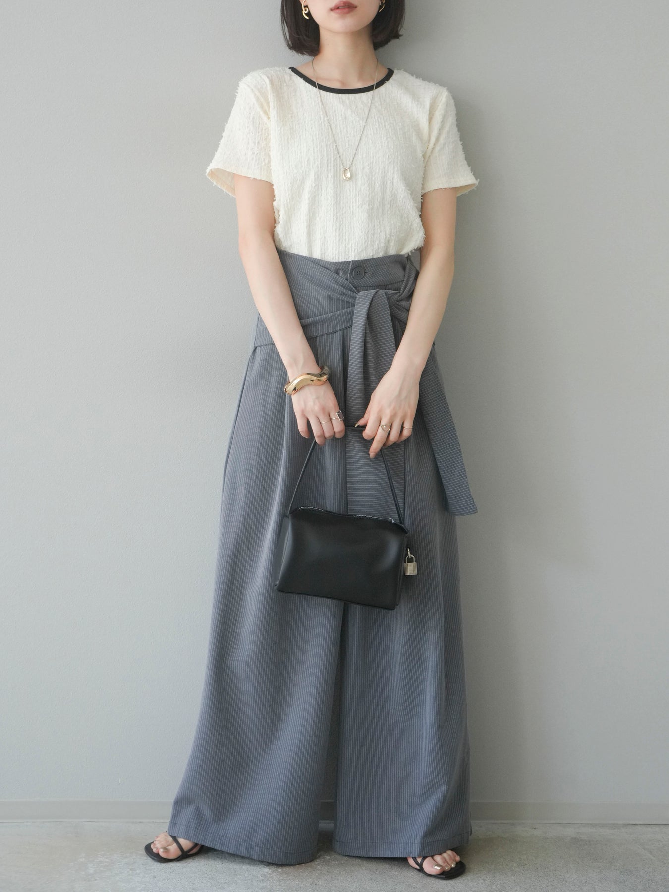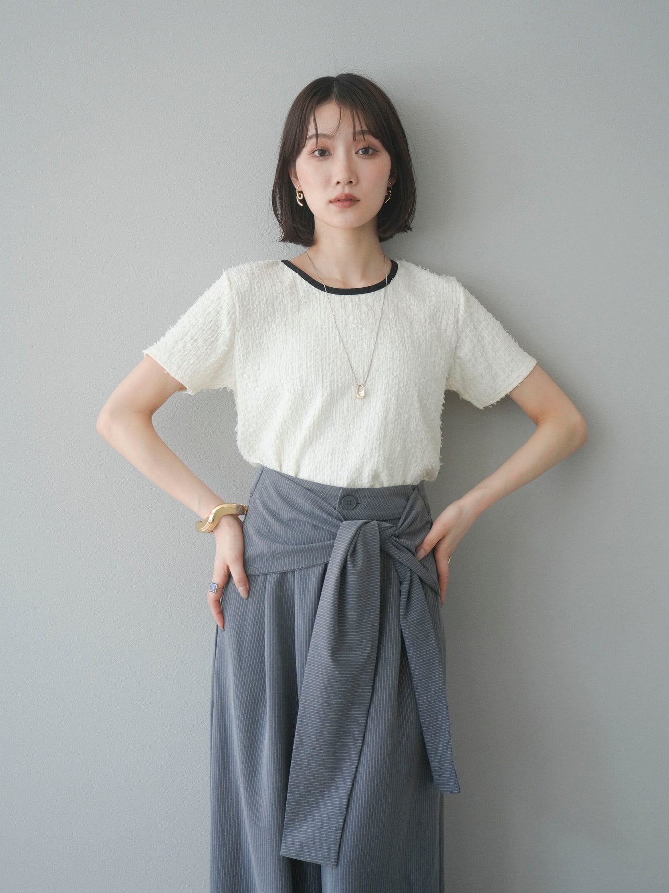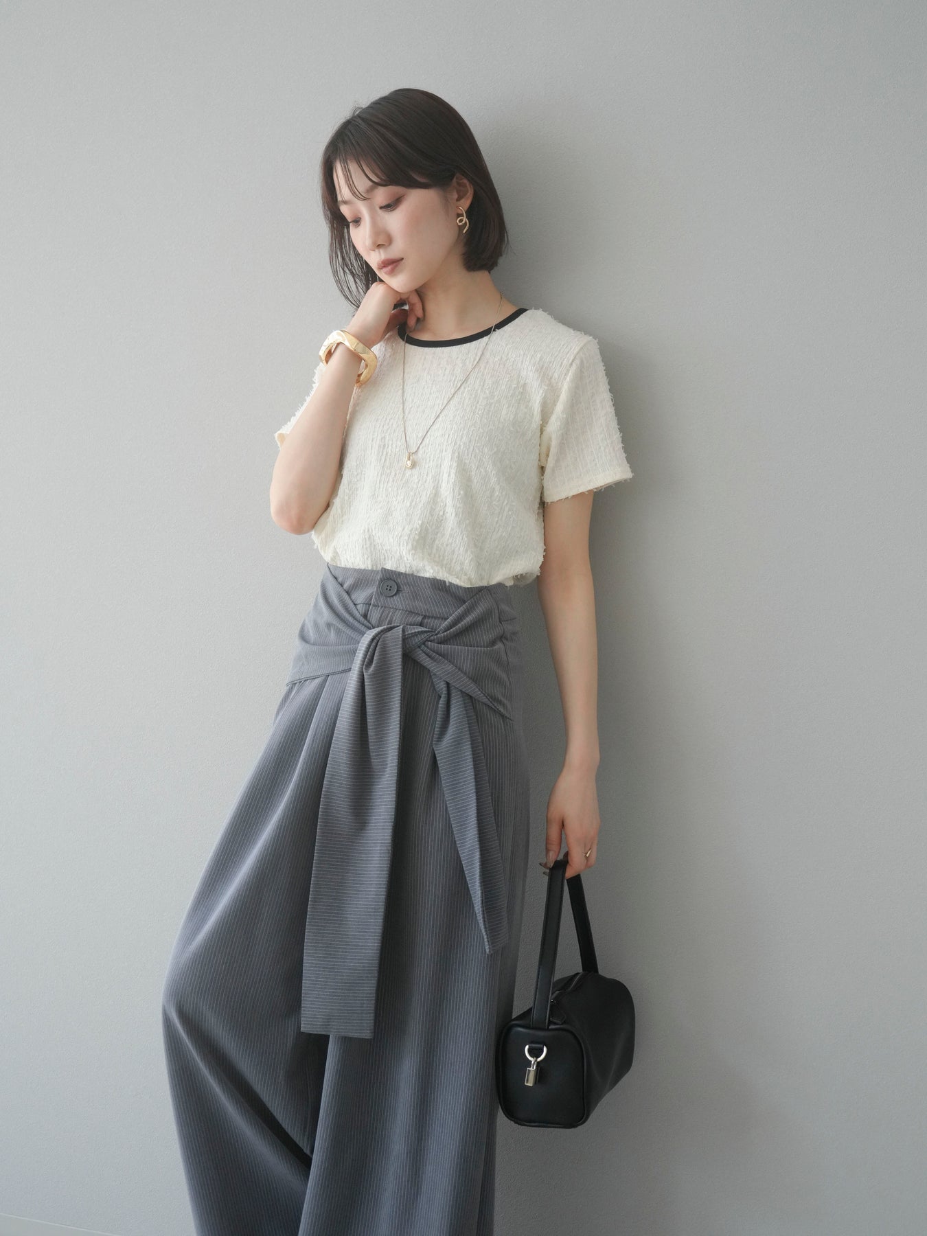 色彩協調的滾邊蓬鬆剪裁上衣,採用富有質感的蓬鬆面料和色彩協調的滾邊。立體感的布料更顯華麗,短款則更顯時尚感。領口和袖口的滾邊帶來適度的緊身感。後背採用水滴形設計,打造出休閒又不失魅力的造型。它適合搭配高腰褲或裙子,是一款適合大人穿著的簡潔上衣。 ※除下裝、吊帶背心(內衣)以外的商品均不含內衣。