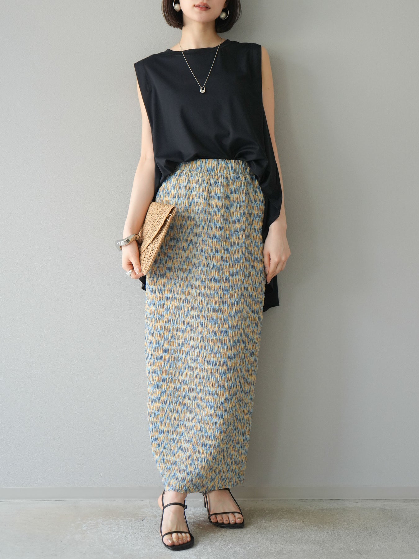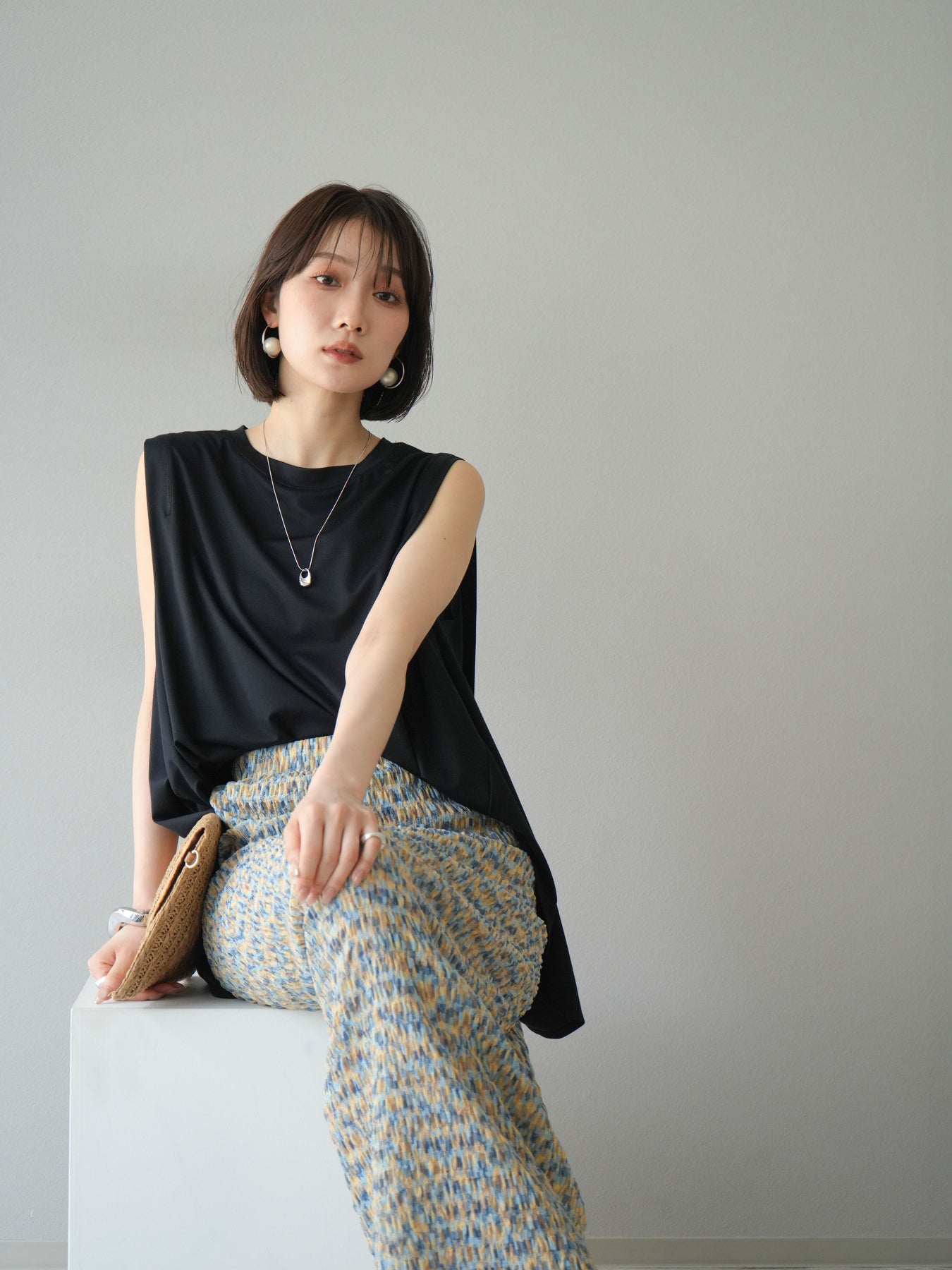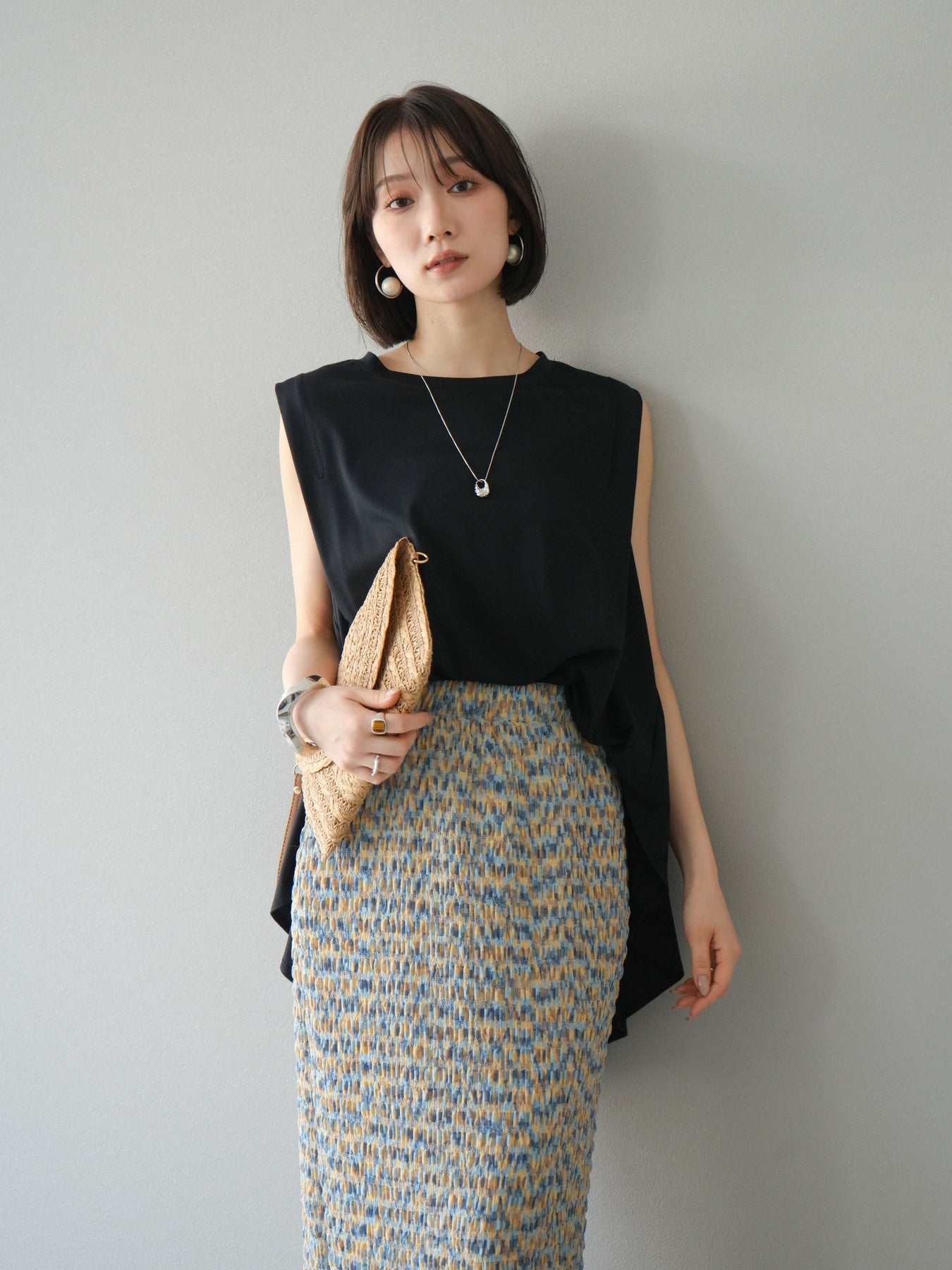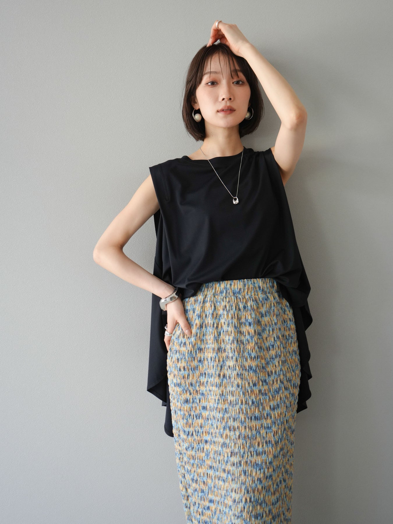 採用觸感清涼的布料製成的喇叭袖套頭衫,帶來清涼的觸感。向後方延伸的喇叭袖廓形,以及褶襉營造出的立體感線條,設計精美,單穿也十分賞心悅目。雖然是無袖設計,但剪裁恰到好處地遮蓋了肩部,營造出優雅的氣質。前後長度的差異有效遮蓋身材,其均衡的剪裁也使其易於搭配褲裝或裙子。從日常穿著到辦公室休閒裝,這款清涼上衣適合各種場合。 ※除下裝、吊帶背心(內衣)以外的商品均不含內衣。