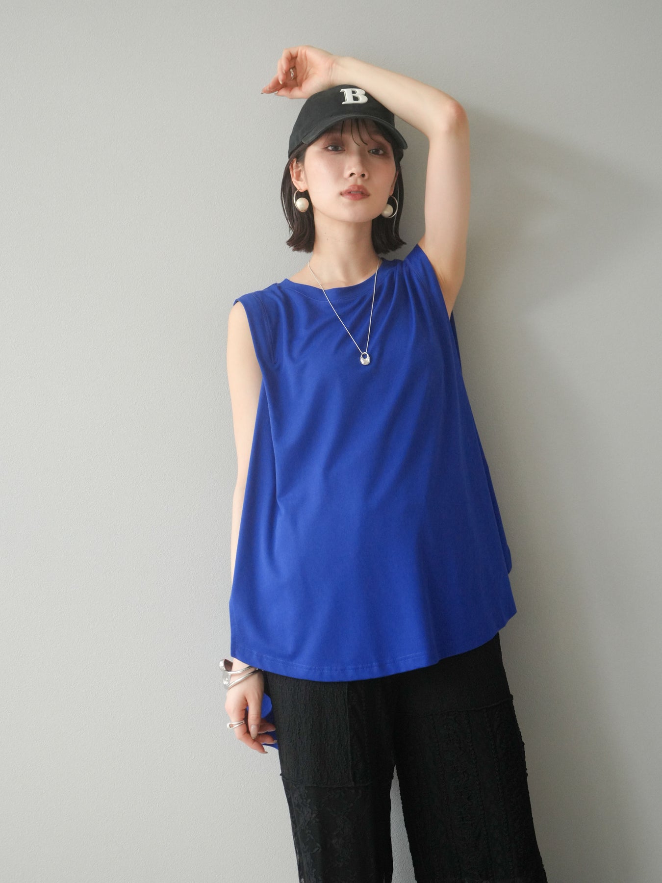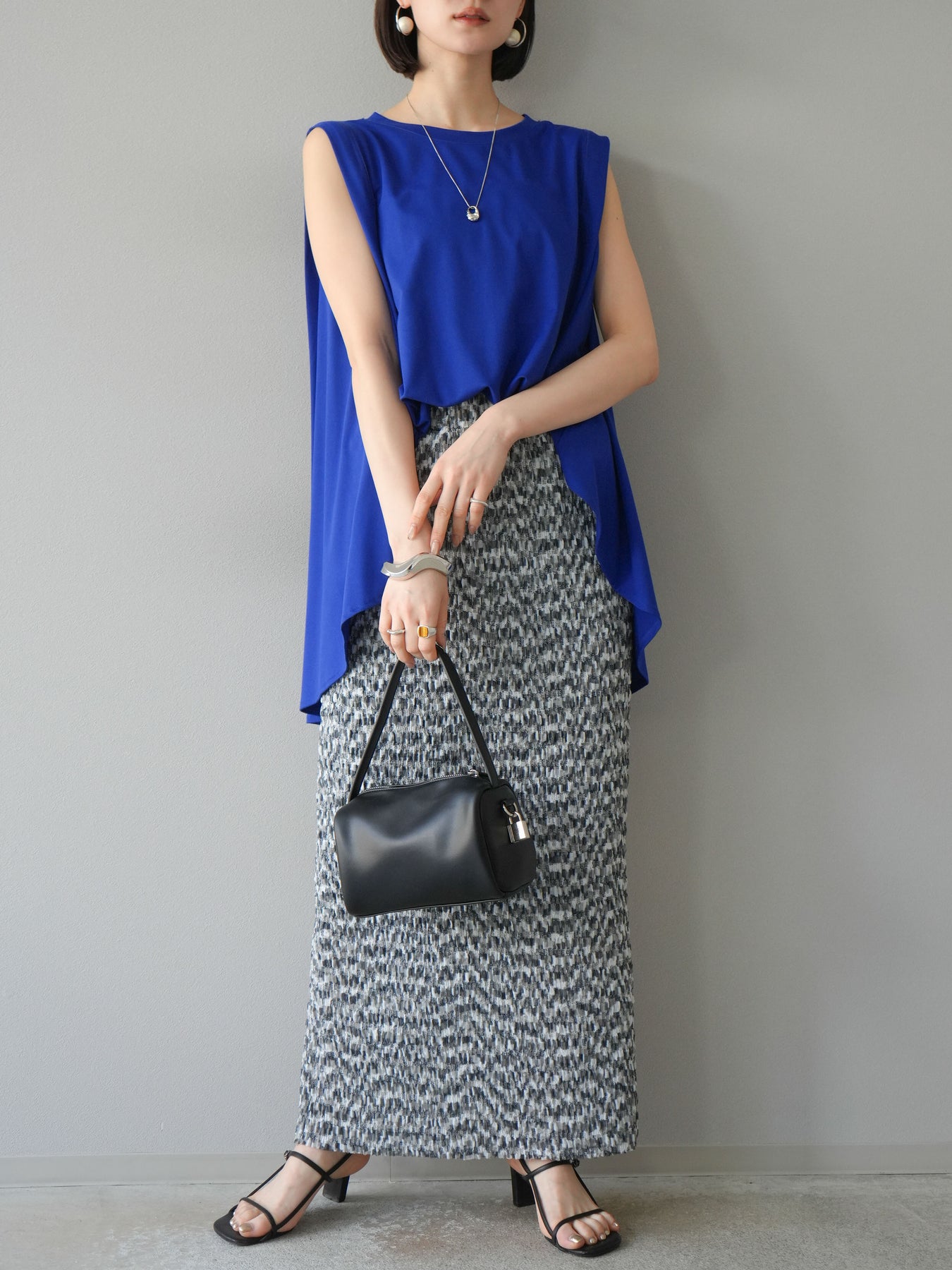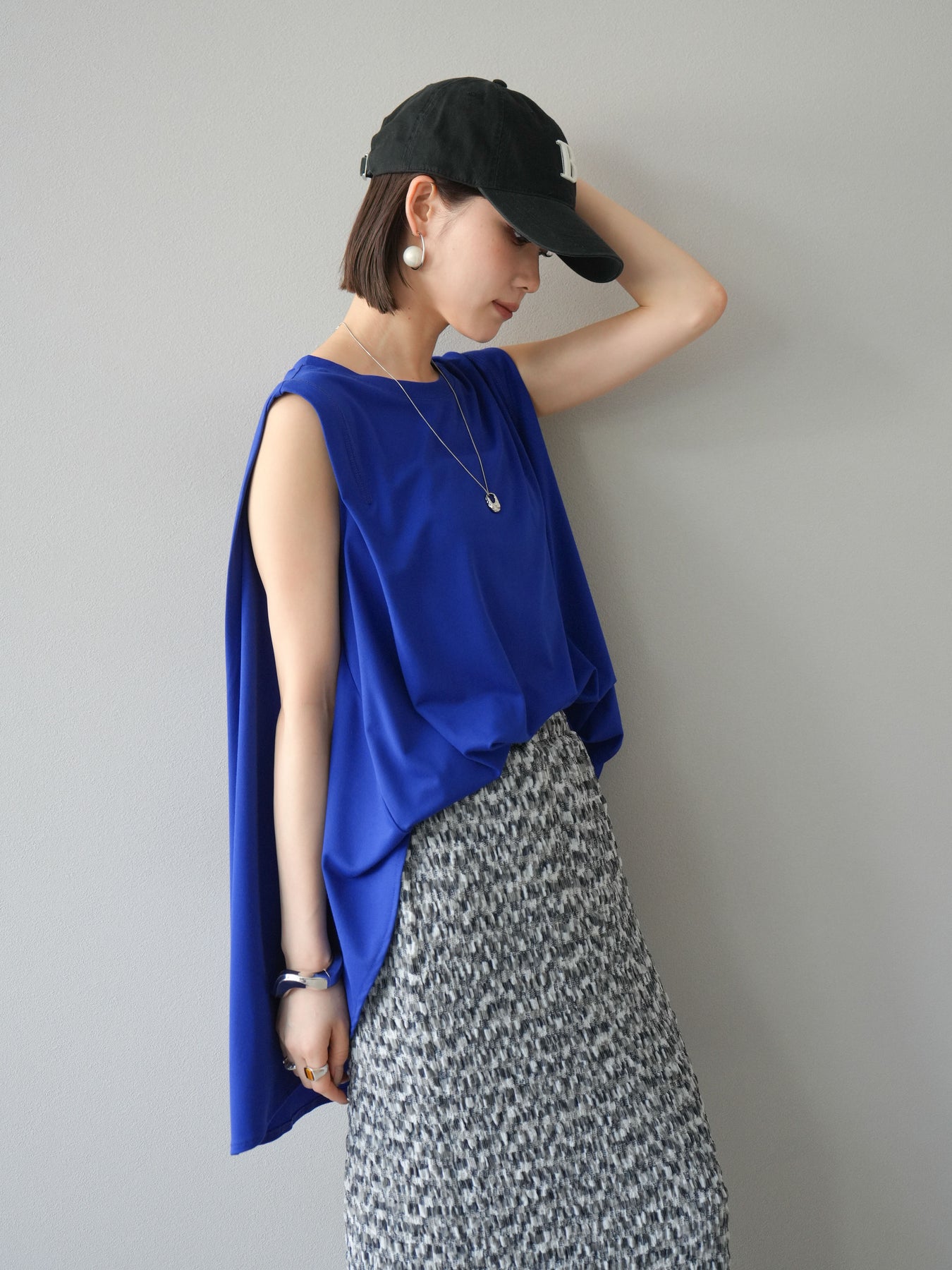 採用觸感清涼的布料製成的喇叭袖套頭衫,帶來清涼的觸感。向後方延伸的喇叭袖廓形,以及褶襉營造出的立體感線條,設計精美,單穿也十分賞心悅目。雖然是無袖設計,但剪裁恰到好處地遮蓋了肩部,營造出優雅的氣質。前後長度的差異有效遮蓋身材,其均衡的剪裁也使其易於搭配褲裝或裙子。從日常穿著到辦公室休閒裝,這款清涼上衣適合各種場合。 ※除下裝、吊帶背心(內衣)以外的商品均不含內衣。