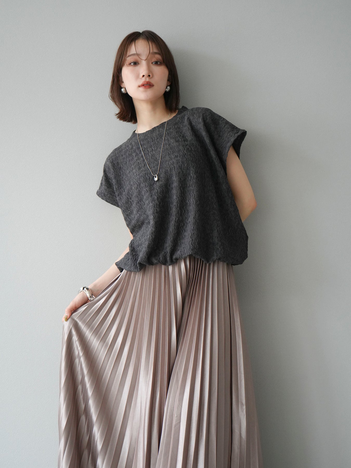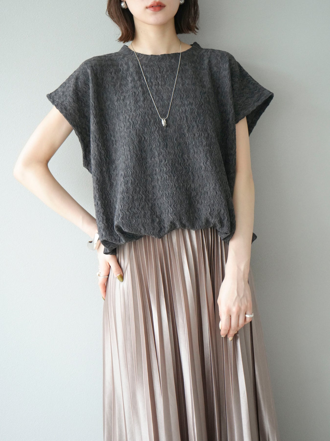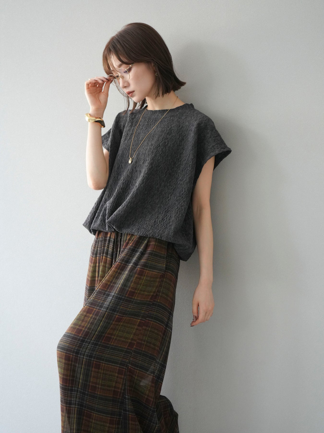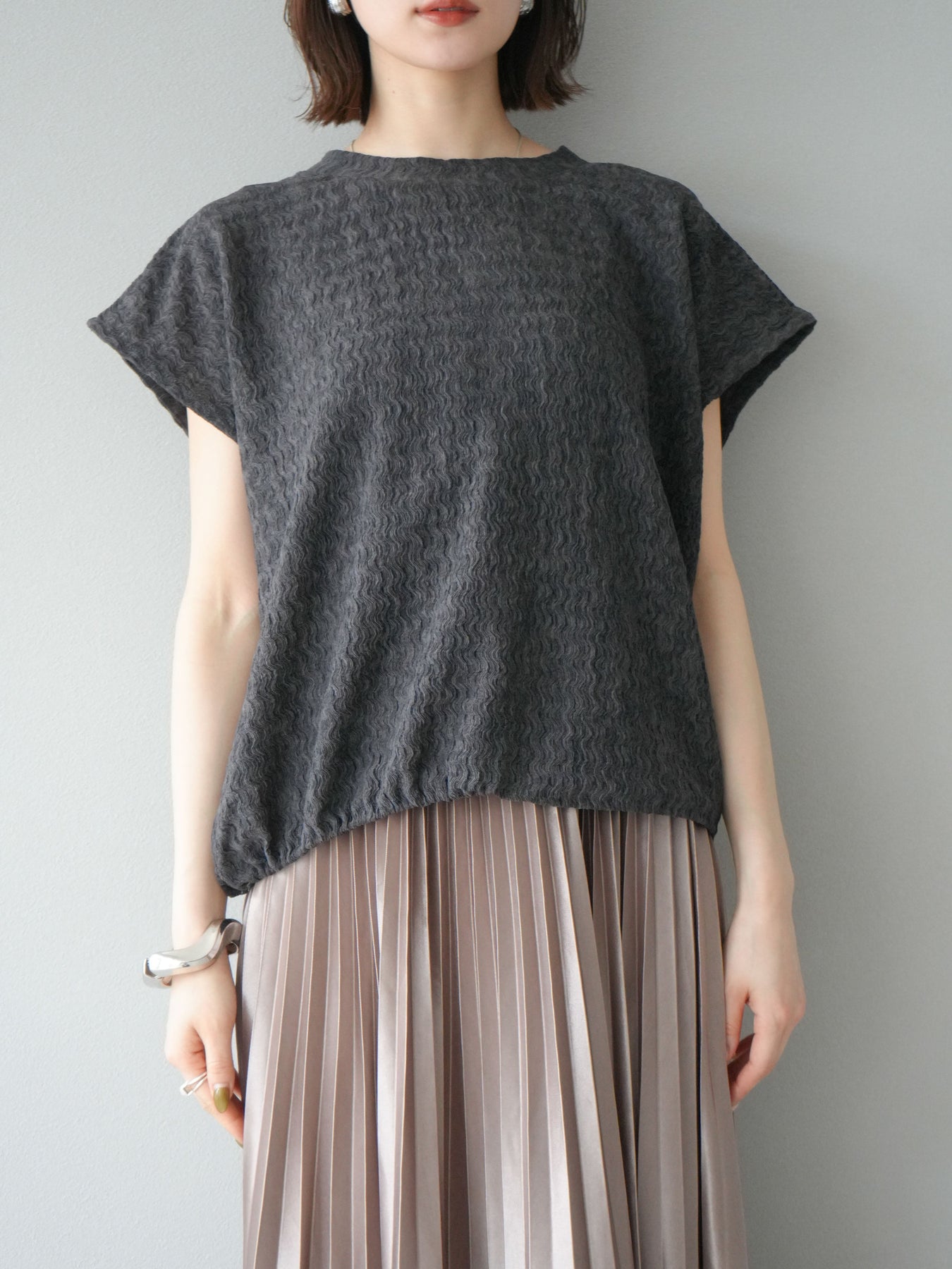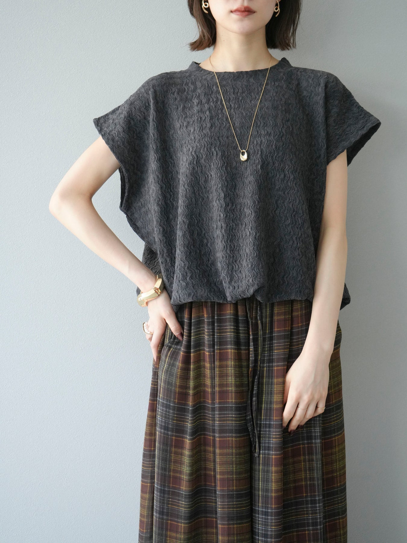 這款套頭衫採用波浪紋提花布料製成,表面帶有紋理,簡約卻又引人注目。下擺配有抽繩,方便變換輪廓。寬鬆的尺寸和法式袖子營造出輕鬆的造型,既休閒又優雅。它既像T卹一樣易於搭配,又能為您的穿搭增添獨特的魅力。 它可以輕鬆搭配褲子和裙子,使其成為可以在工作和休閒時穿著的多功能單品。 ※除下裝、吊帶背心(內衣)以外的商品均不含內衣。