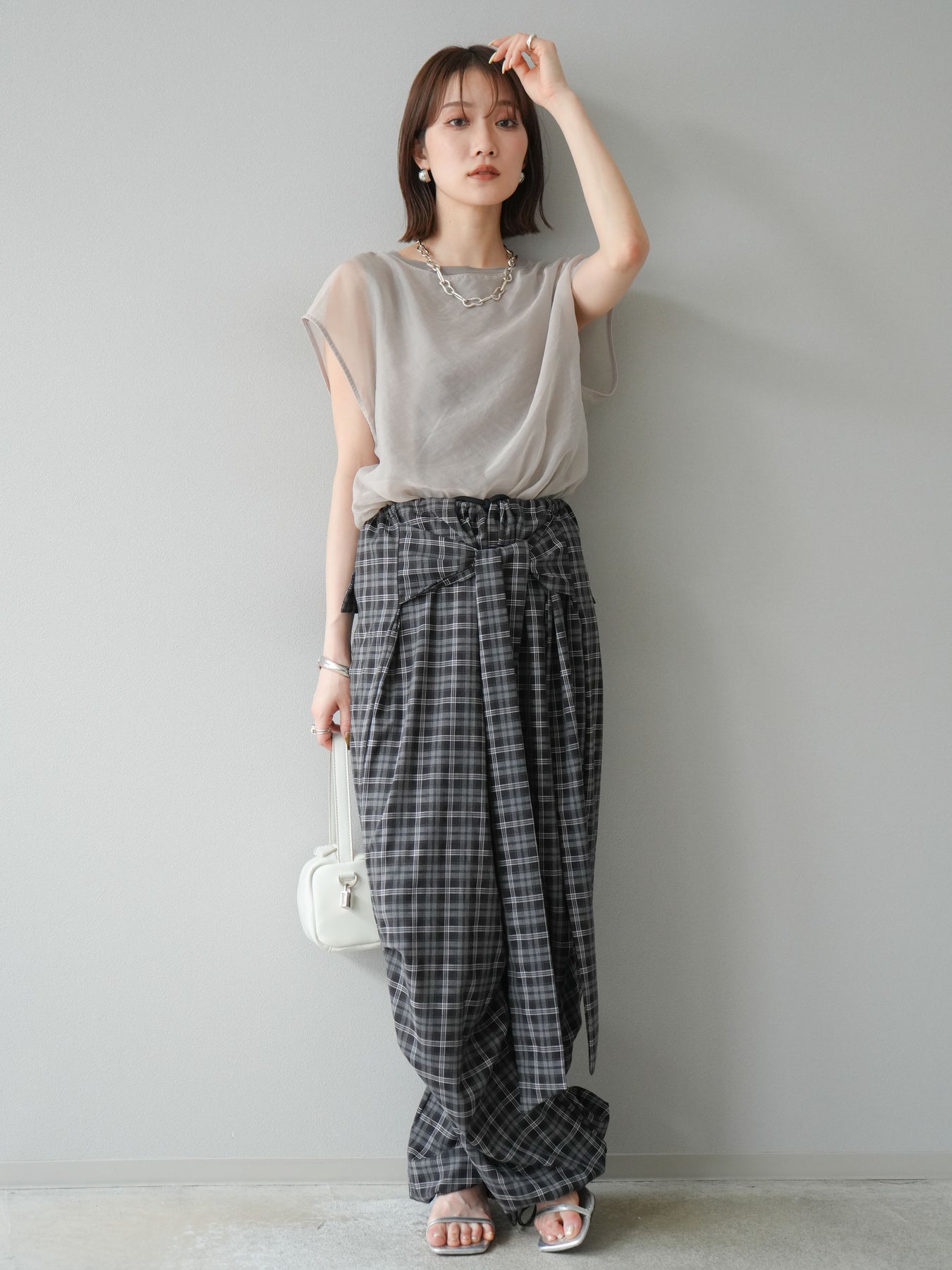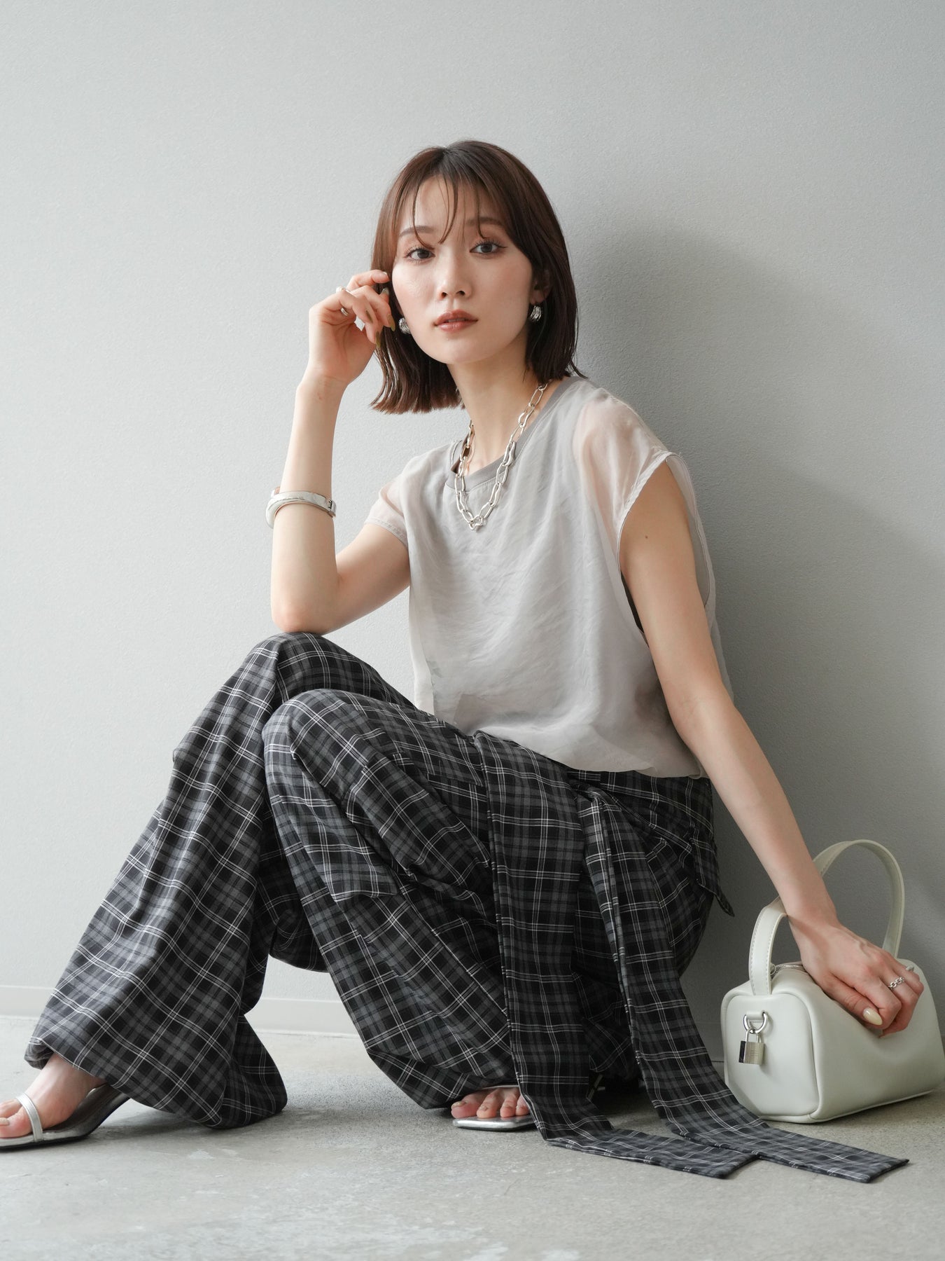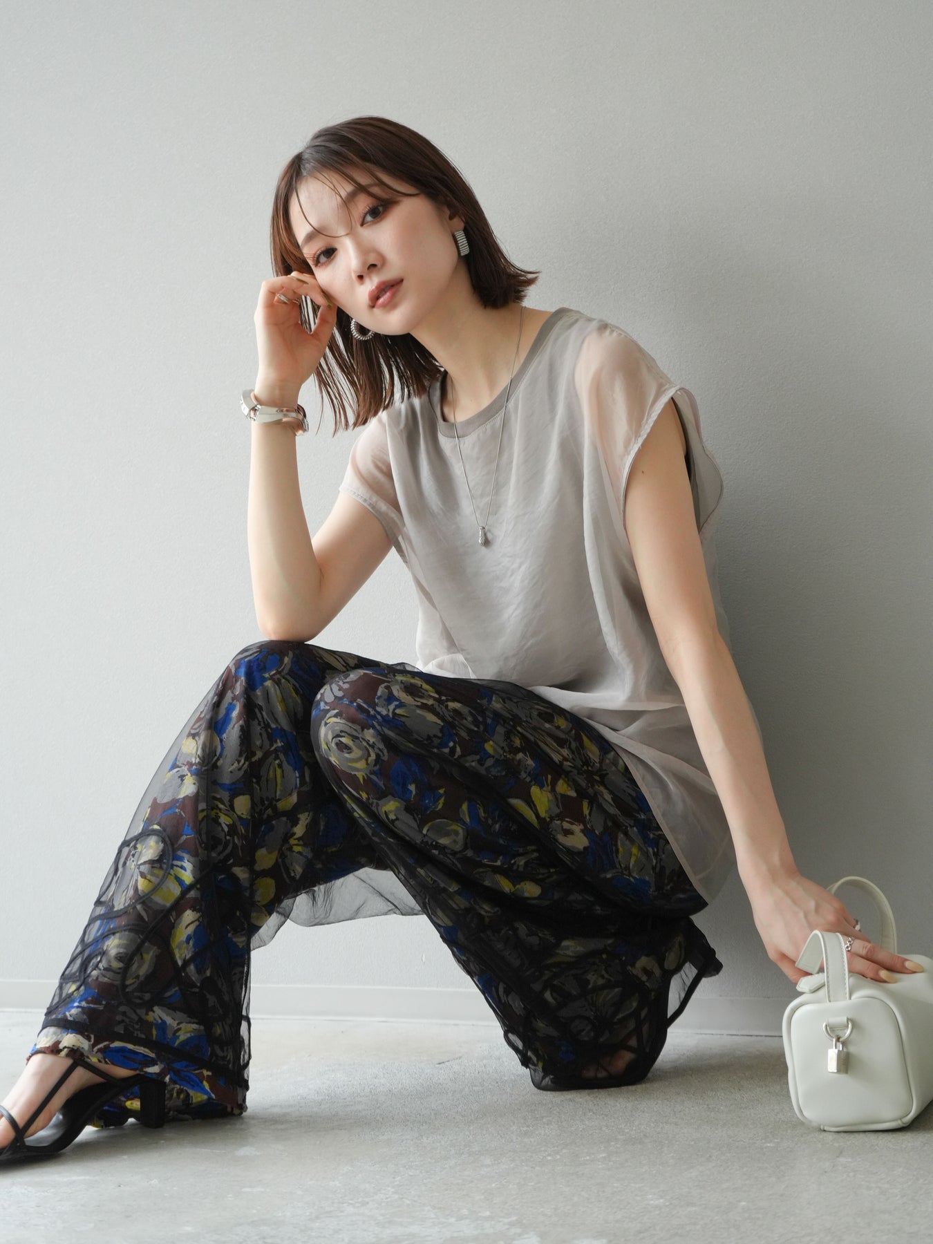 軽やかで透け感のあるシアー素材を重ねた、抜け感たっぷりのレイヤードトップス。程よくゆとりのあるシルエットで体のラインを拾わず、さらっと着るだけでこなれた印象に仕上がります。カットソー素材のインナー付きで、透け感を楽しみながらも安心して着用できるのも嬉しいポイント。デニムやスラックスなど、幅広いボトムスと好相性で、カジュアルにもモードにもマッチする万能アイテムです。 ※ボトムス、キャミソール(インナー)以外の商品は一律でインナーは付属していません。
