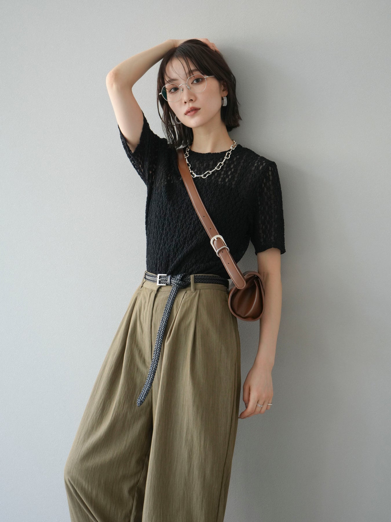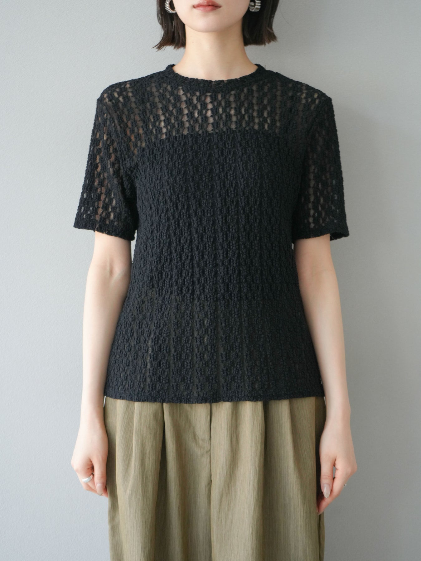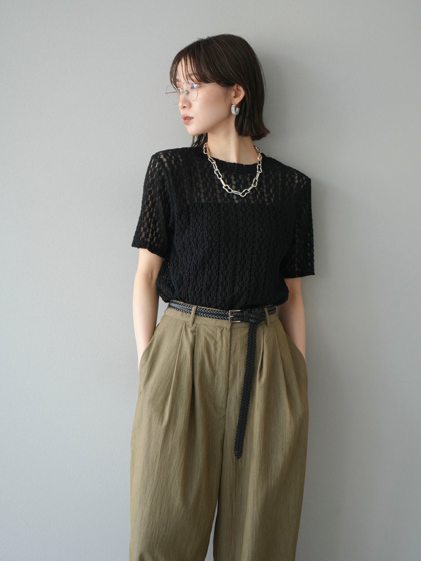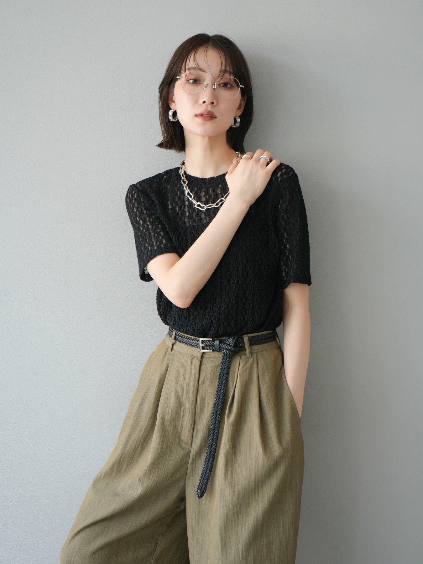 這款蕾絲T卹採用精緻的蕾絲布料製成。蕾絲富有表現力,透明度和凹凸感適中,打造簡約又醒目的造型。略微寬鬆的輪廓營造出輕鬆舒適的穿著體驗。這款T卹設計方便與內衣疊穿,不僅適合搭配背心和吊帶背心,也適合搭配洋裝和連身衣。它能為您的夏季穿搭增添輕盈感和層次感。 ※除下裝、吊帶背心(內衣)以外的商品均不含內衣。