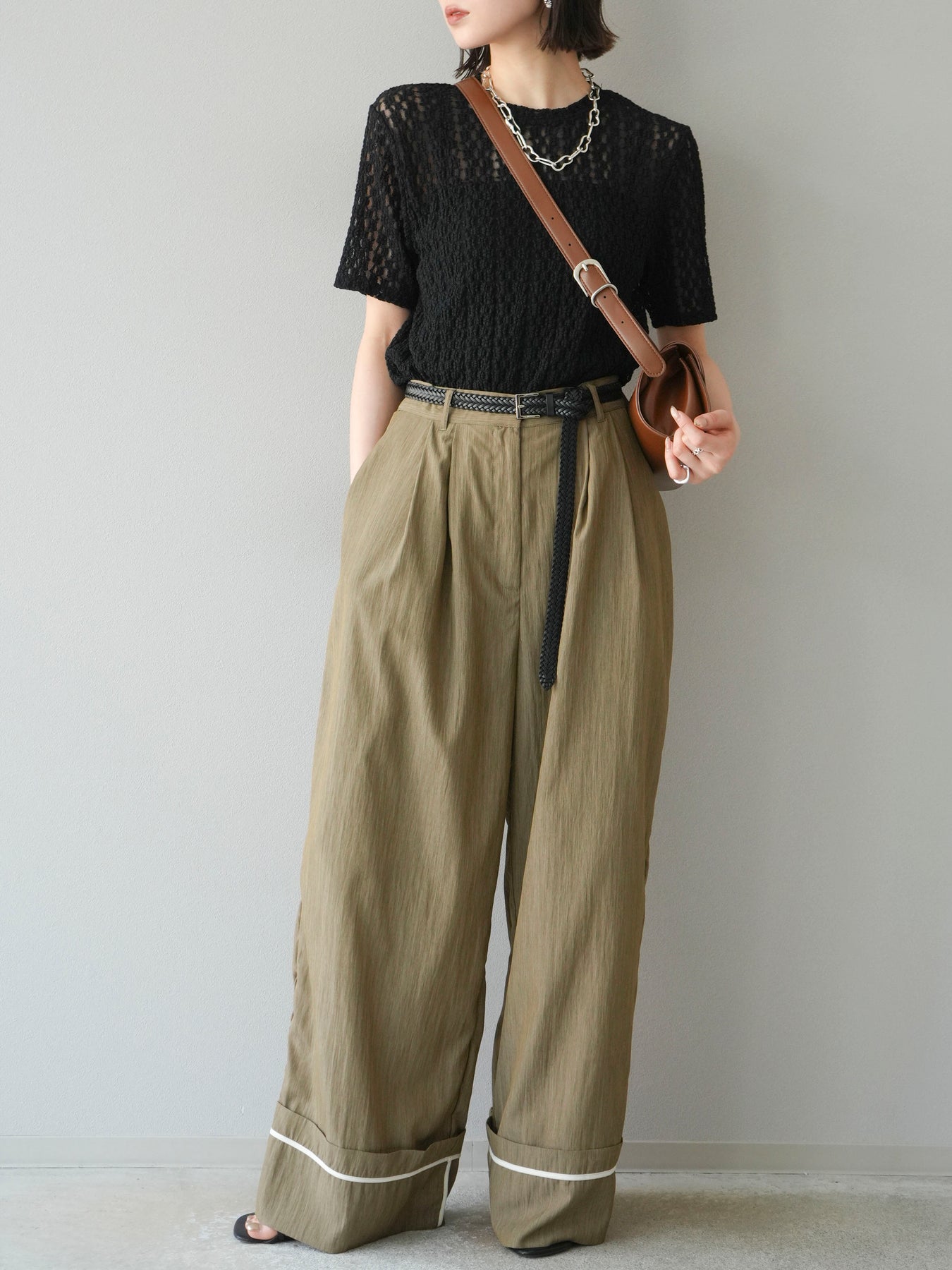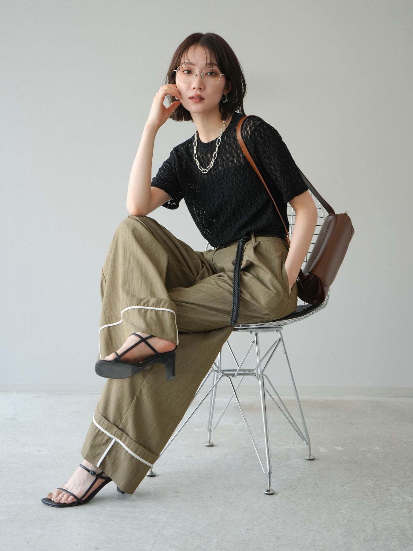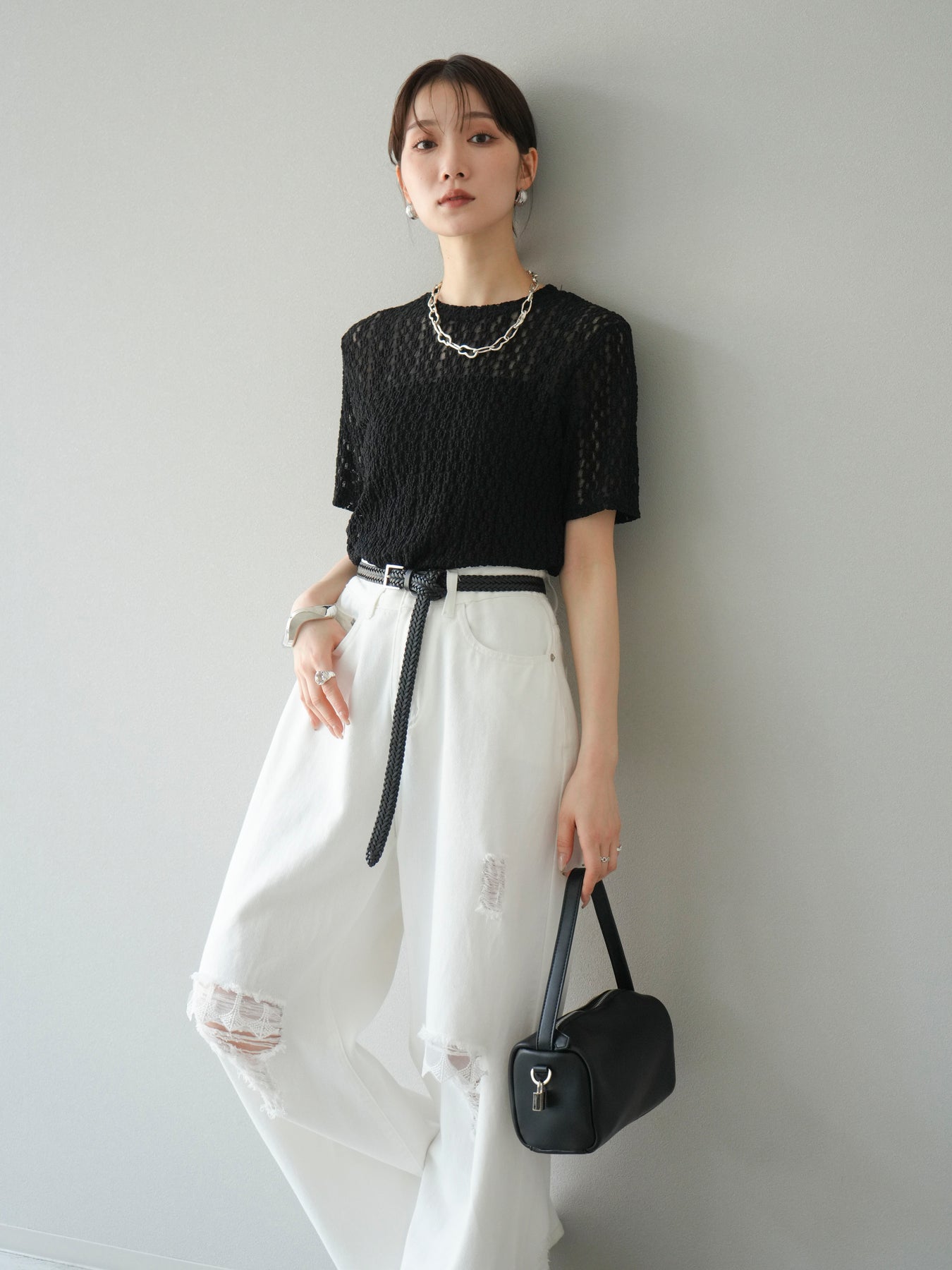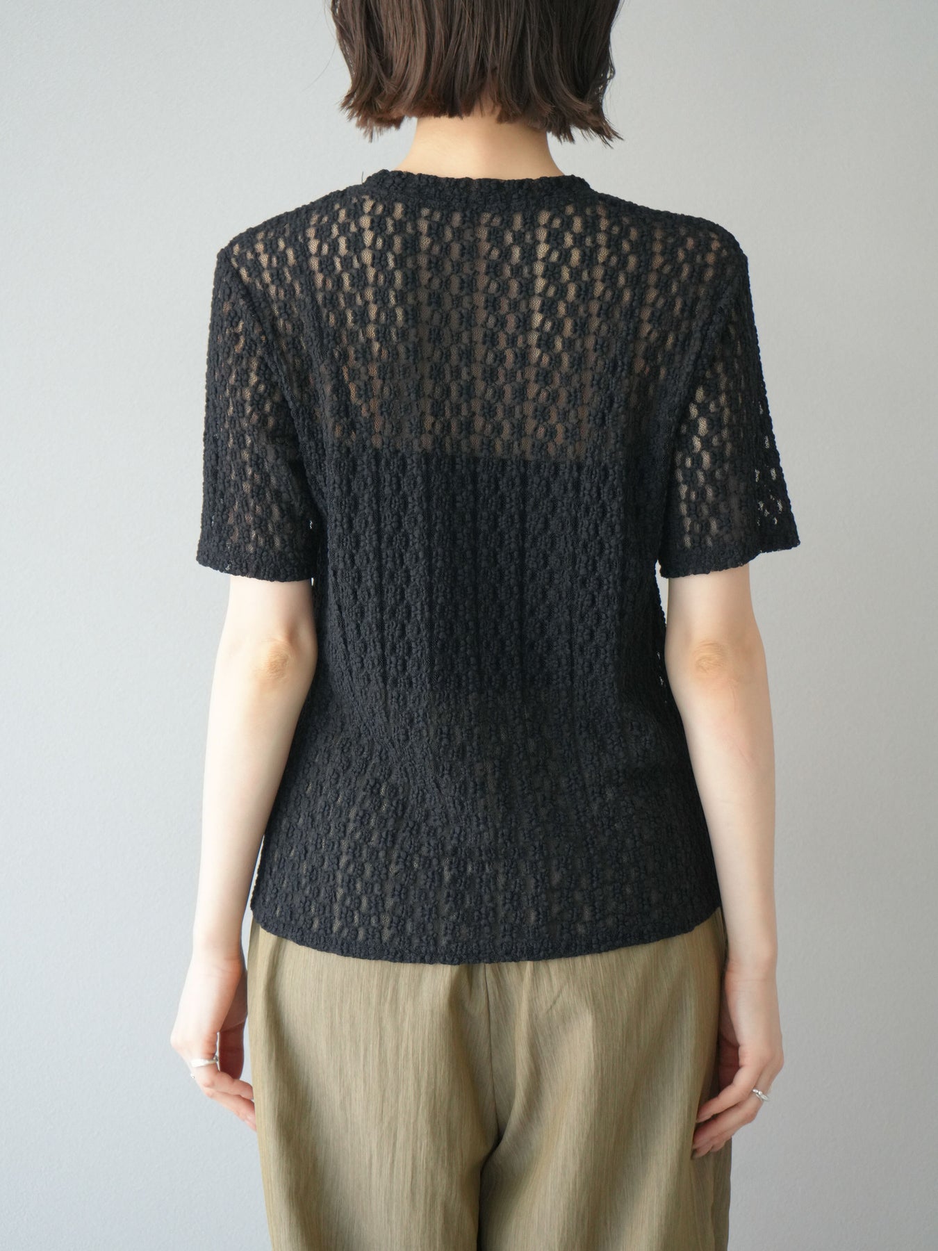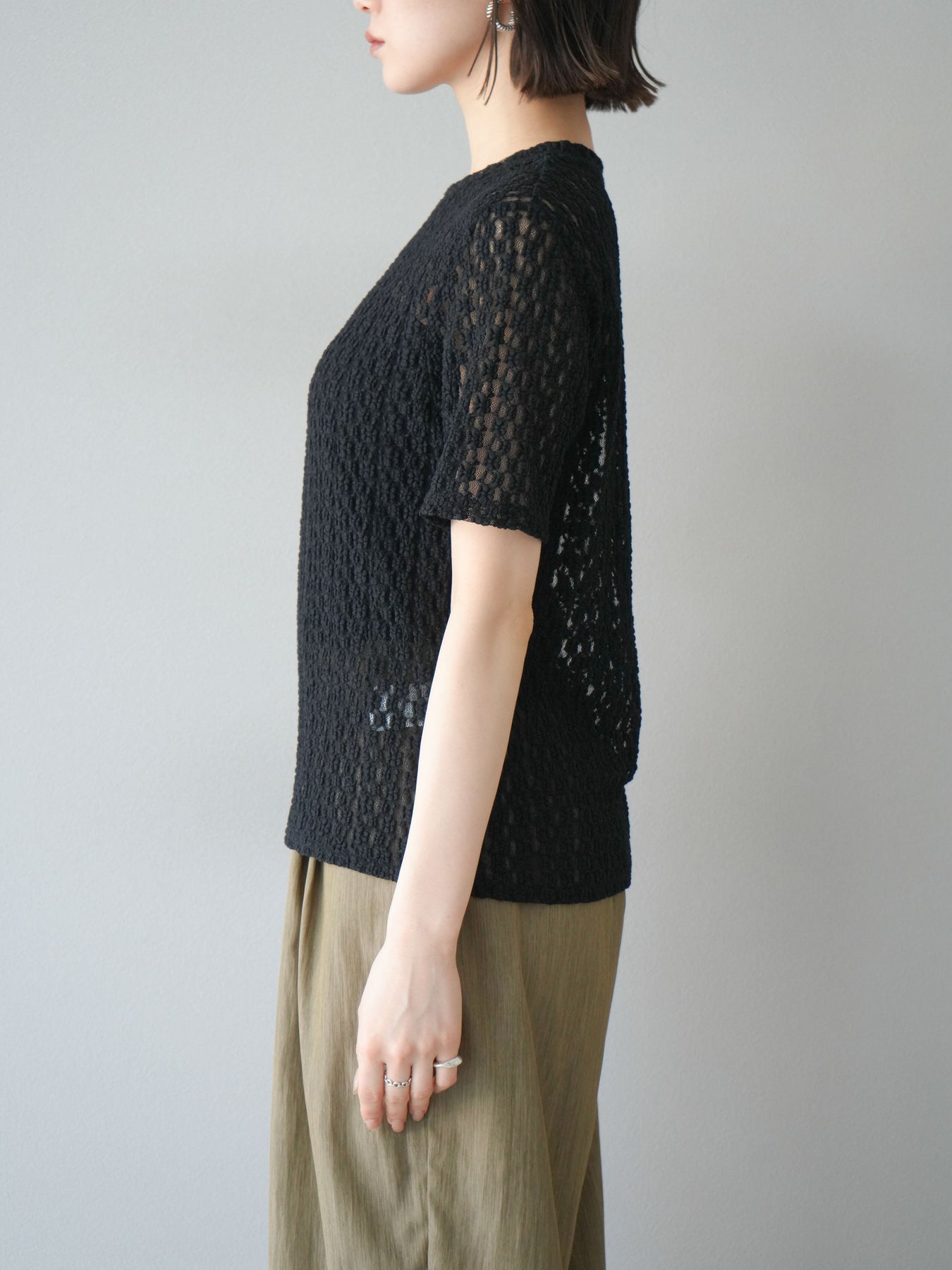 這款蕾絲T卹採用精緻的蕾絲布料製成。蕾絲富有表現力,透明度和凹凸感適中,打造簡約又醒目的造型。略微寬鬆的輪廓營造出輕鬆舒適的穿著體驗。這款T卹設計方便與內衣疊穿,不僅適合搭配背心和吊帶背心,也適合搭配洋裝和連身衣。它能為您的夏季穿搭增添輕盈感和層次感。 ※除下裝、吊帶背心(內衣)以外的商品均不含內衣。