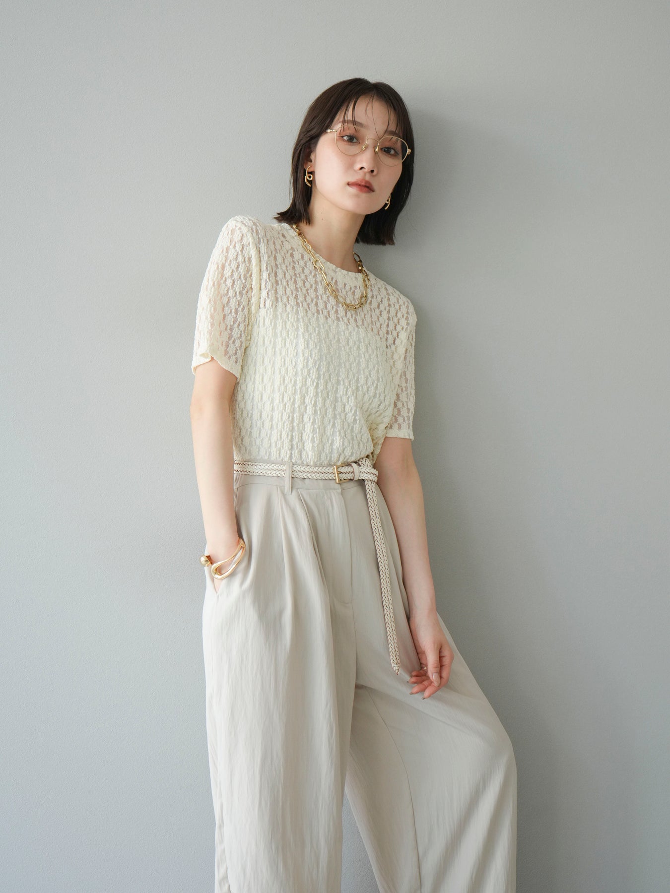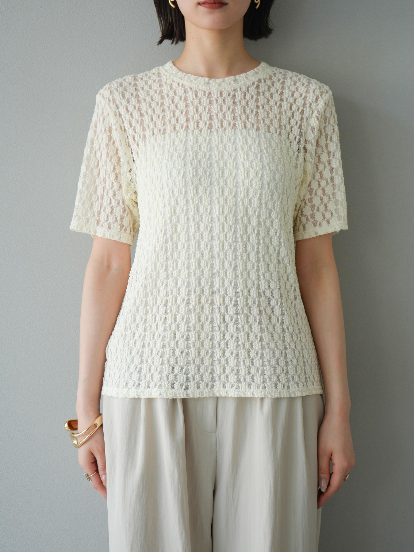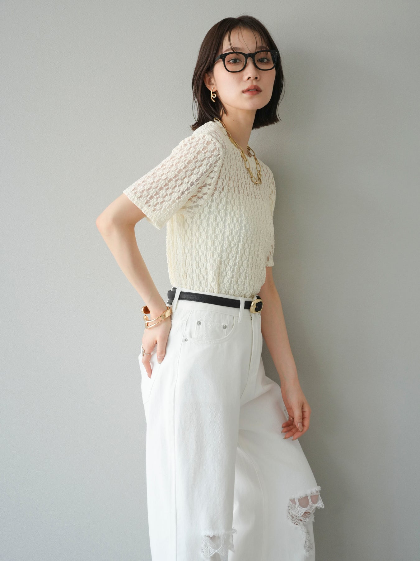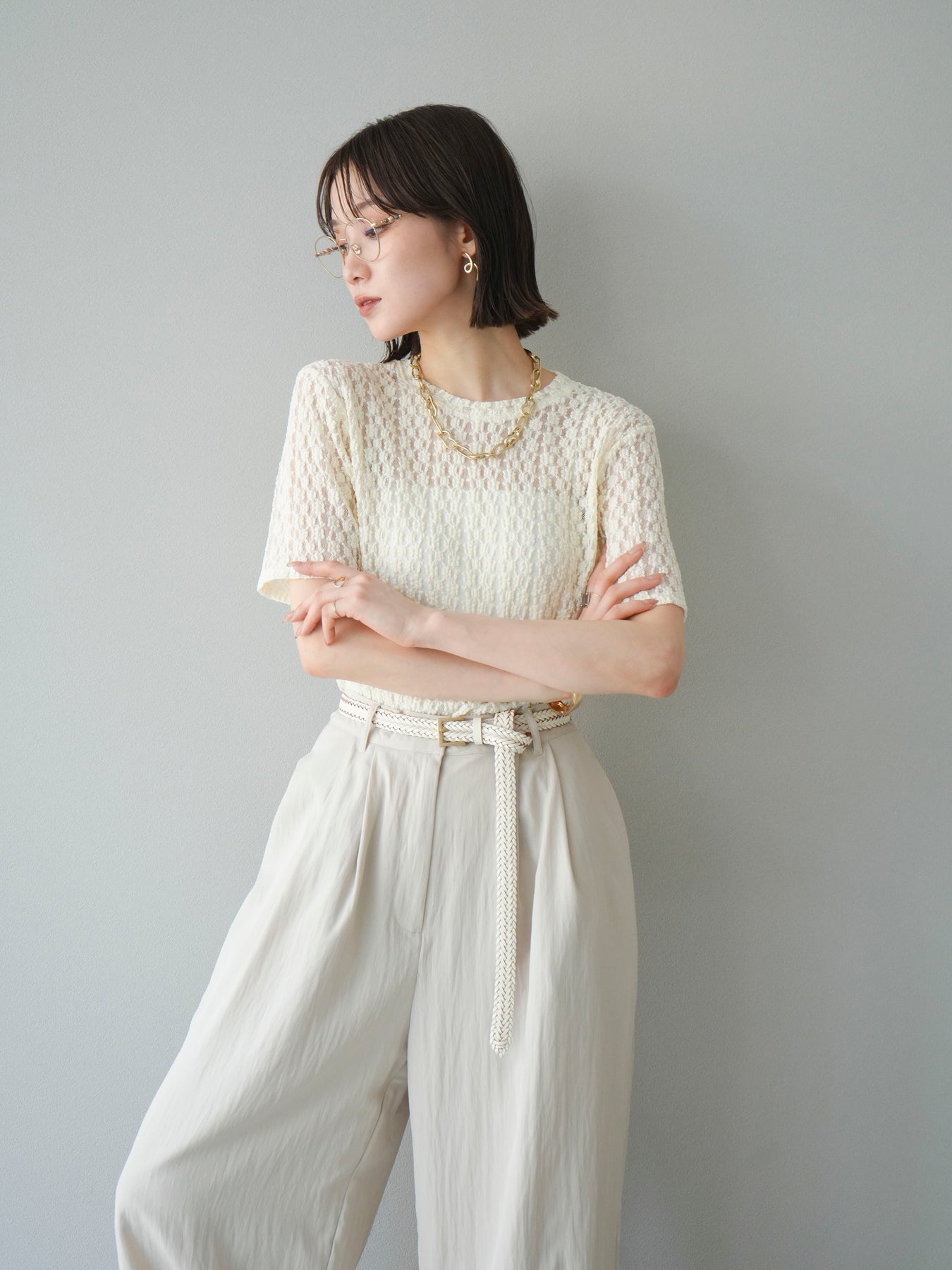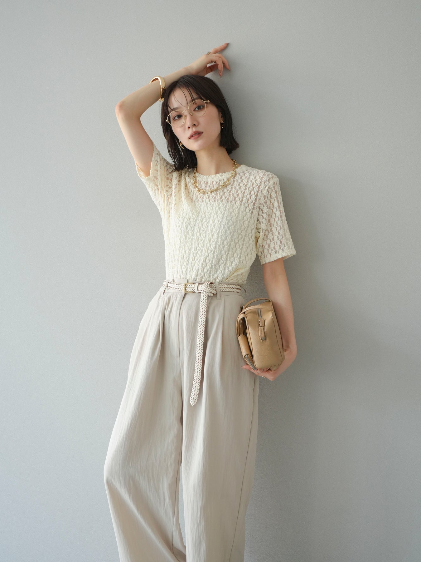 這款蕾絲T卹採用精緻的蕾絲布料製成。蕾絲富有表現力,透明度和凹凸感適中,打造簡約又醒目的造型。略微寬鬆的輪廓營造出輕鬆舒適的穿著體驗。這款T卹設計方便與內衣疊穿,不僅適合搭配背心和吊帶背心,也適合搭配洋裝和連身衣。它能為您的夏季穿搭增添輕盈感和層次感。 ※除下裝、吊帶背心(內衣)以外的商品均不含內衣。