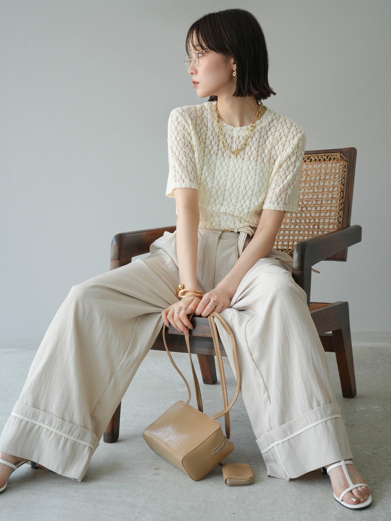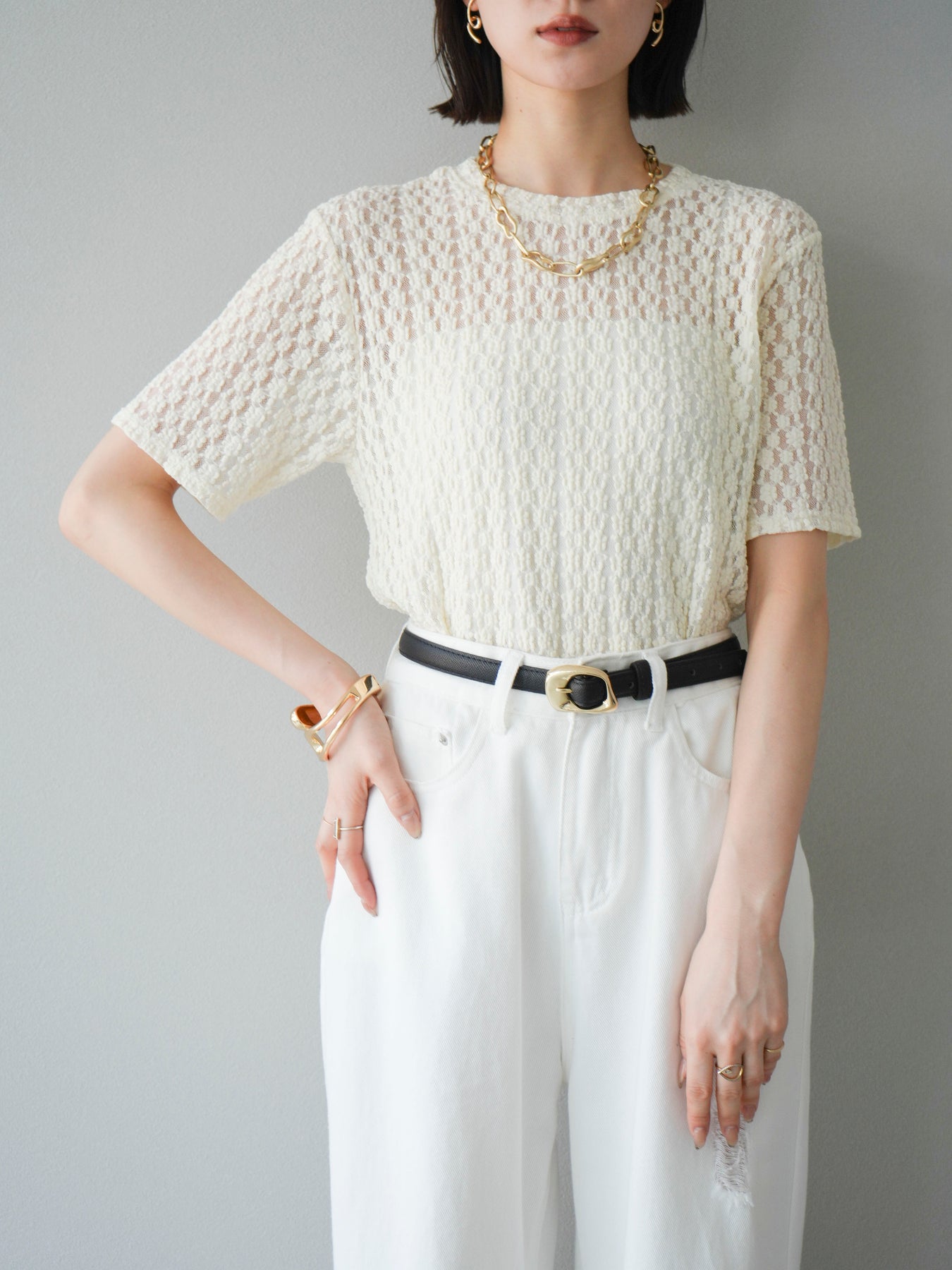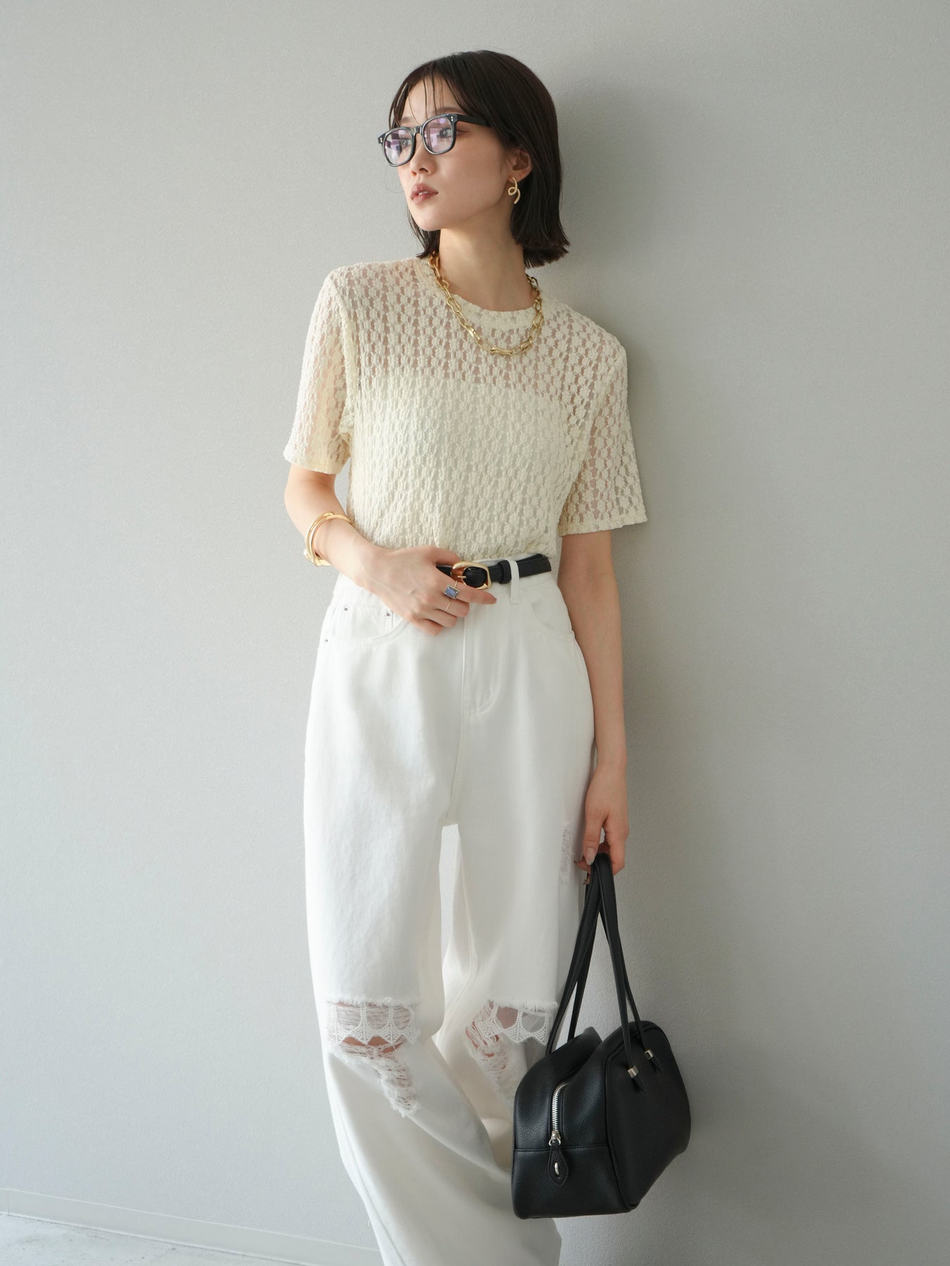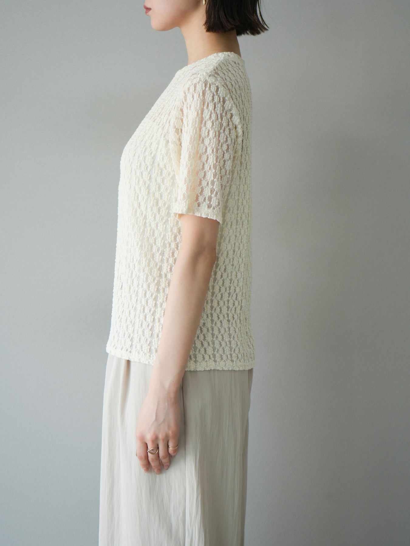 這款蕾絲T卹採用精緻的蕾絲布料製成。蕾絲富有表現力,透明度和凹凸感適中,打造簡約又醒目的造型。略微寬鬆的輪廓營造出輕鬆舒適的穿著體驗。這款T卹設計方便與內衣疊穿,不僅適合搭配背心和吊帶背心,也適合搭配洋裝和連身衣。它能為您的夏季穿搭增添輕盈感和層次感。 ※除下裝、吊帶背心(內衣)以外的商品均不含內衣。