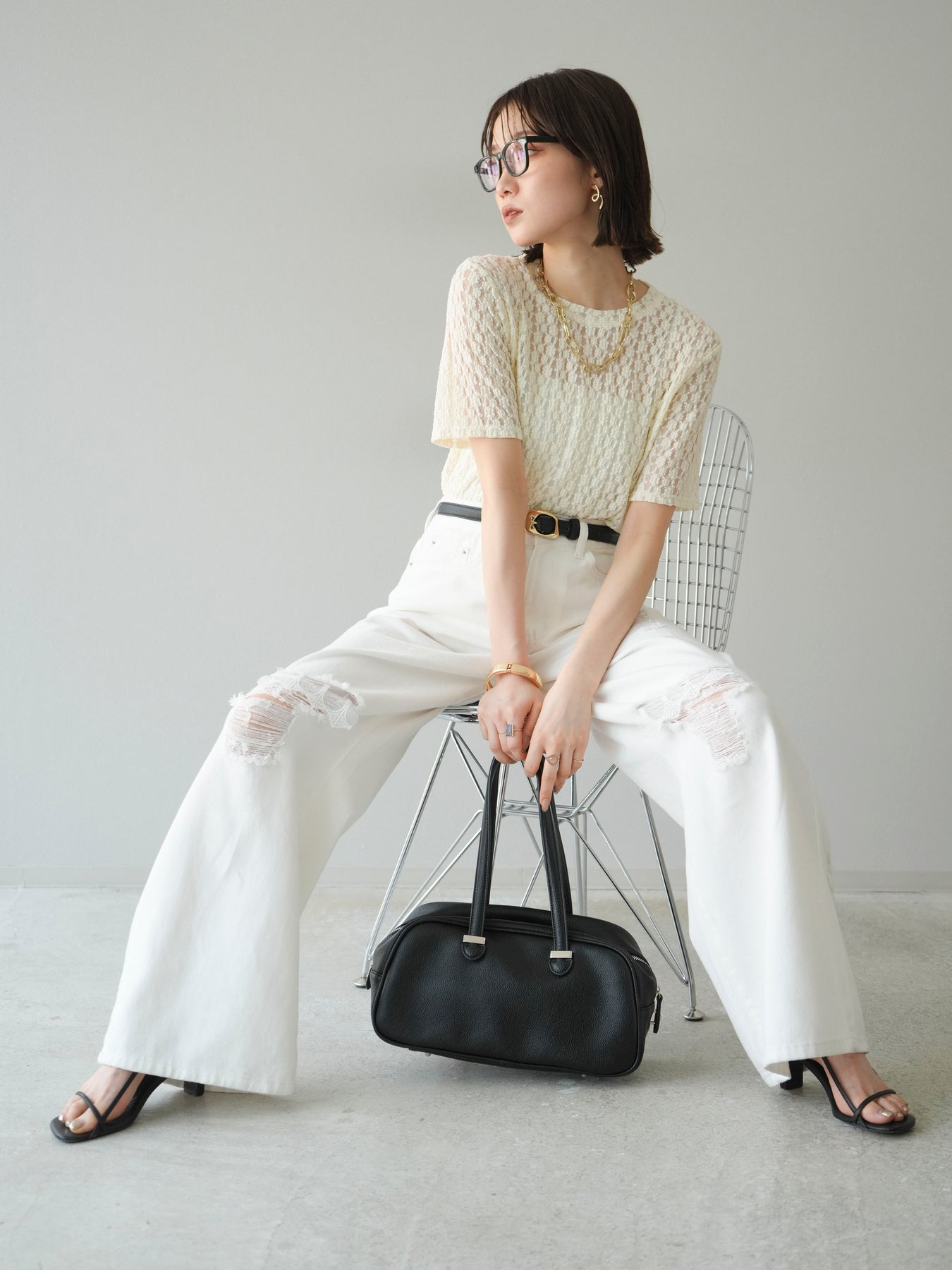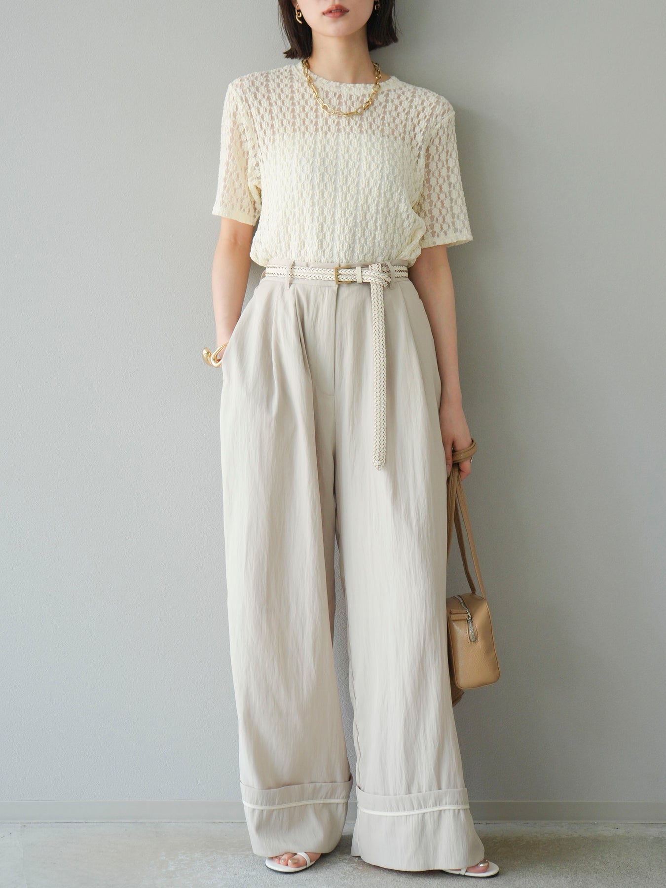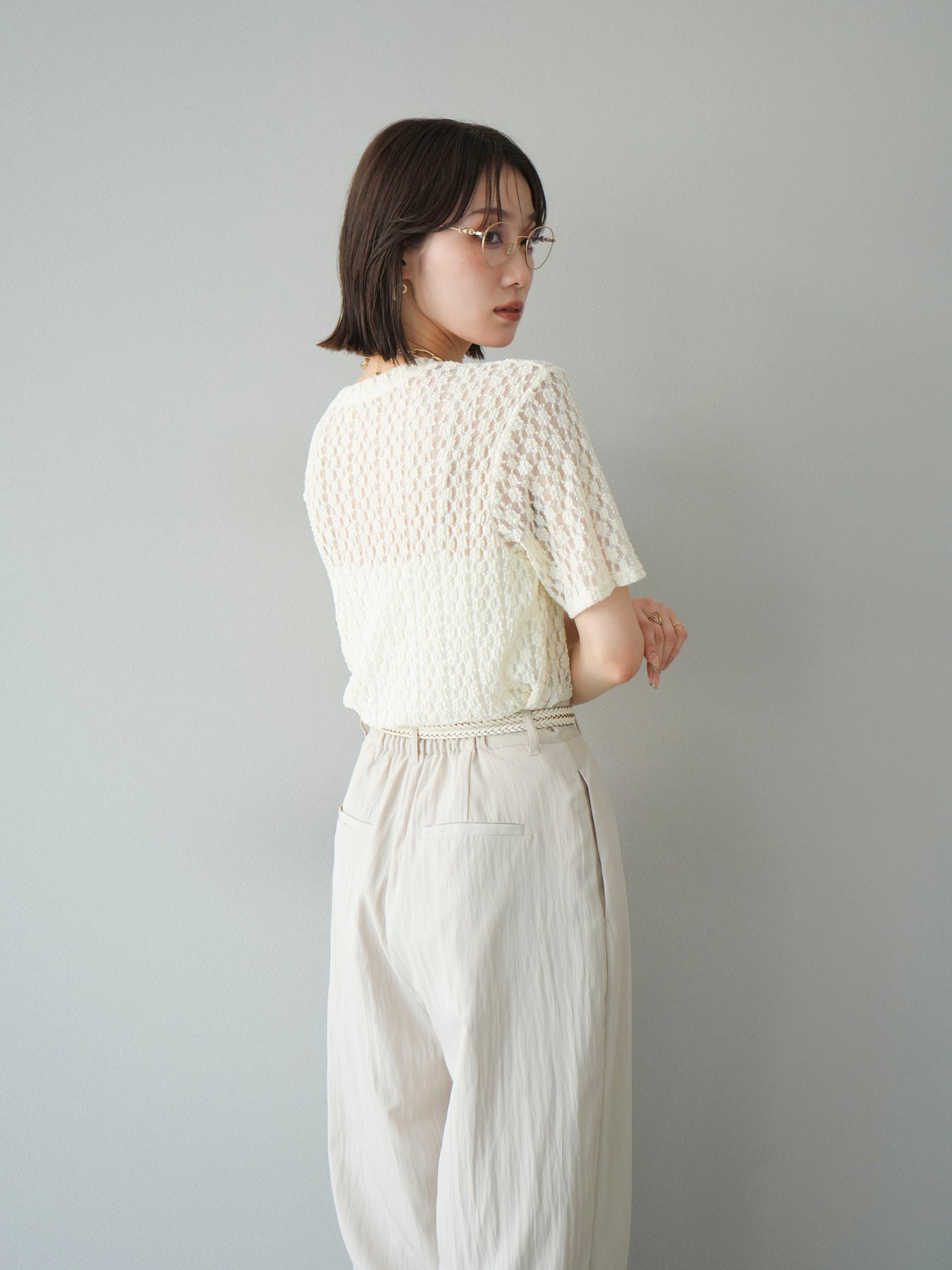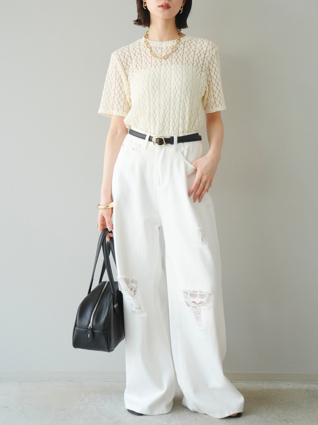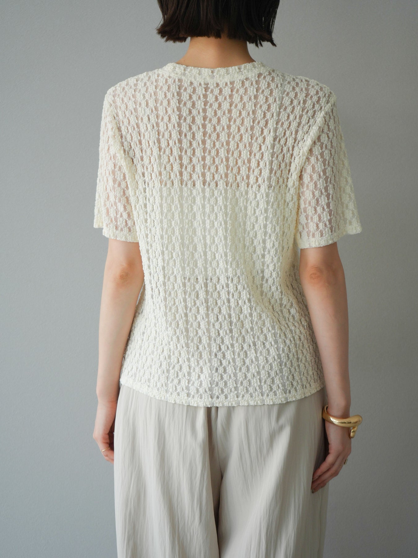 這款蕾絲T卹採用精緻的蕾絲布料製成。蕾絲富有表現力,透明度和凹凸感適中,打造簡約又醒目的造型。略微寬鬆的輪廓營造出輕鬆舒適的穿著體驗。這款T卹設計方便與內衣疊穿,不僅適合搭配背心和吊帶背心,也適合搭配洋裝和連身衣。它能為您的夏季穿搭增添輕盈感和層次感。 ※除下裝、吊帶背心(內衣)以外的商品均不含內衣。