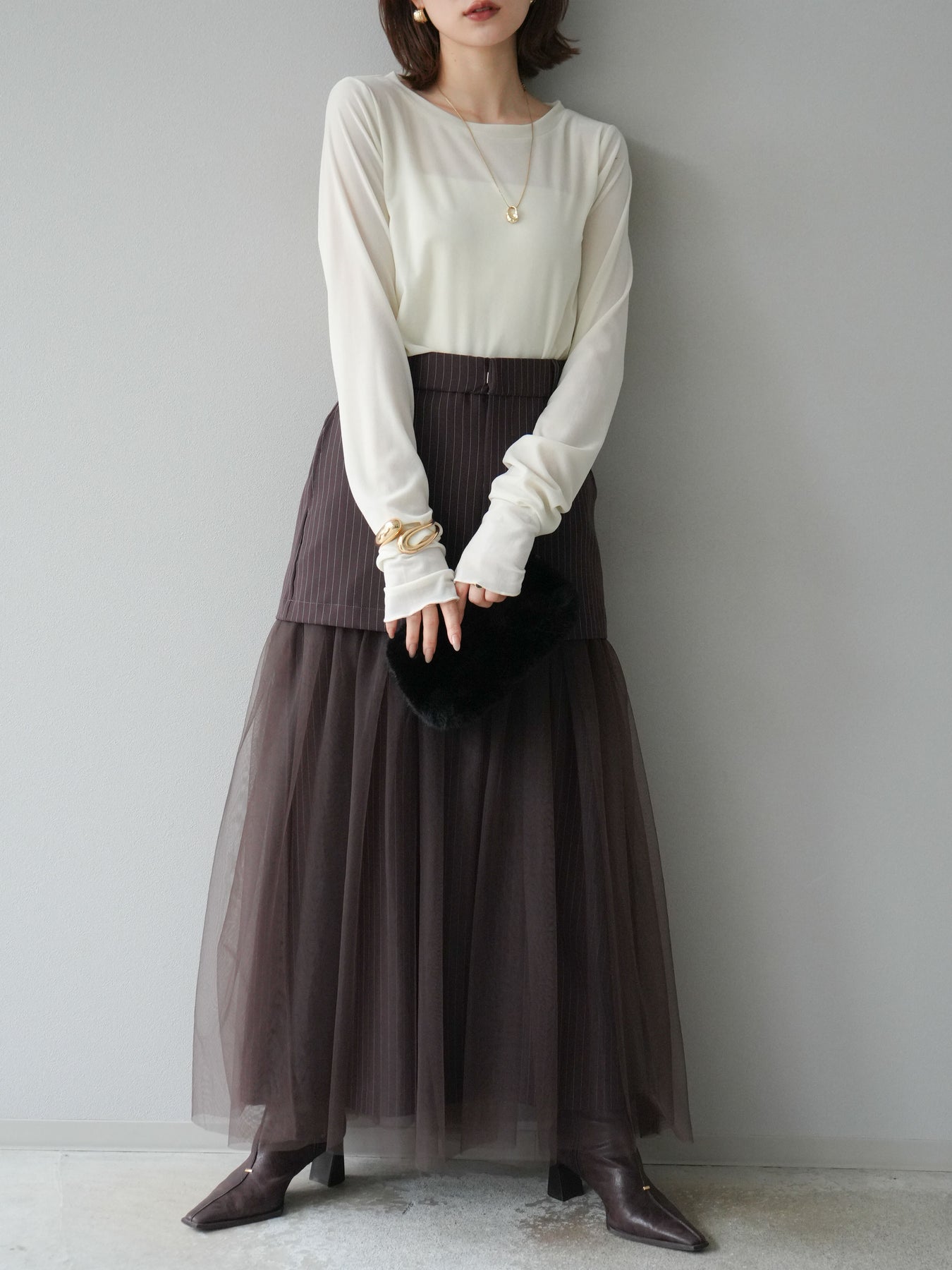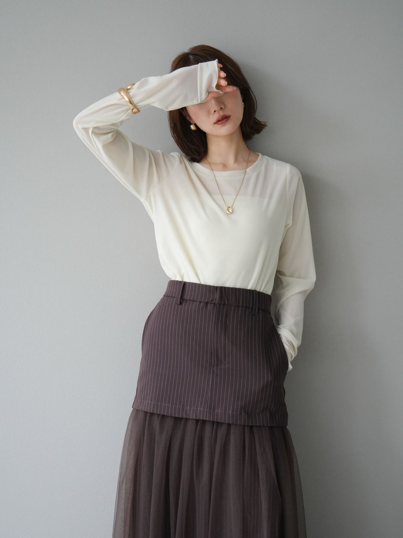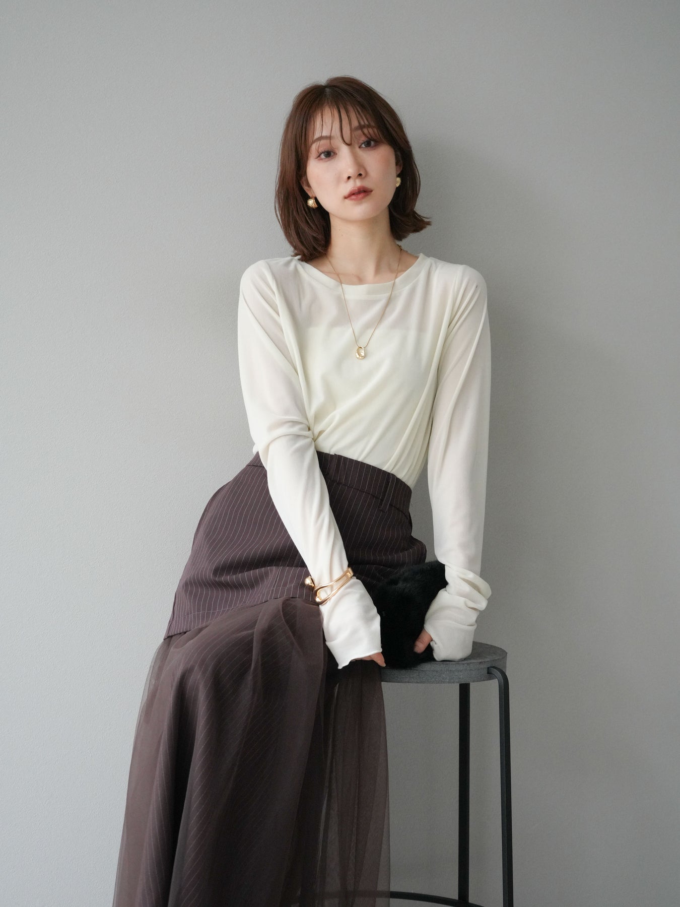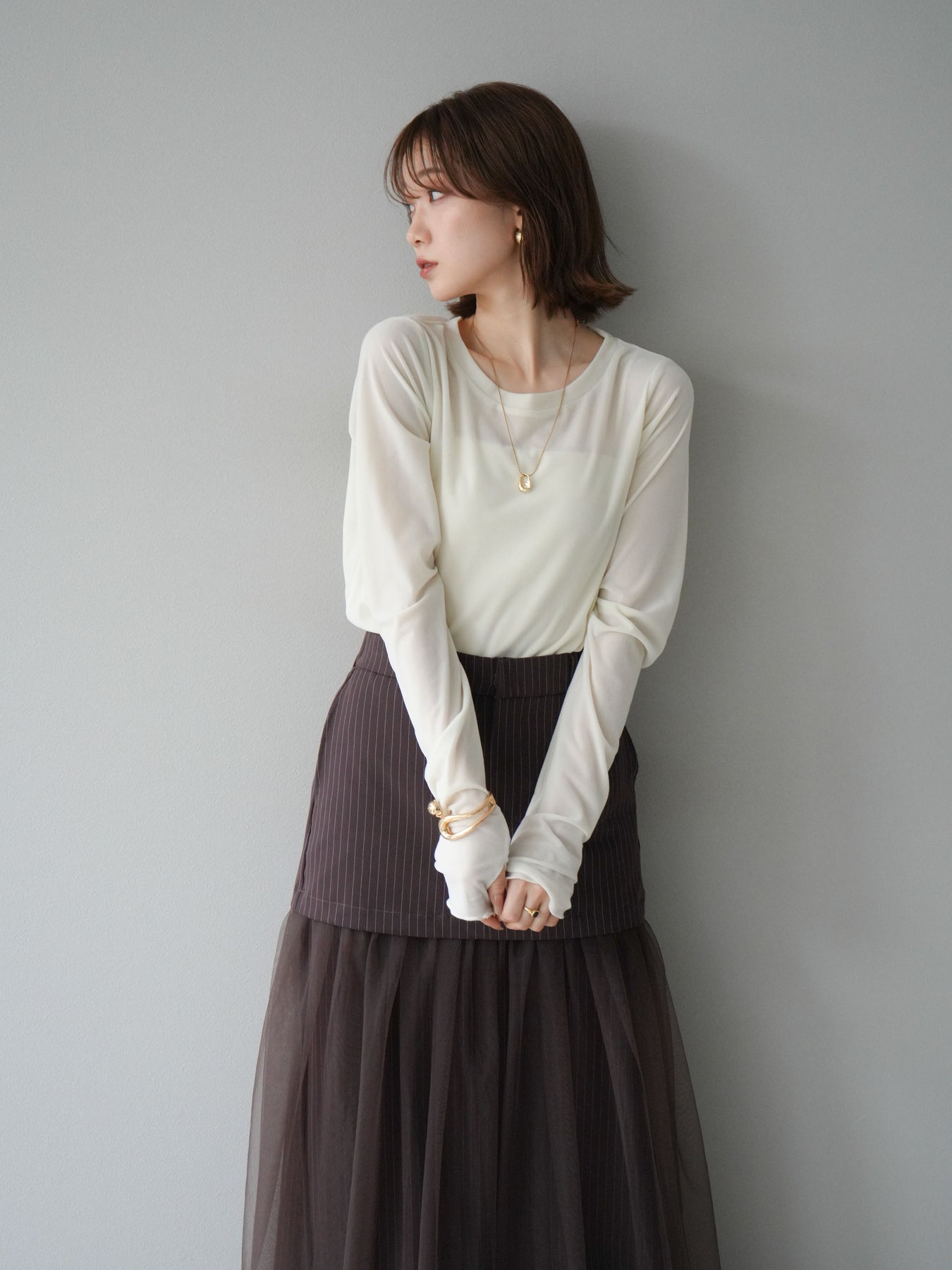 光沢感のあるベロアとシアー素材を組み合わせたフィンガーホールトップス。しなやかな質感が女性らしさを引き立て、透け感のある素材が軽やかな抜け感を演出します。袖口のフィンガーホールデザインがモードな印象をプラスし、スタイリングのアクセントに。程よいフィット感でレイヤードにも使いやすく、キャミソールやワンピースのインナーとしても重宝します。デイリーにはもちろん、特別なお出かけシーンにも映える、1枚で着映えする万能トップスです。 ※ボトムス、キャミソール(インナー)以外の商品は一律でインナーは付属していません。