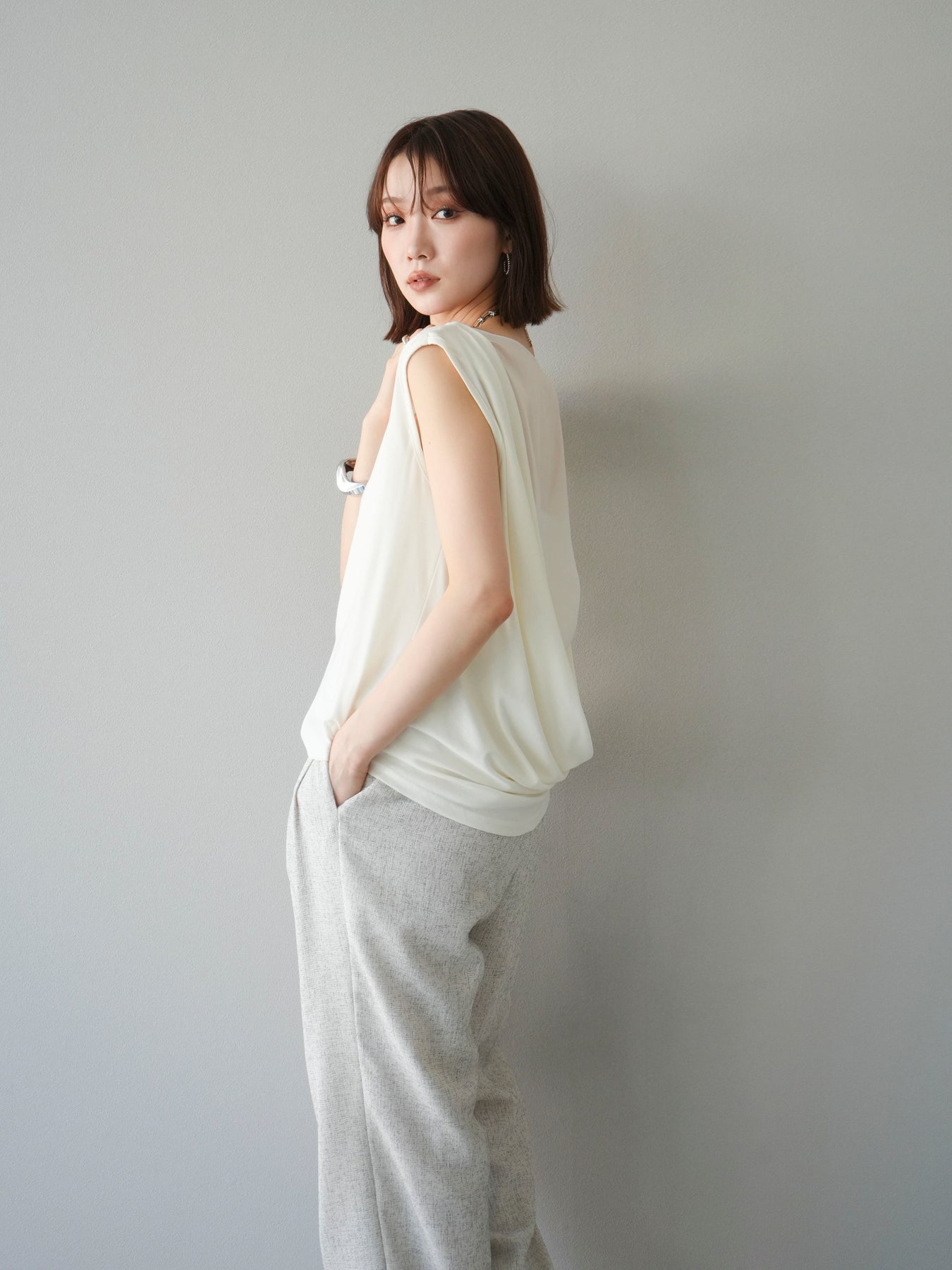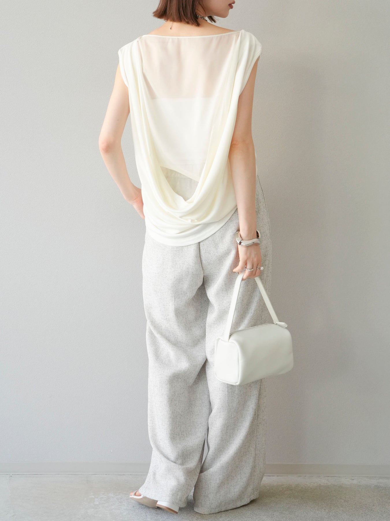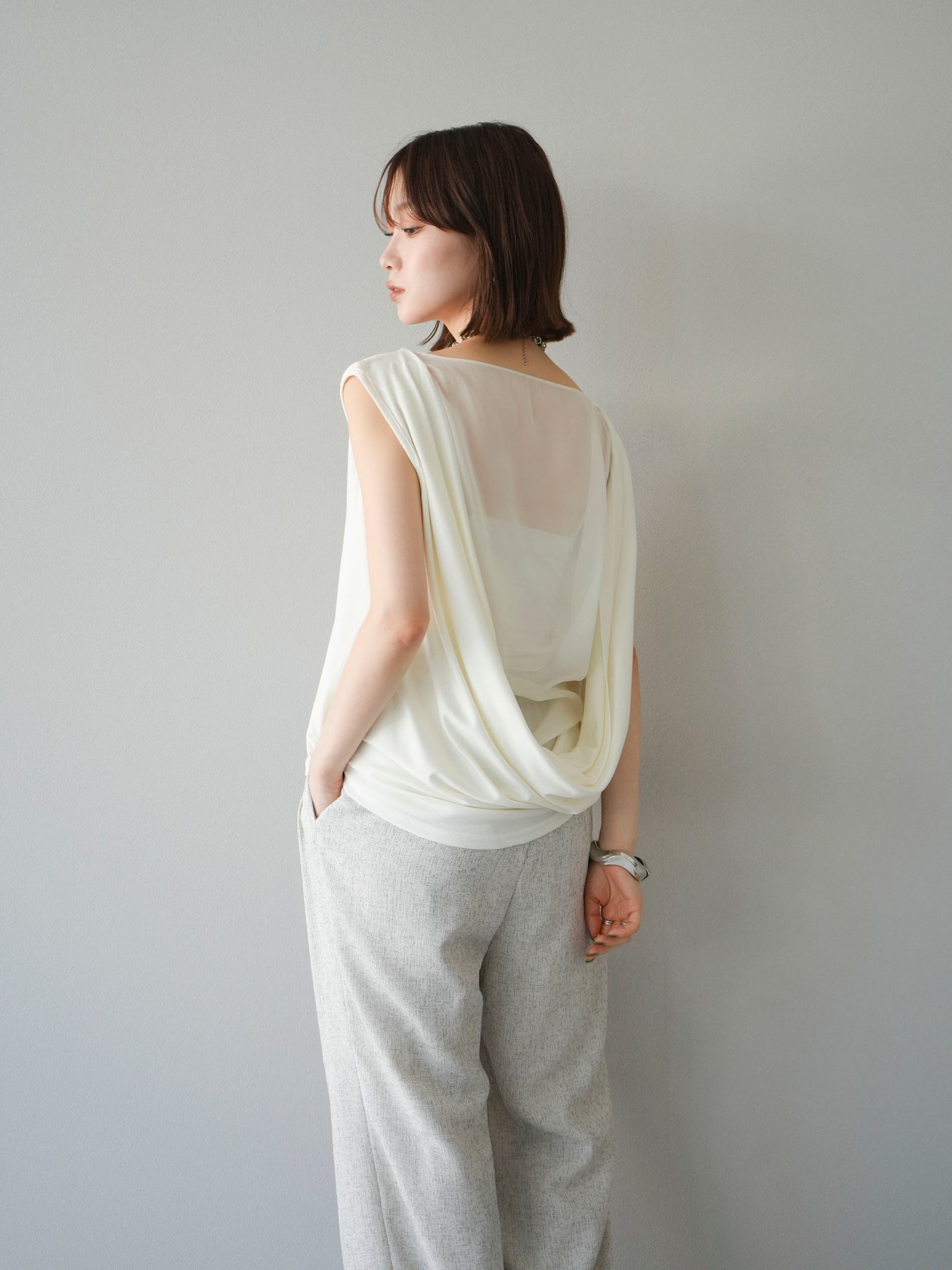 雙向垂墜上衣,凸顯您的女性氣質。 正面簡單的透明設計給人一種精緻的印象,而背面寬大的垂墜則增添了美麗的點綴。 雙向設計讓您可以任意配戴,提供您多種造型選擇。 材質柔軟垂墜,穿著輕盈舒適。 ※除下裝、吊帶背心(內衣)以外的商品均不含內衣。