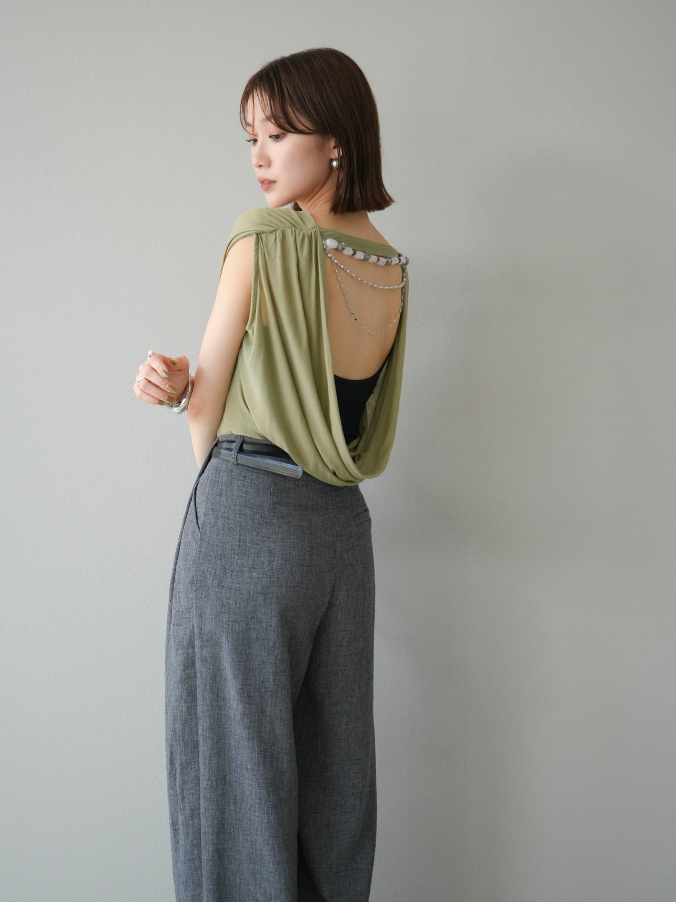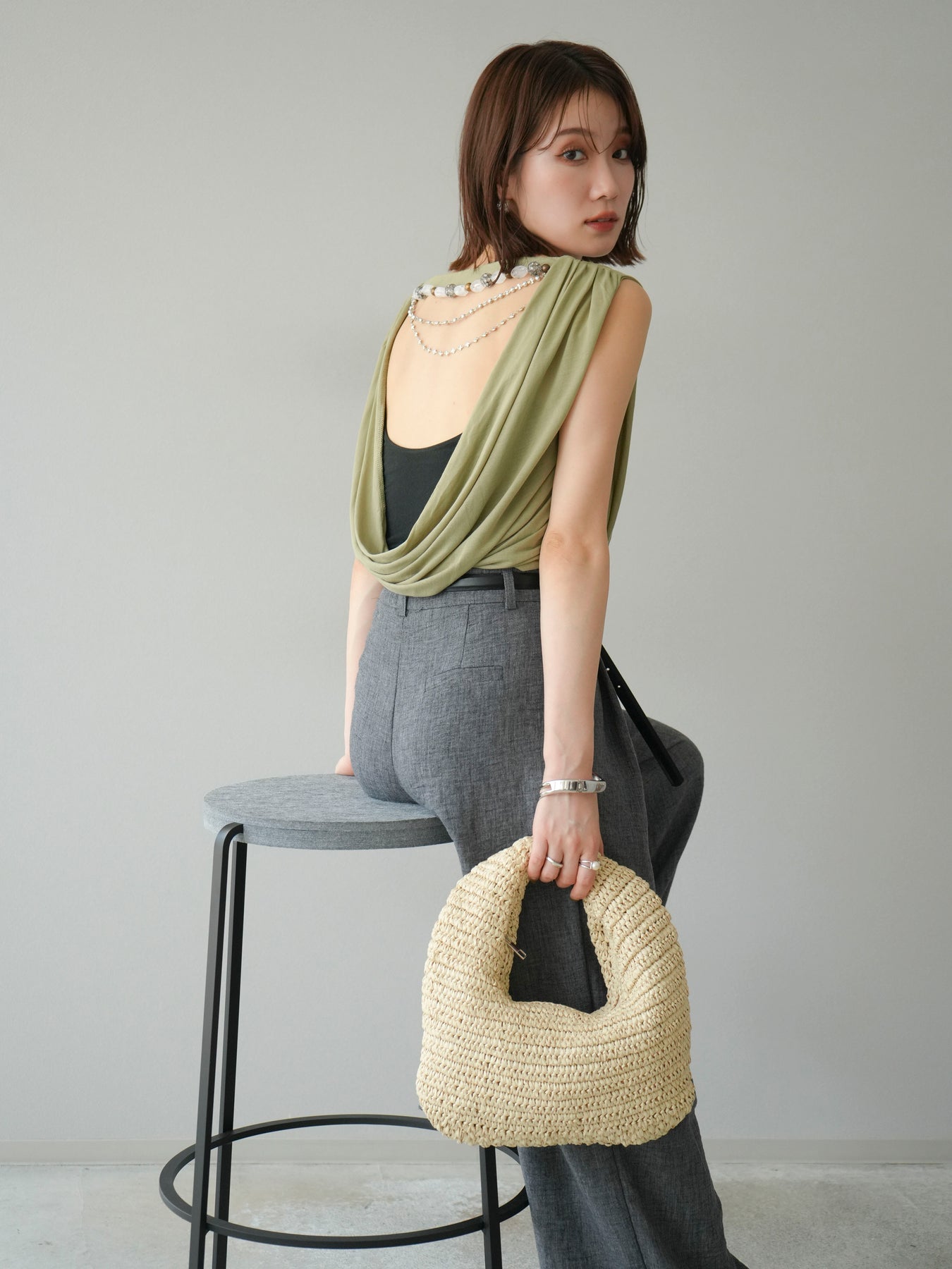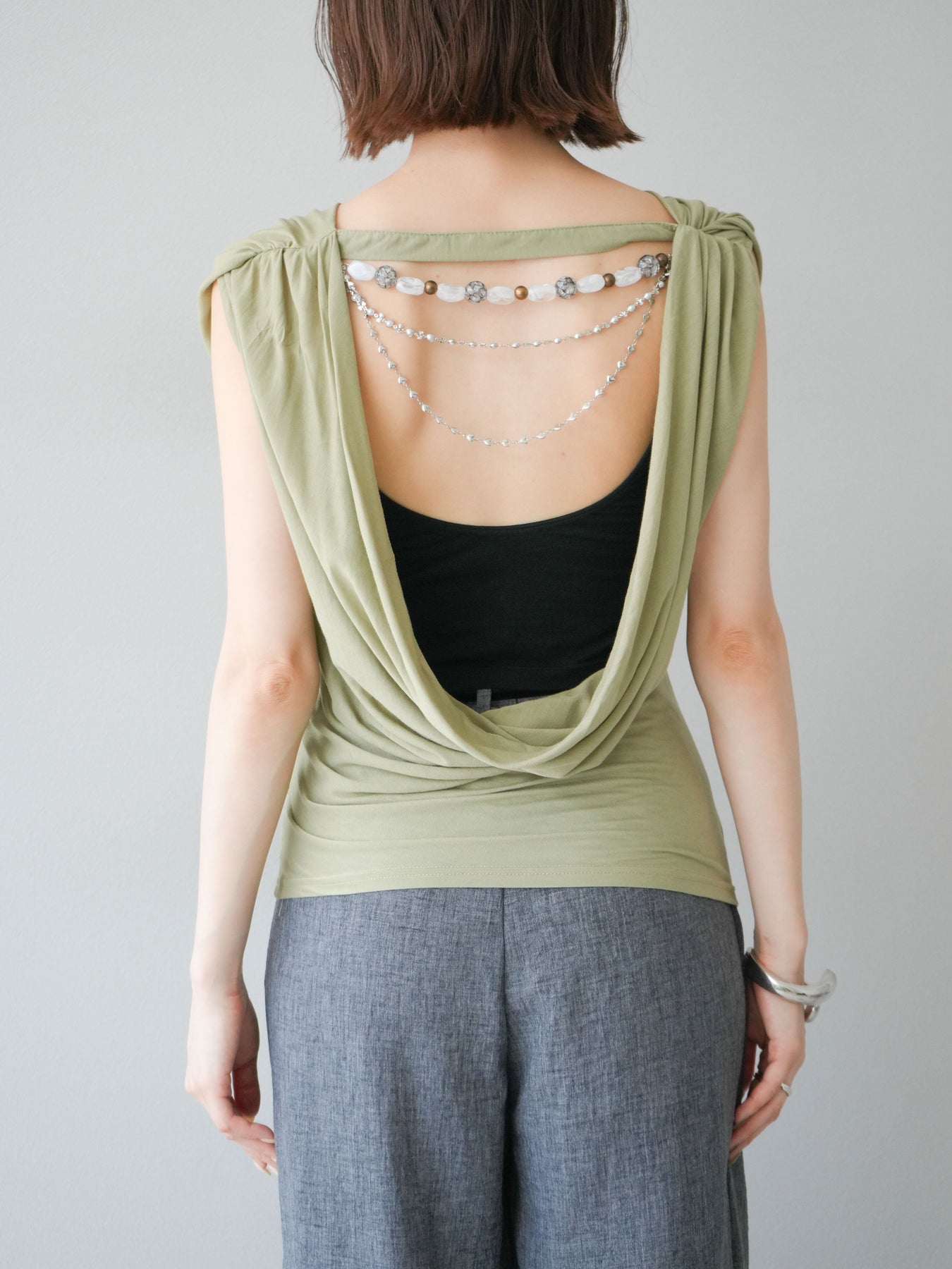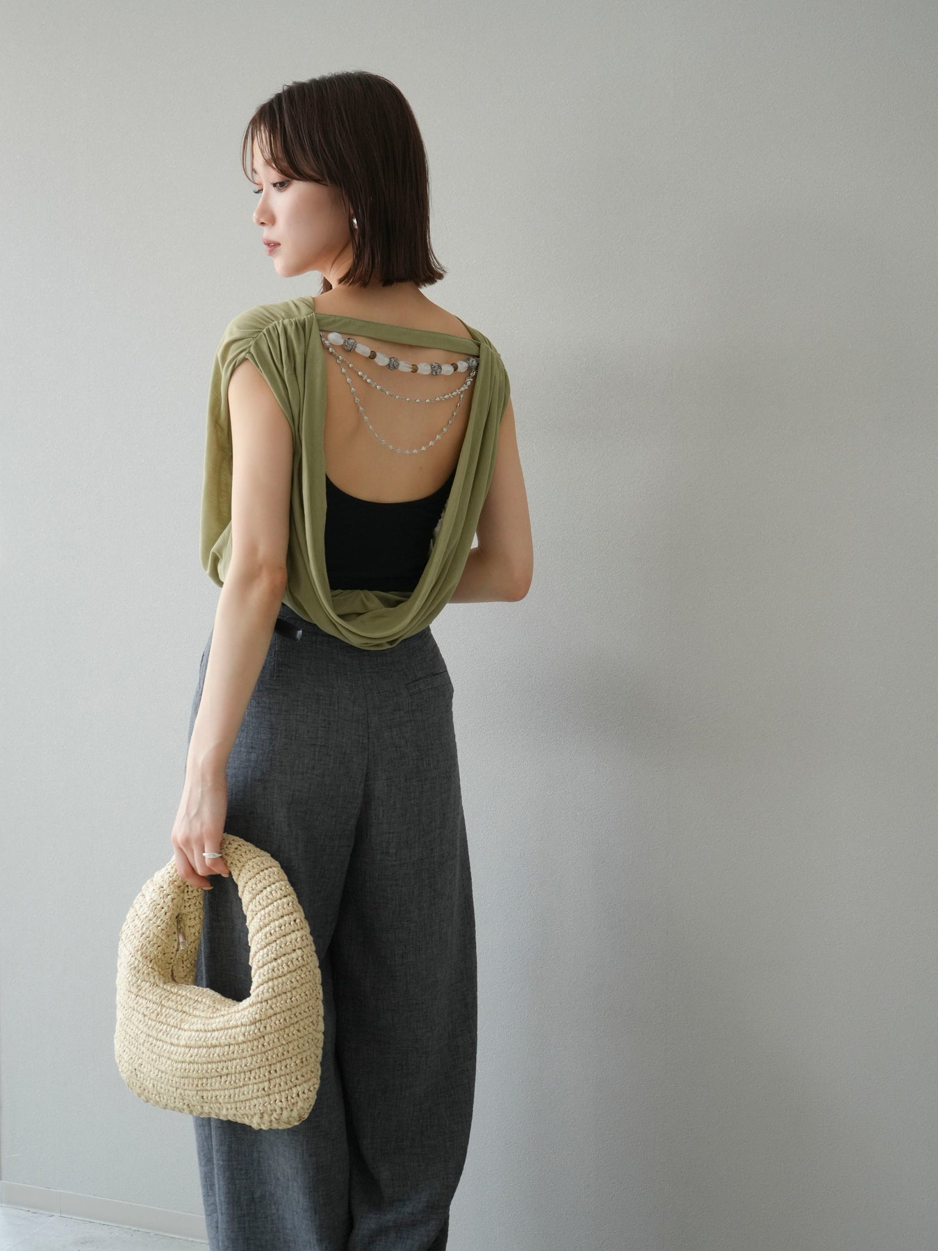 這款無袖上衣前後都有精美的垂墜設計,既華麗又休閒。背部飾有立體珠鏈,從背後看非常引人注目。 柔軟有彈性的材質穿著舒適,適度的貼合度塑造優美的身材曲線。既可搭配日常休閒下裝,也可搭配裙裝或褲裝,出席華麗場合。 這是一款適合成年人的時尚單品,無需配件即可展現出美麗的外觀。 ※除下裝、吊帶背心(內衣)以外的商品均不含內衣。