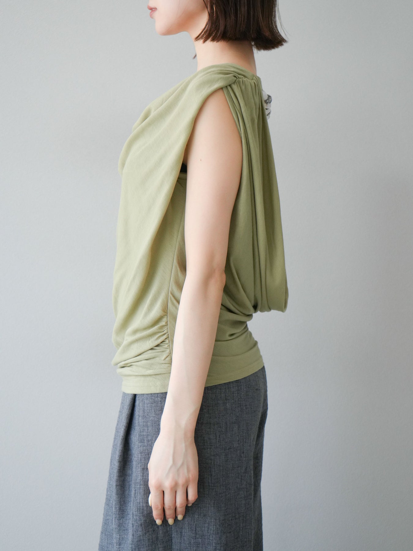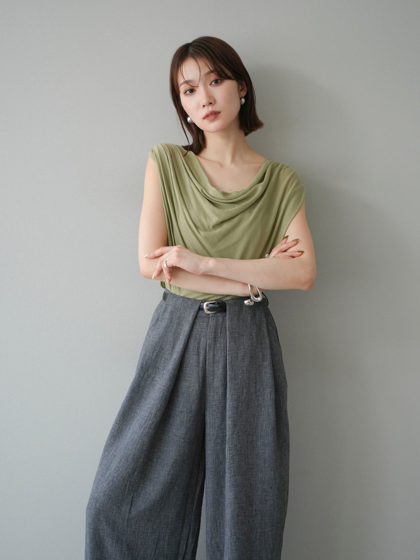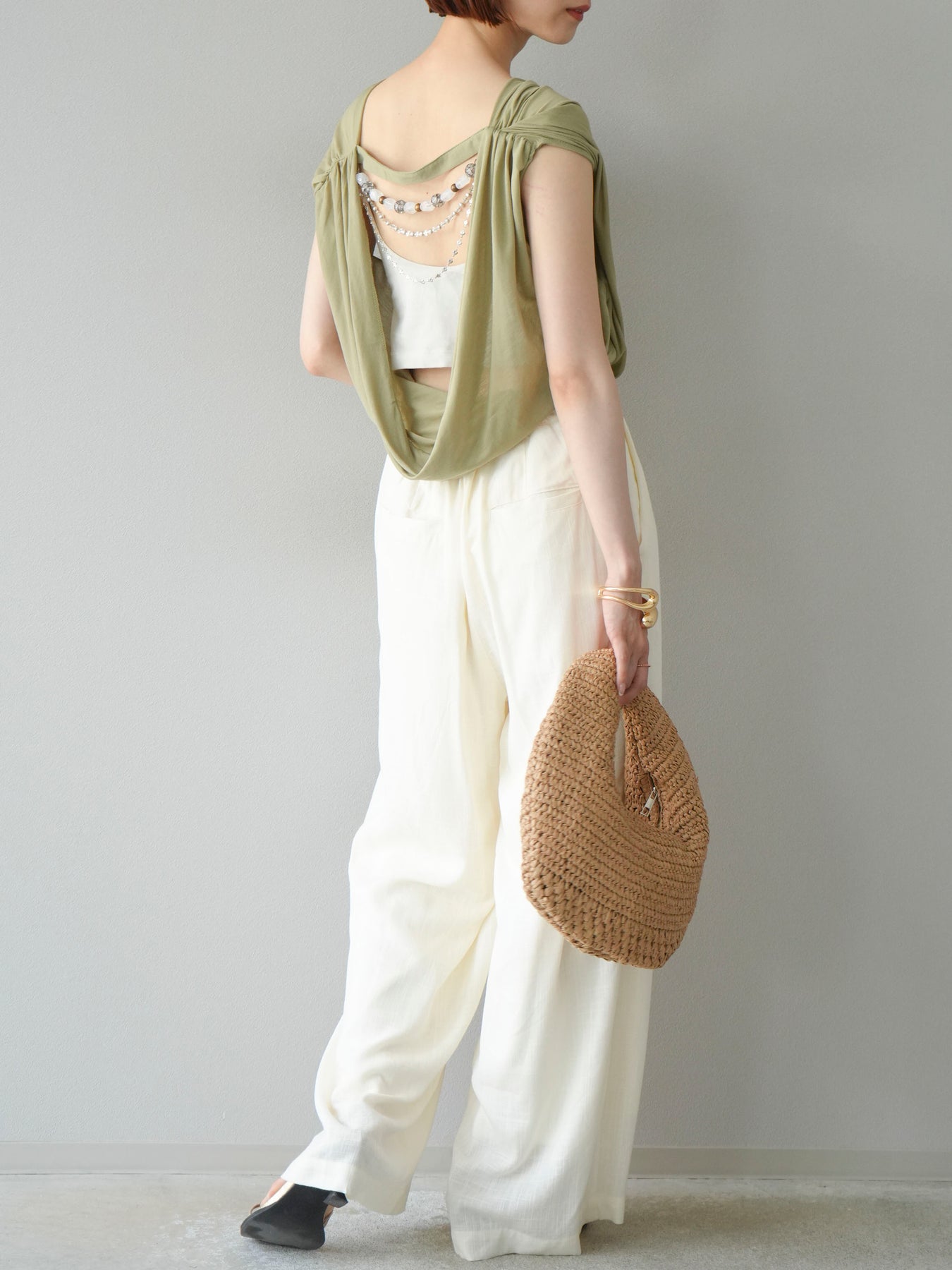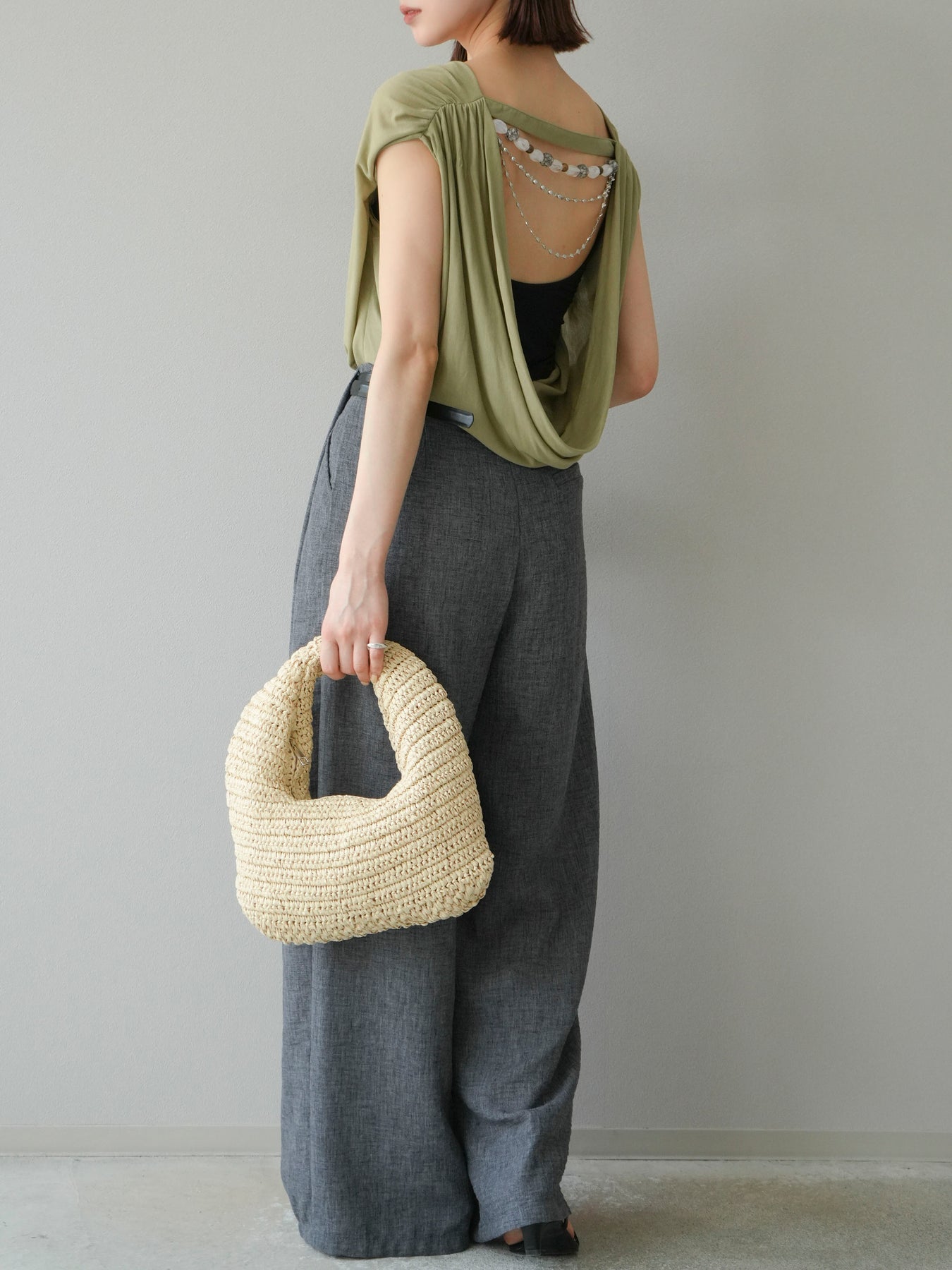 這款無袖上衣前後都有精美的垂墜設計,既華麗又休閒。背部飾有立體珠鏈,從背後看非常引人注目。 柔軟有彈性的材質穿著舒適,適度的貼合度塑造優美的身材曲線。既可搭配日常休閒下裝,也可搭配裙裝或褲裝,出席華麗場合。 這是一款適合成年人的時尚單品,無需配件即可展現出美麗的外觀。 ※除下裝、吊帶背心(內衣)以外的商品均不含內衣。