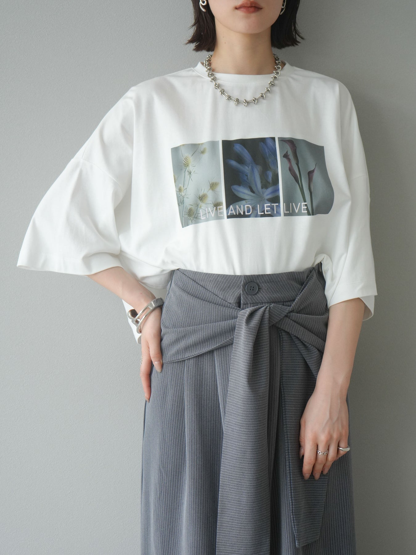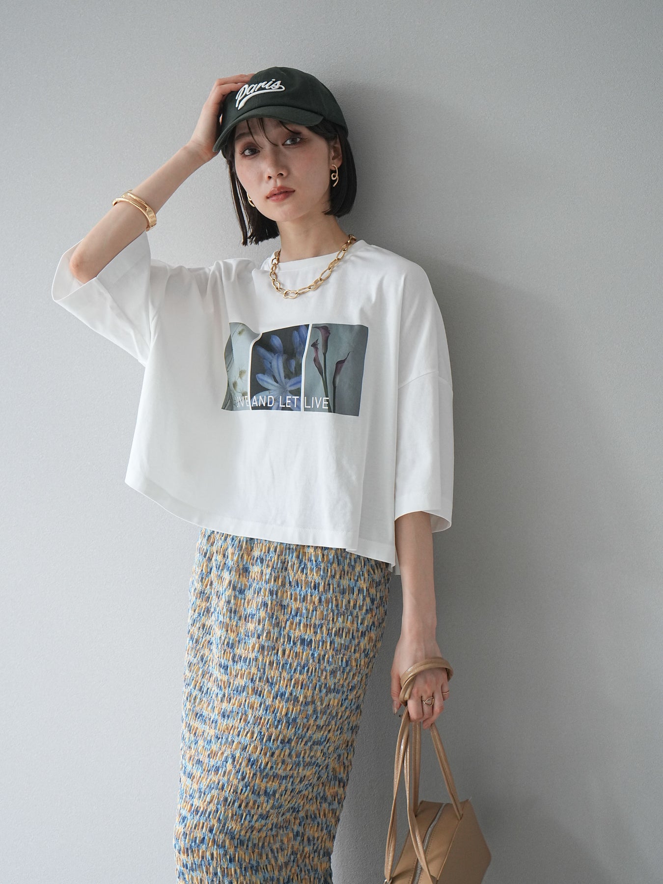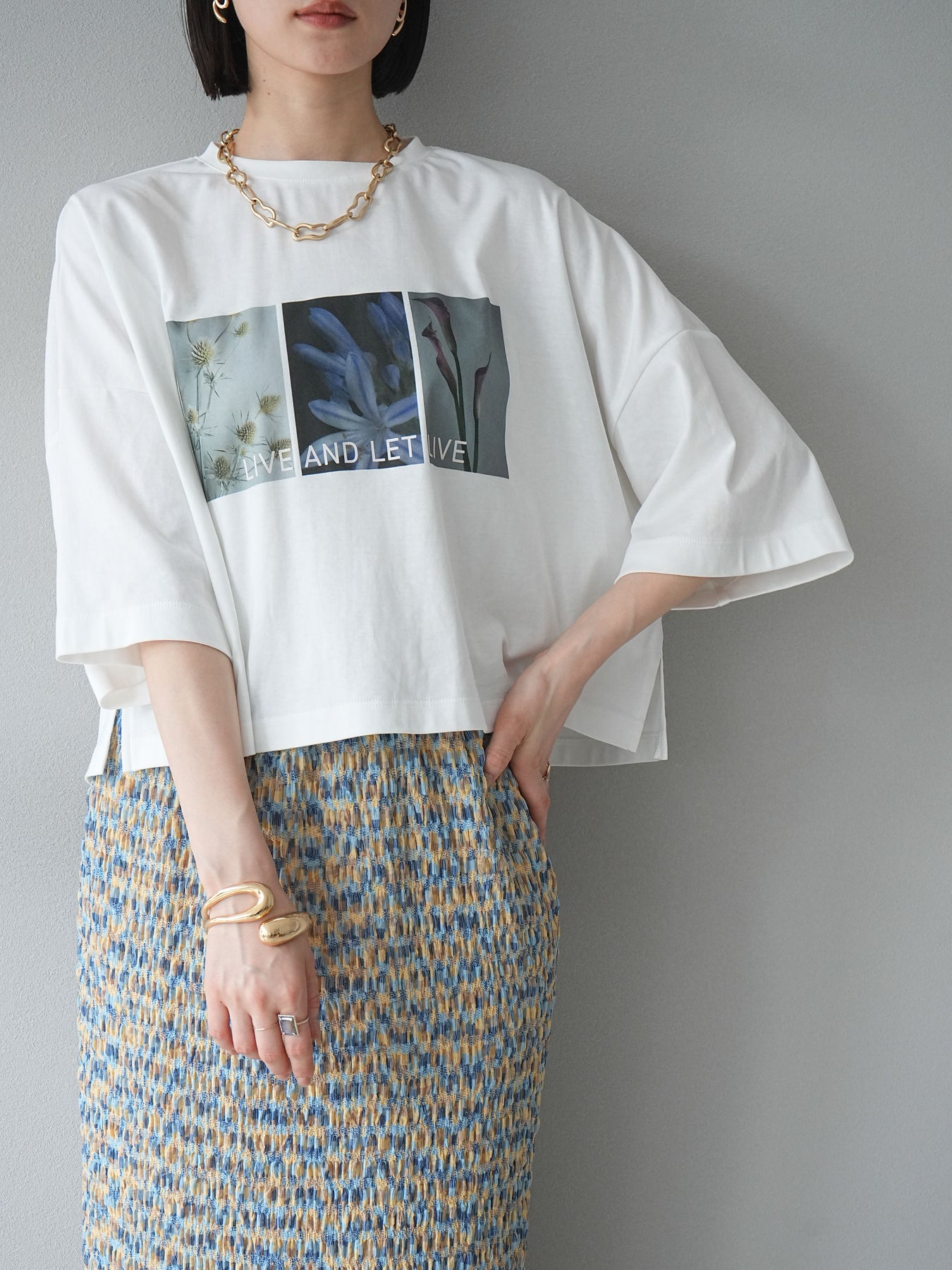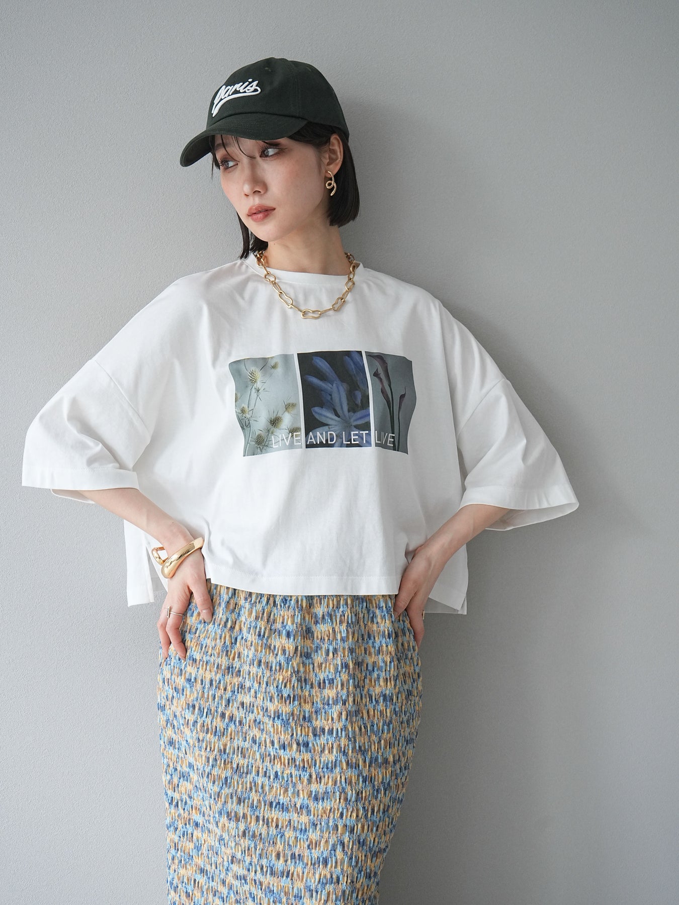 這款帶有標誌的短款T卹採用柔軟順滑的面料製成,印有精緻的花卉圖案。略帶光澤的布料賦予其優雅的氣質,卻又不失休閒感,正面的藝術照片和「LIVE AND LET LIVE」標誌更是點睛之筆。略寬的版型和較短的長度與下裝相得益彰。它易於搭配裙子和褲子,即使不塞進褲腰也能保持勻稱的輪廓。這是一款設計感十足的T卹,日常穿著方便,單穿也同樣出色。 ※除下裝、吊帶背心(內衣)以外的商品均不含內衣。