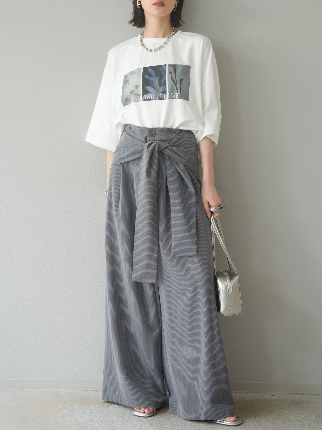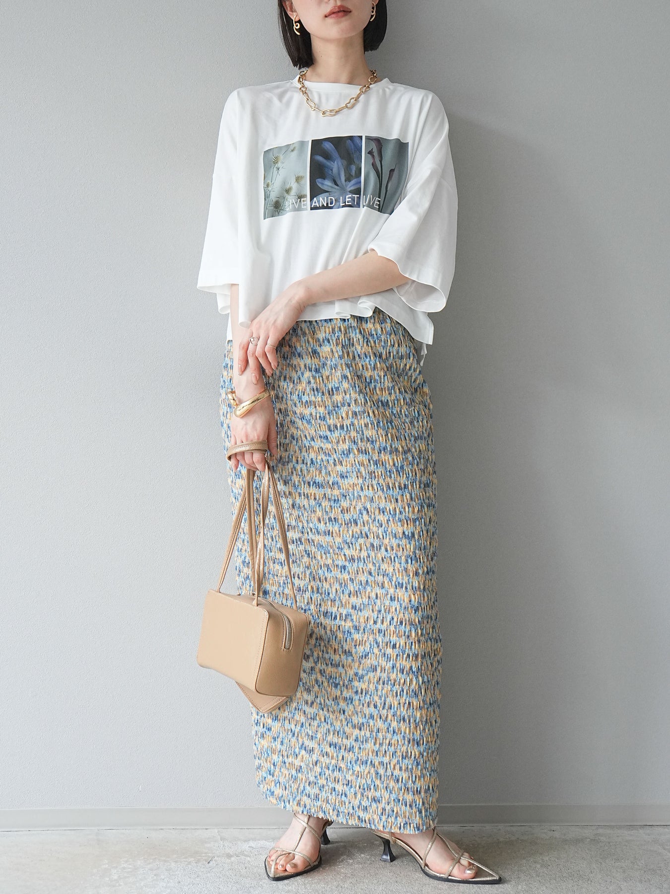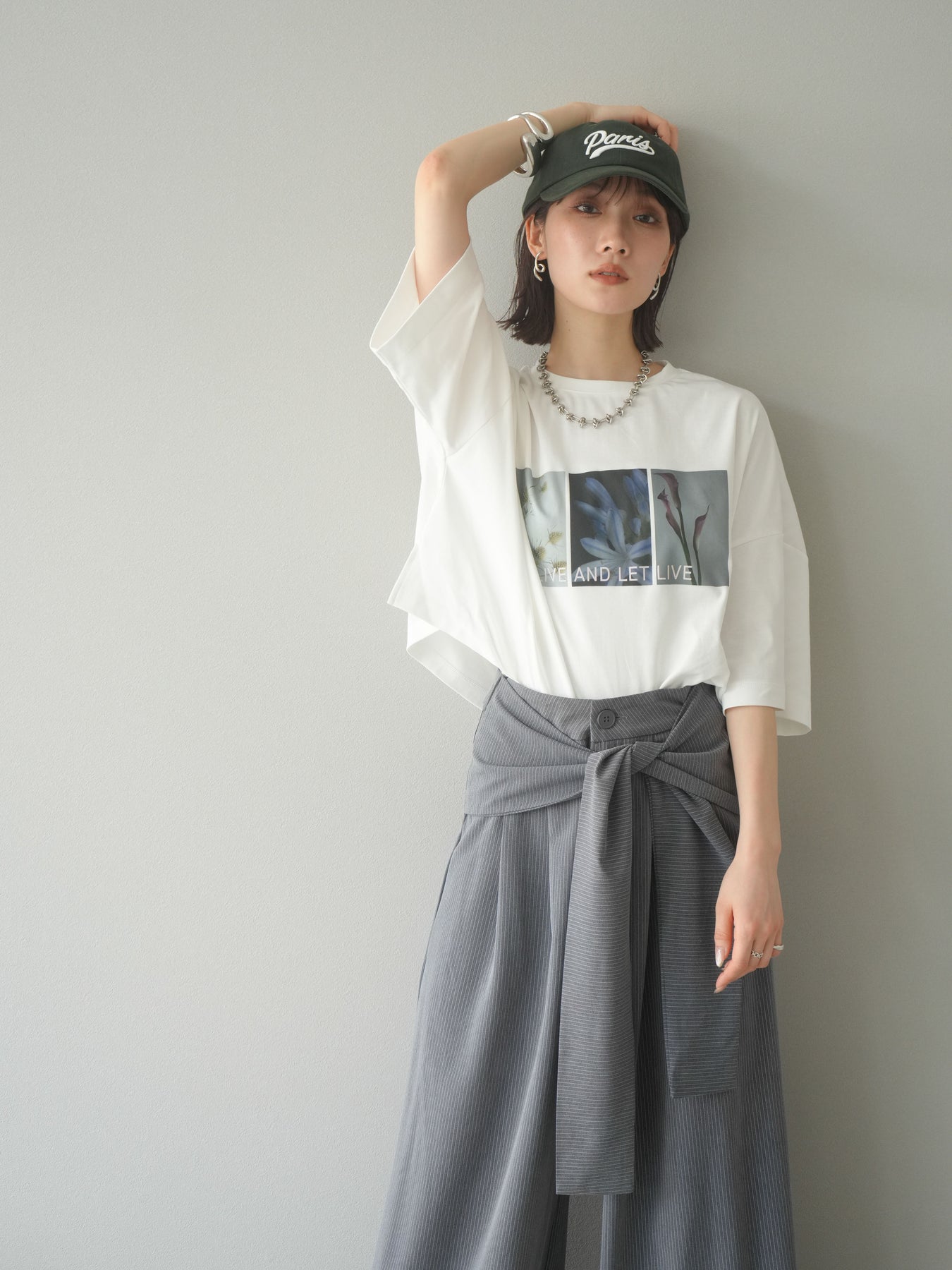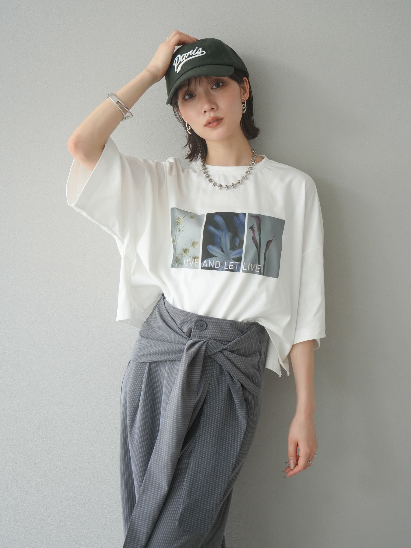 這款帶有標誌的短款T卹採用柔軟順滑的面料製成,印有精緻的花卉圖案。略帶光澤的布料賦予其優雅的氣質,卻又不失休閒感,正面的藝術照片和「LIVE AND LET LIVE」標誌更是點睛之筆。略寬的版型和較短的長度與下裝相得益彰。它易於搭配裙子和褲子,即使不塞進褲腰也能保持勻稱的輪廓。這是一款設計感十足的T卹,日常穿著方便,單穿也同樣出色。 ※除下裝、吊帶背心(內衣)以外的商品均不含內衣。