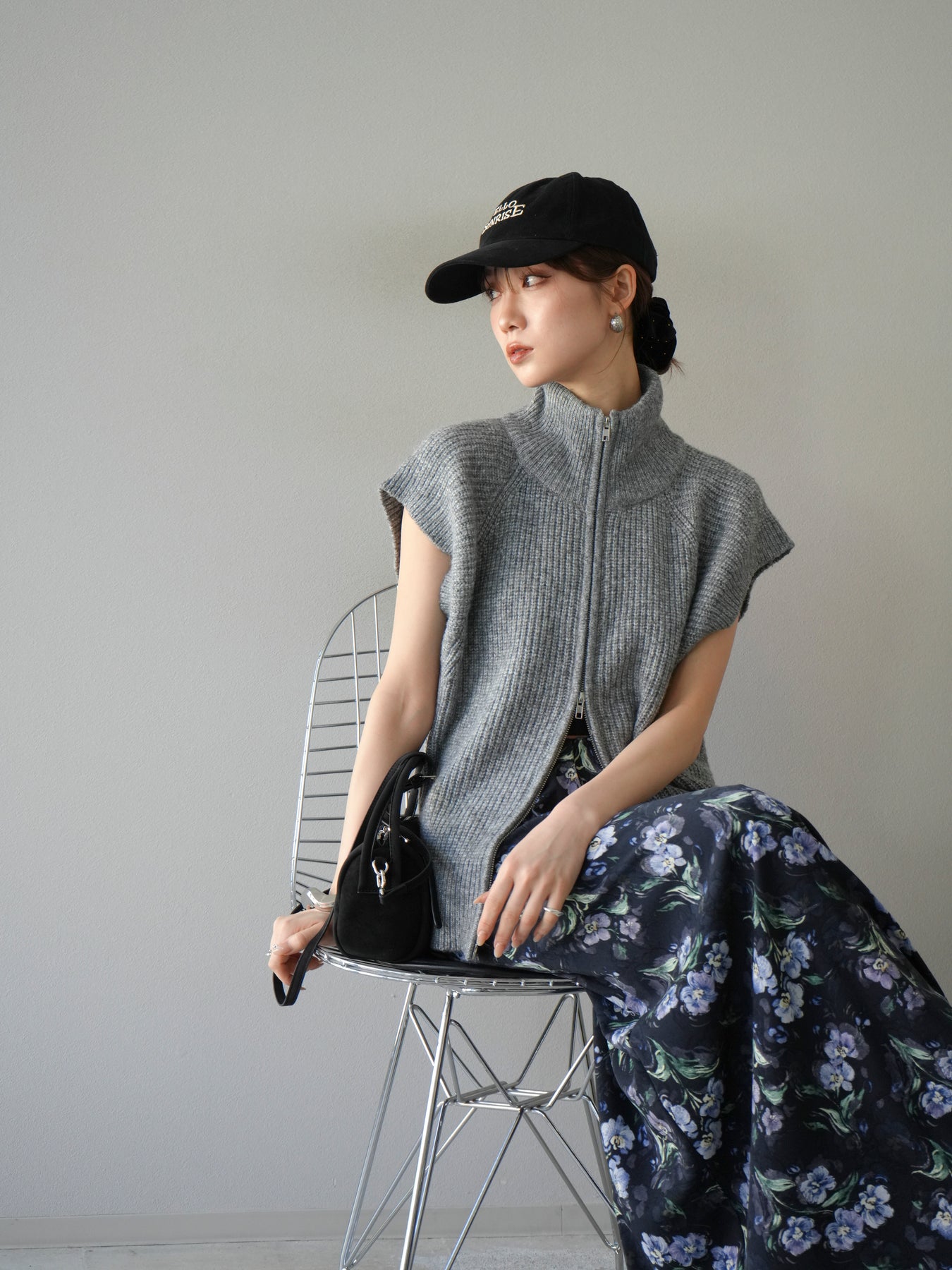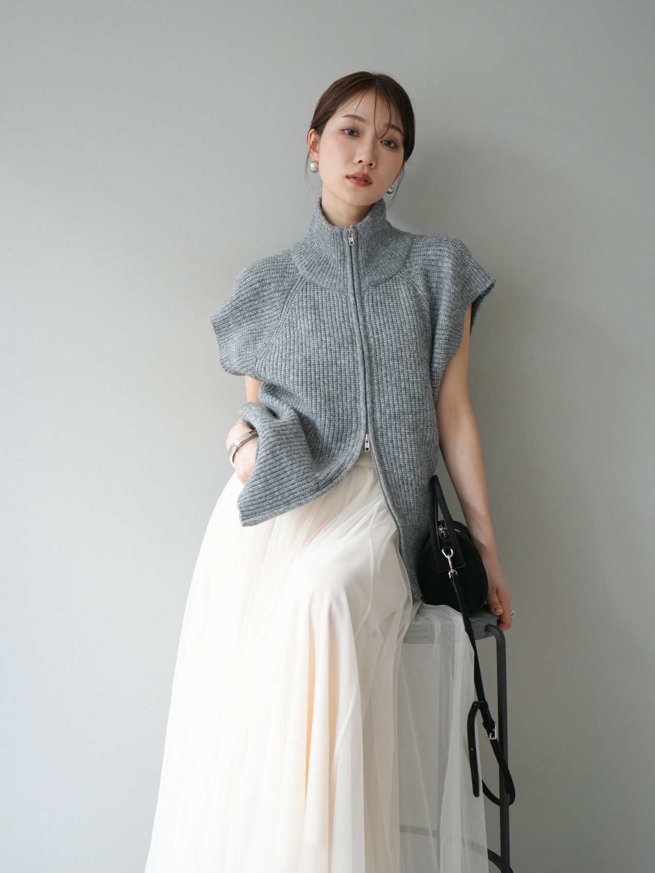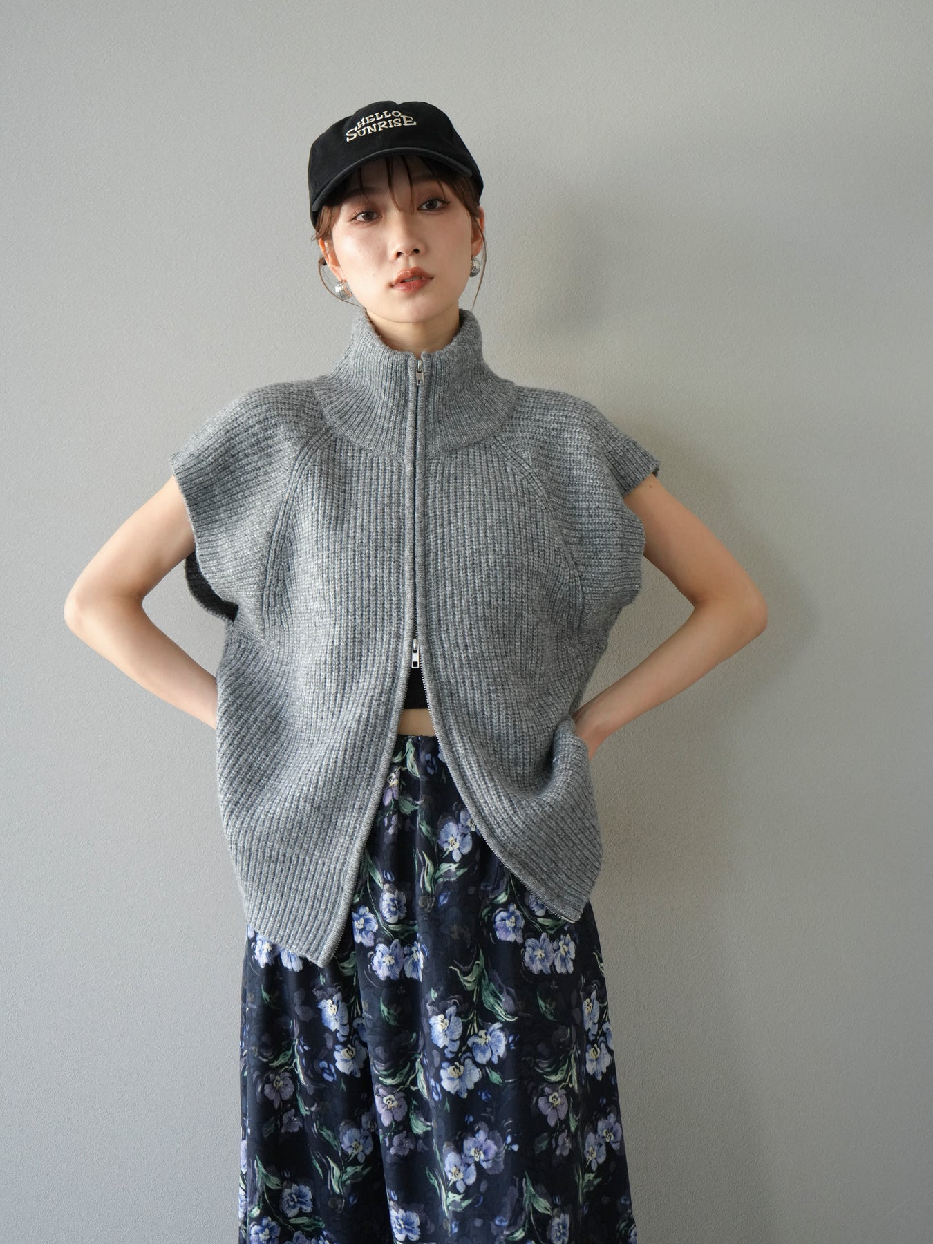 [予約]ダブルZIPハイネック畦編みニットベスト/杢グレー