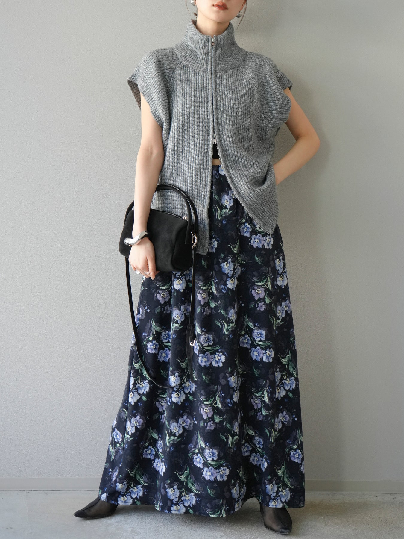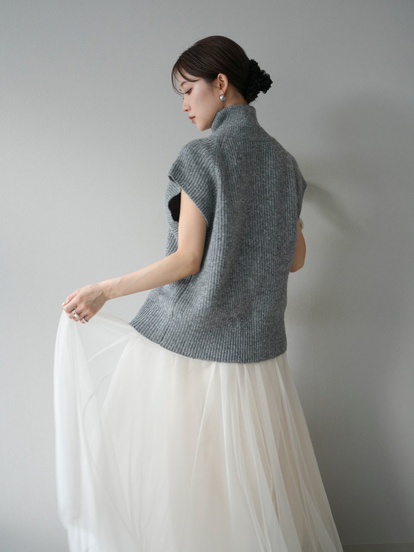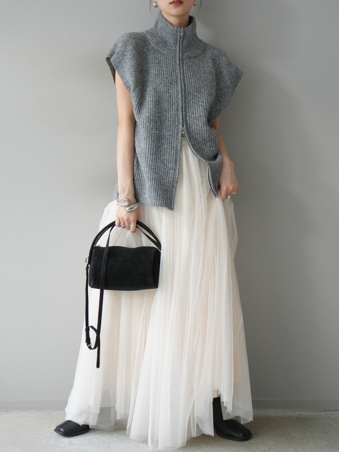 [予約]ダブルZIPハイネック畦編みニットベスト/杢グレー