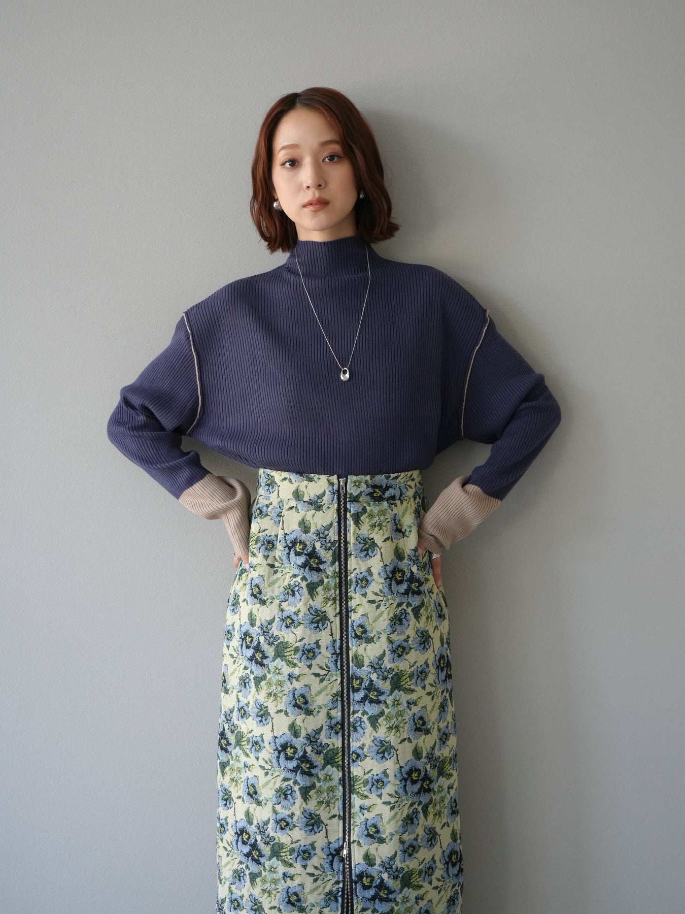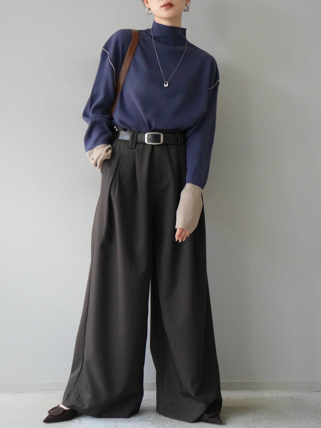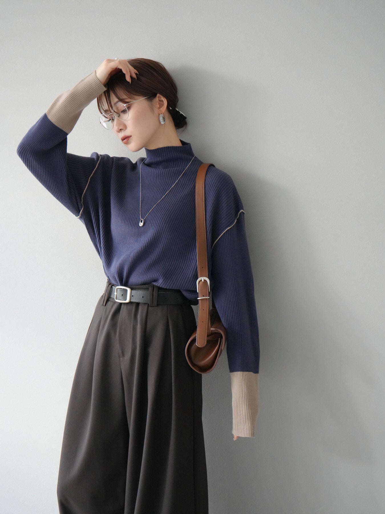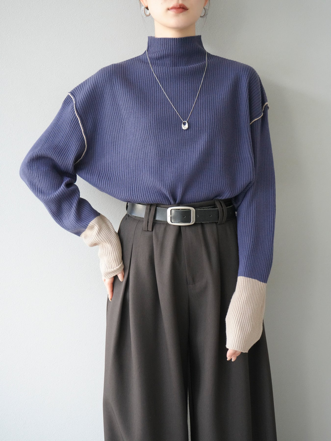 [予約]ボトルネック配色リブニットプルオーバー/アイアンブルー×ベージュ