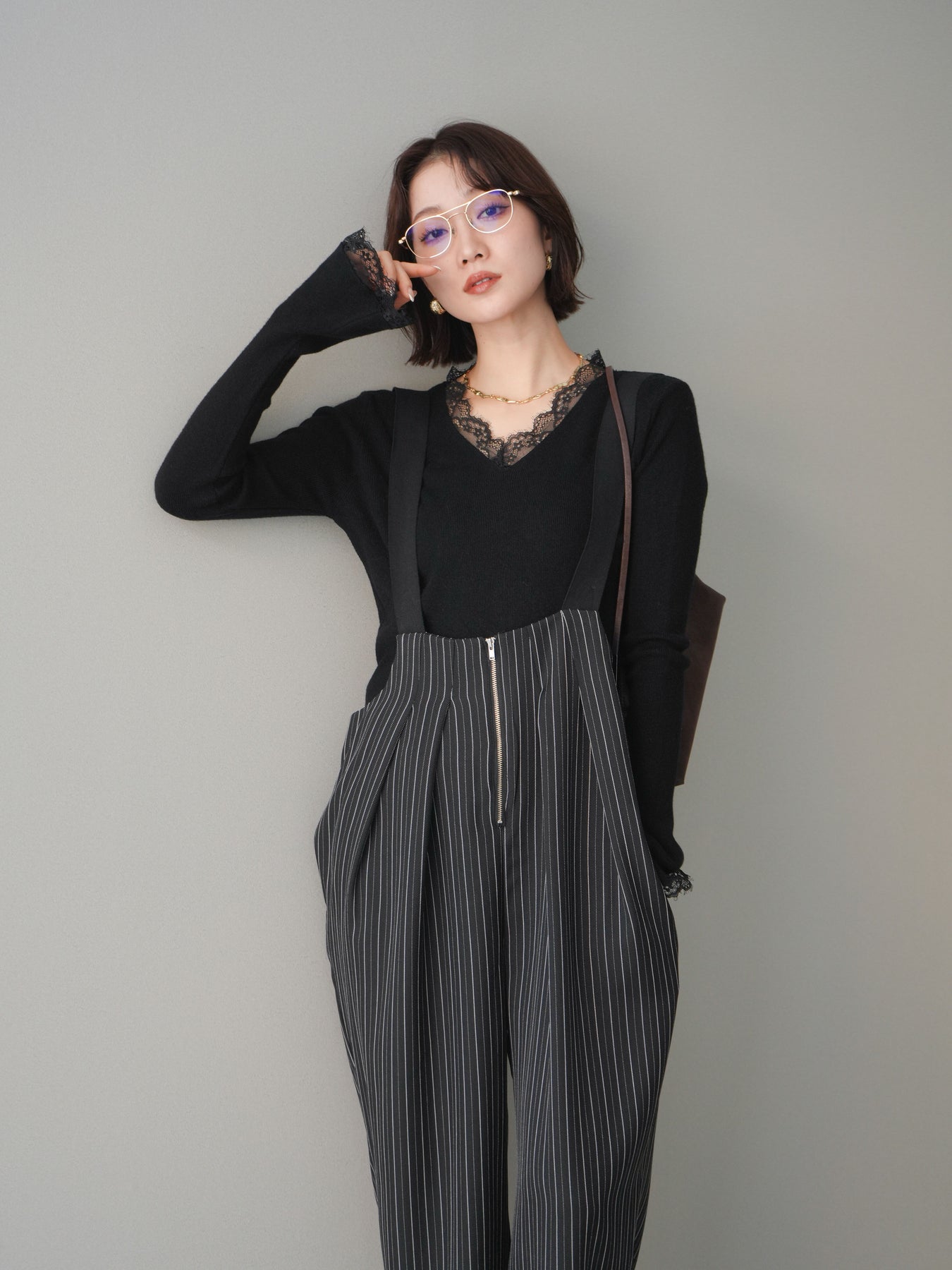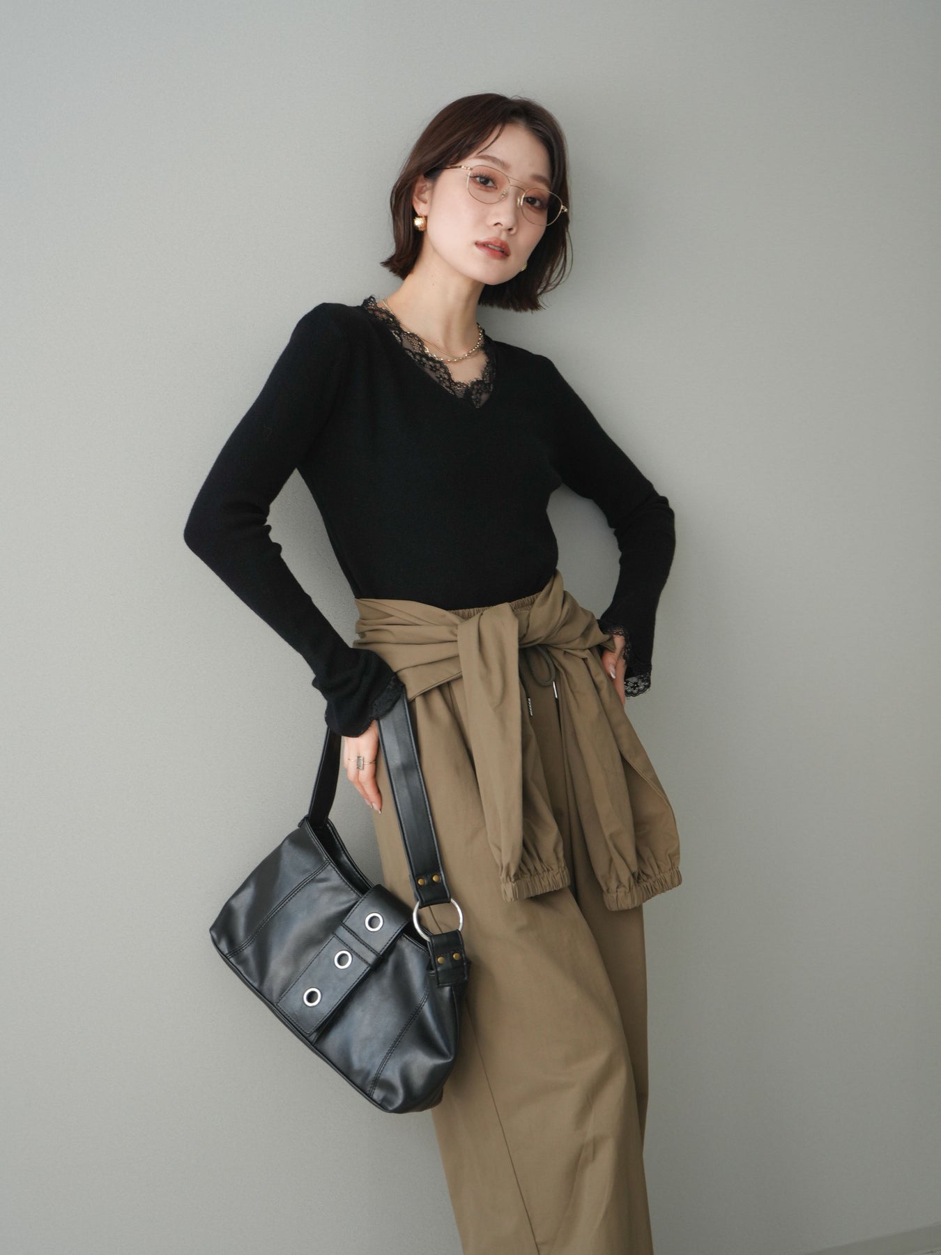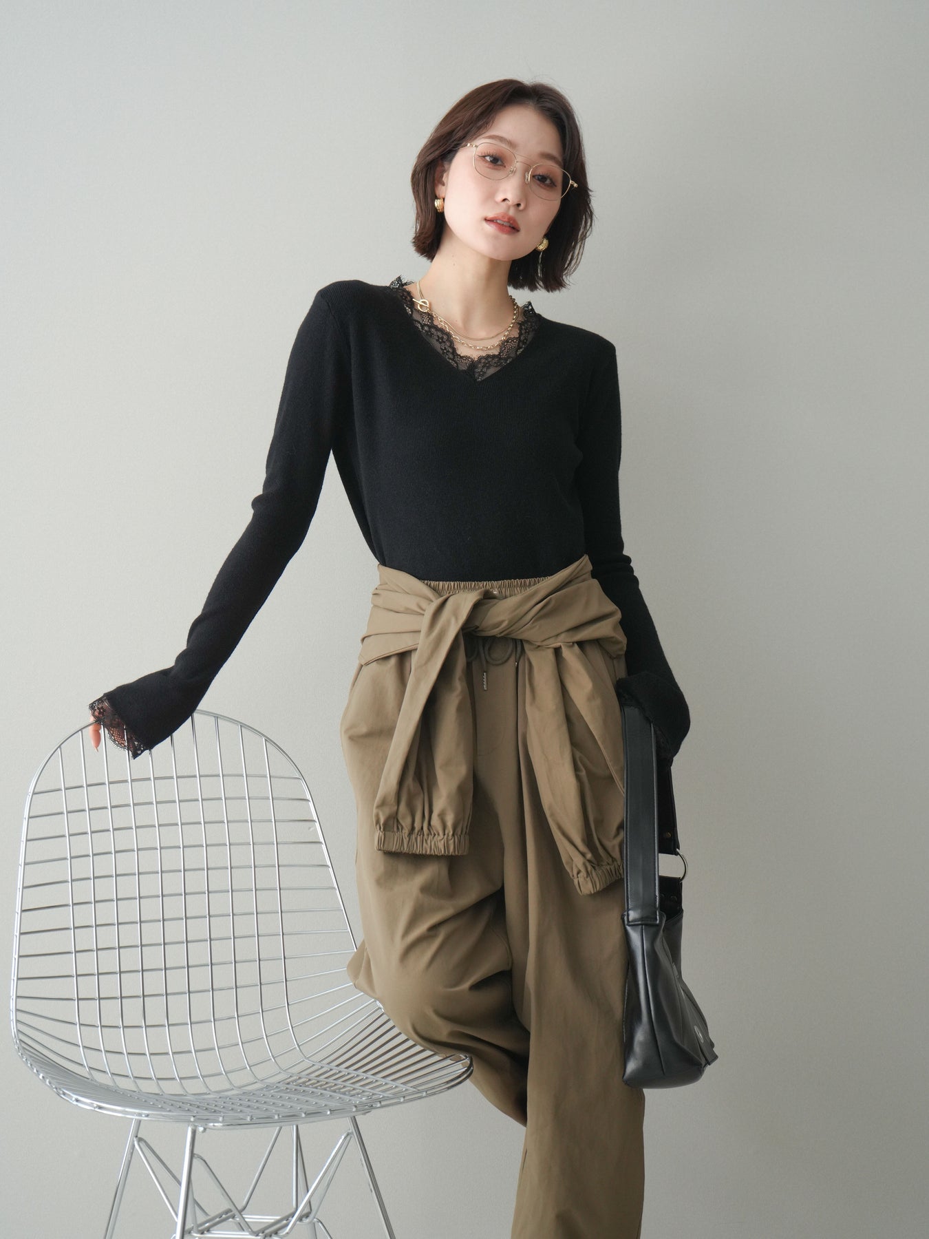 繊細なレースを重ねたVネックデザインが、さりげない表情を添えるニットトップス。 首元から覗くレースが上品な抜け感を生み、シンプルながらも印象に残る一枚です。 程よくフィットするシルエットで、ボトムスにインしてもアウトでもバランスよく着用可能。 ニットの柔らかな風合いとレースの軽やかさが調和し、デニムなどのカジュアルなアイテムと合わせても、どこか洗練された雰囲気にまとまります。 一枚着としてはもちろん、ジャケットやカーディガンのインナーとしても活躍するトップスです。 ※ボトムス、キャミソール(インナー)以外の商品は一律でインナーは付属していません。