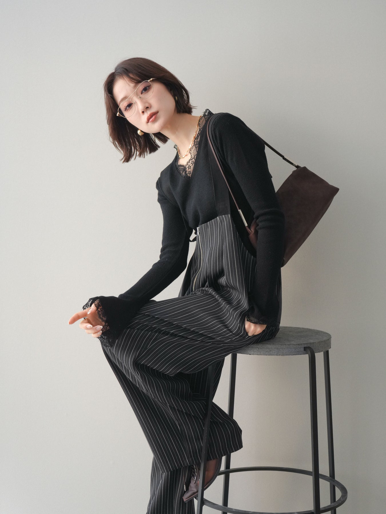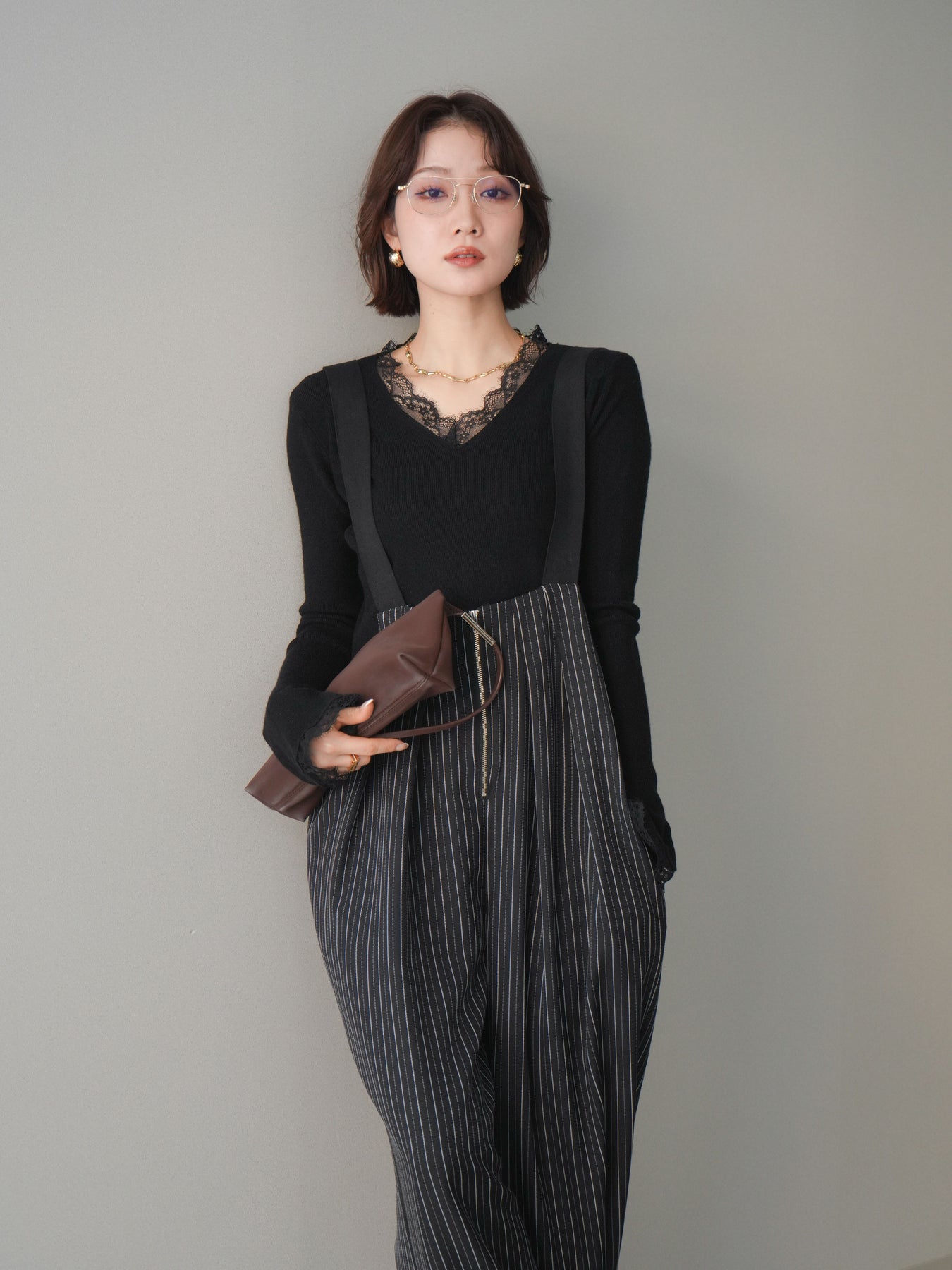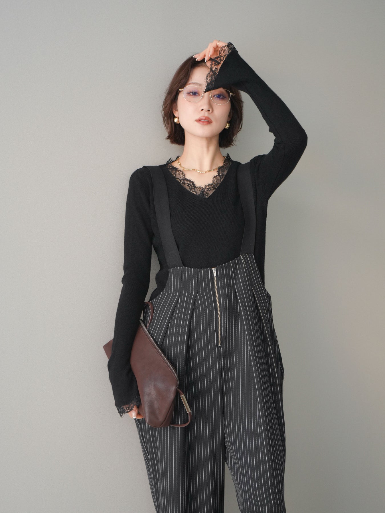 繊細なレースを重ねたVネックデザインが、さりげない表情を添えるニットトップス。 首元から覗くレースが上品な抜け感を生み、シンプルながらも印象に残る一枚です。 程よくフィットするシルエットで、ボトムスにインしてもアウトでもバランスよく着用可能。 ニットの柔らかな風合いとレースの軽やかさが調和し、デニムなどのカジュアルなアイテムと合わせても、どこか洗練された雰囲気にまとまります。 一枚着としてはもちろん、ジャケットやカーディガンのインナーとしても活躍するトップスです。 ※ボトムス、キャミソール(インナー)以外の商品は一律でインナーは付属していません。