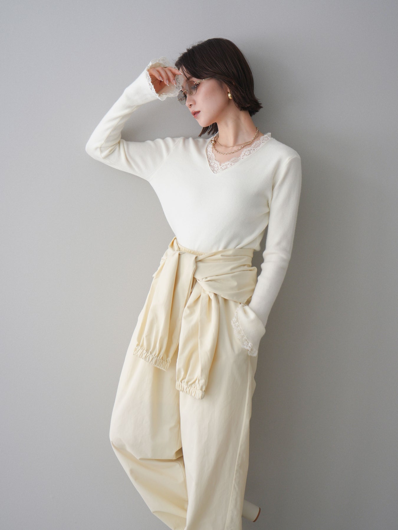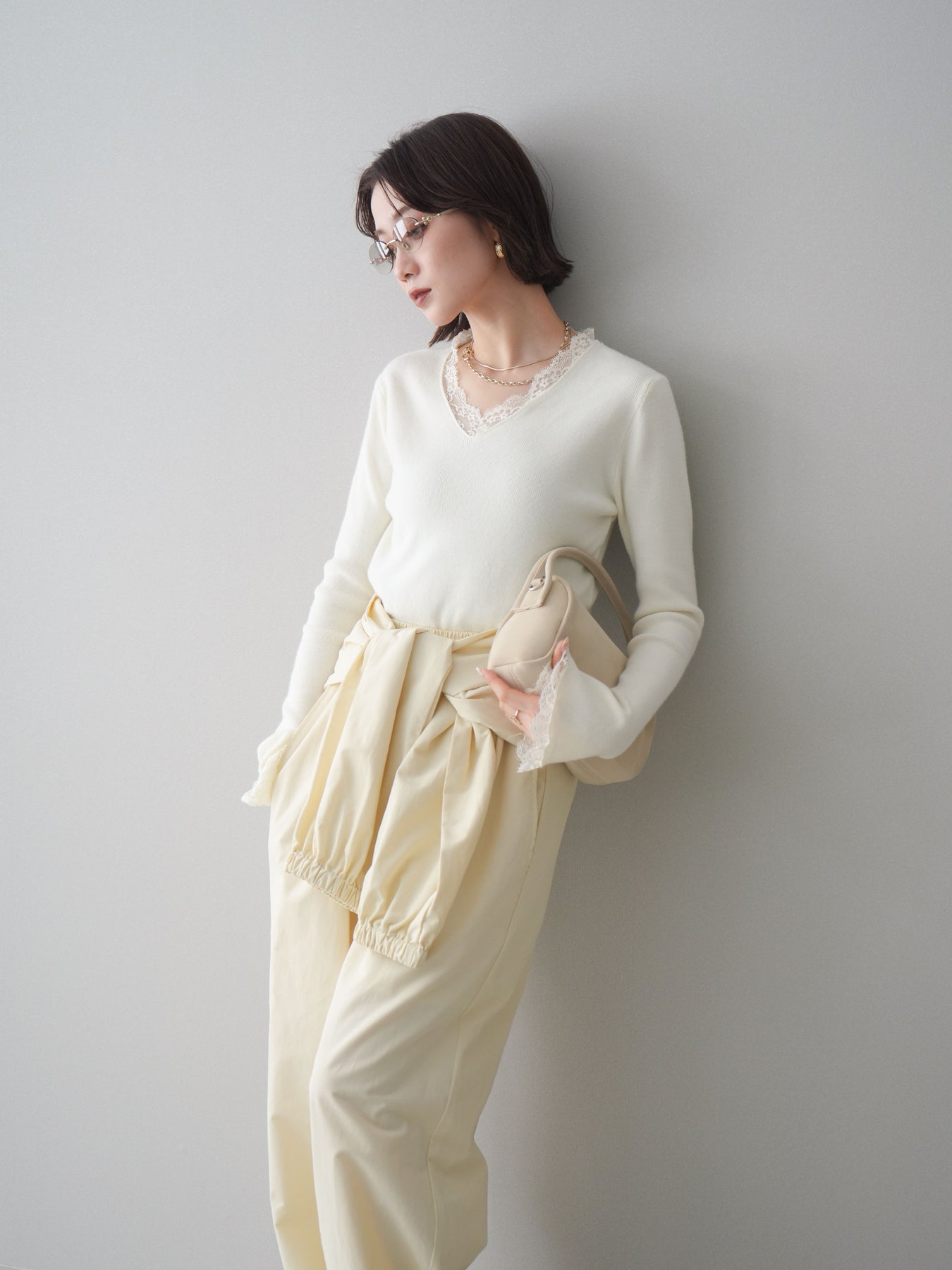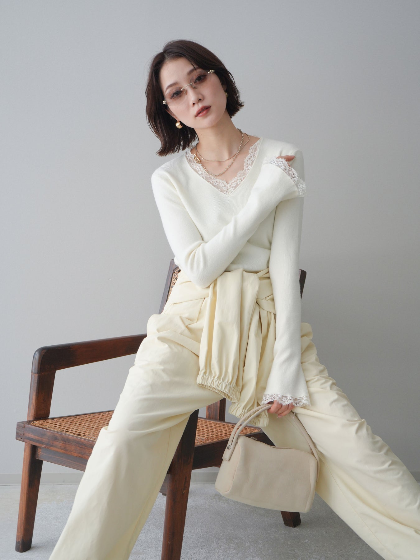 繊細なレースを重ねたVネックデザインが、さりげない表情を添えるニットトップス。 首元から覗くレースが上品な抜け感を生み、シンプルながらも印象に残る一枚です。 程よくフィットするシルエットで、ボトムスにインしてもアウトでもバランスよく着用可能。 ニットの柔らかな風合いとレースの軽やかさが調和し、デニムなどのカジュアルなアイテムと合わせても、どこか洗練された雰囲気にまとまります。 一枚着としてはもちろん、ジャケットやカーディガンのインナーとしても活躍するトップスです。 ※ボトムス、キャミソール(インナー)以外の商品は一律でインナーは付属していません。