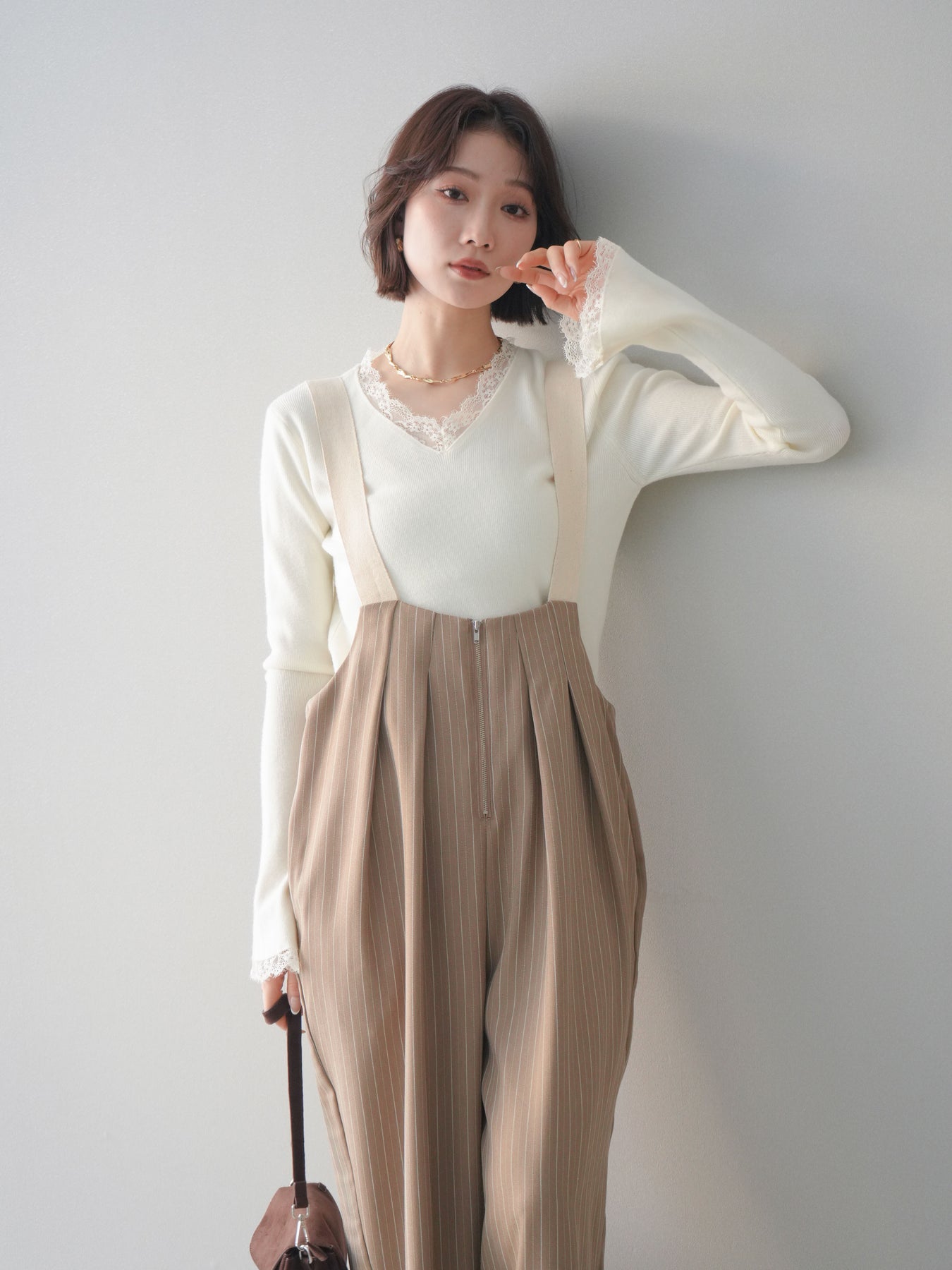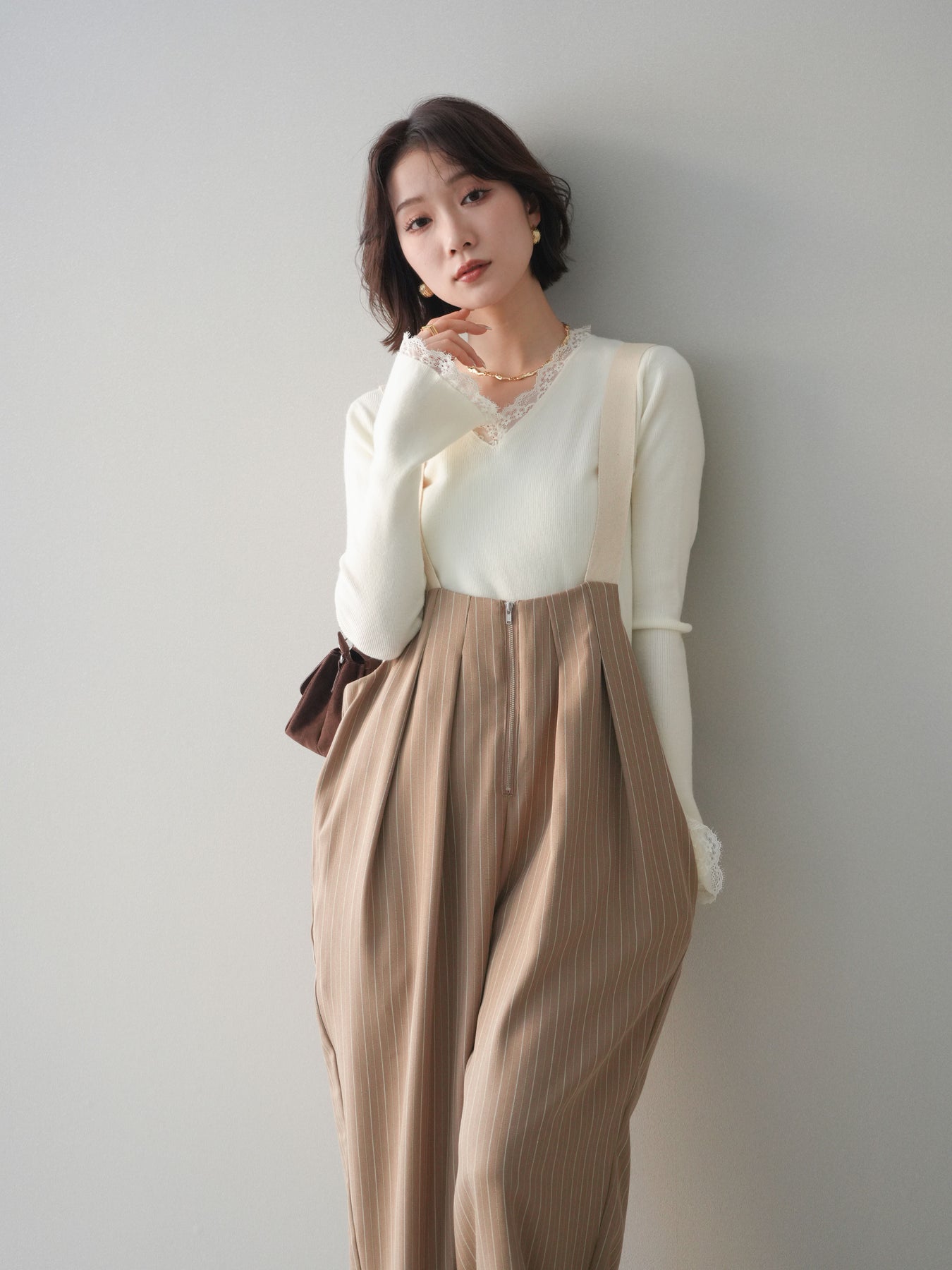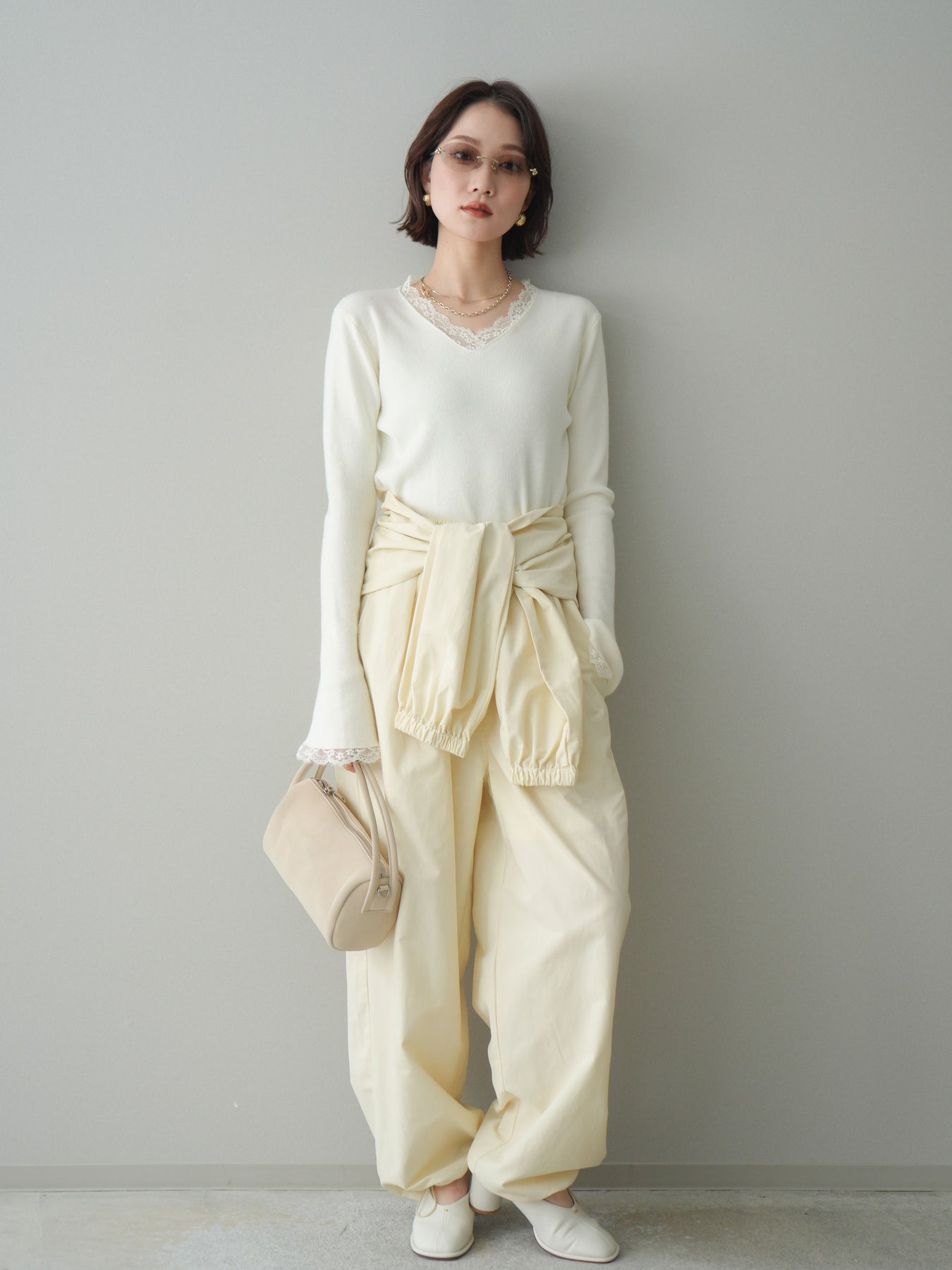 繊細なレースを重ねたVネックデザインが、さりげない表情を添えるニットトップス。 首元から覗くレースが上品な抜け感を生み、シンプルながらも印象に残る一枚です。 程よくフィットするシルエットで、ボトムスにインしてもアウトでもバランスよく着用可能。 ニットの柔らかな風合いとレースの軽やかさが調和し、デニムなどのカジュアルなアイテムと合わせても、どこか洗練された雰囲気にまとまります。 一枚着としてはもちろん、ジャケットやカーディガンのインナーとしても活躍するトップスです。 ※ボトムス、キャミソール(インナー)以外の商品は一律でインナーは付属していません。