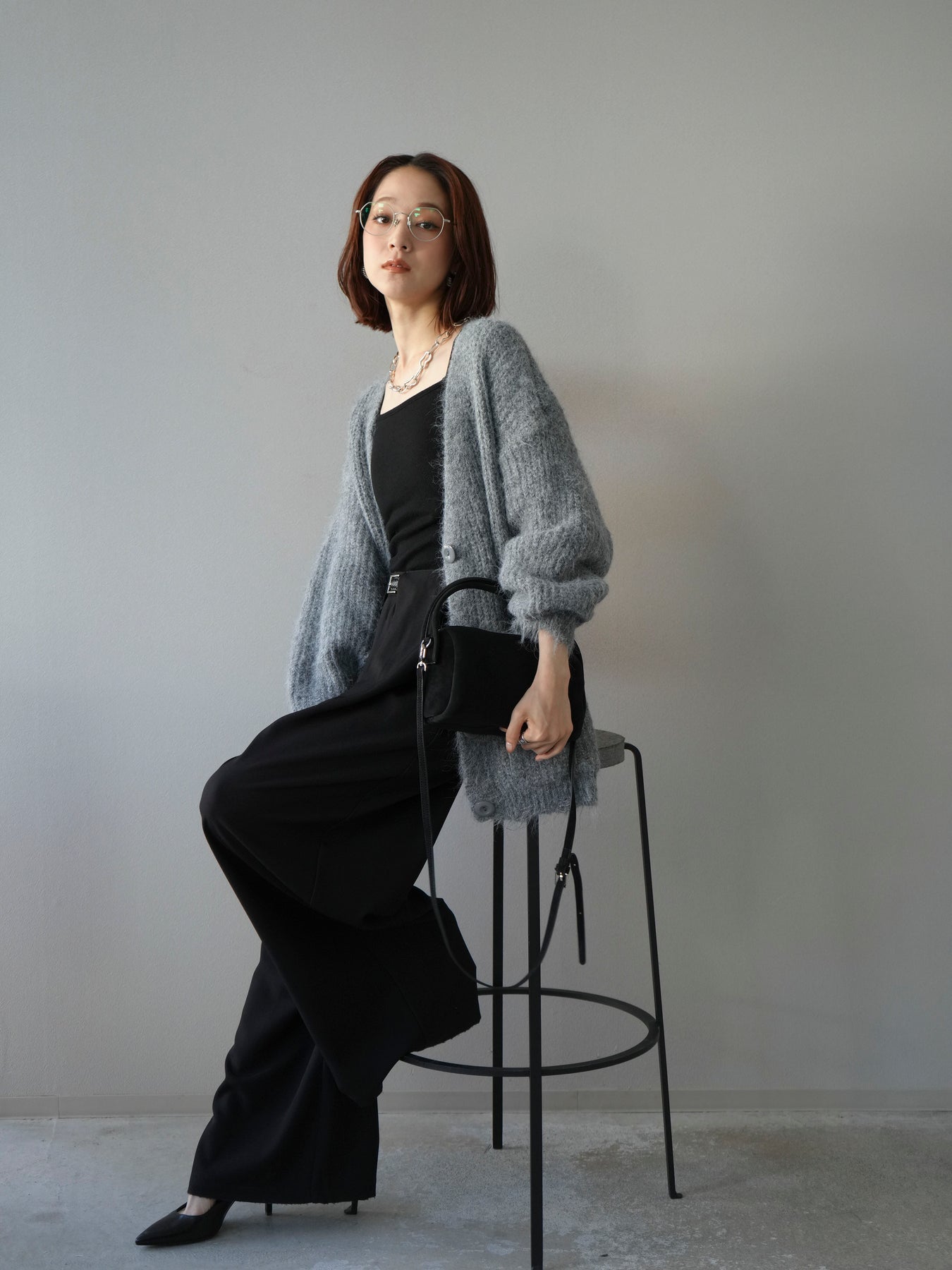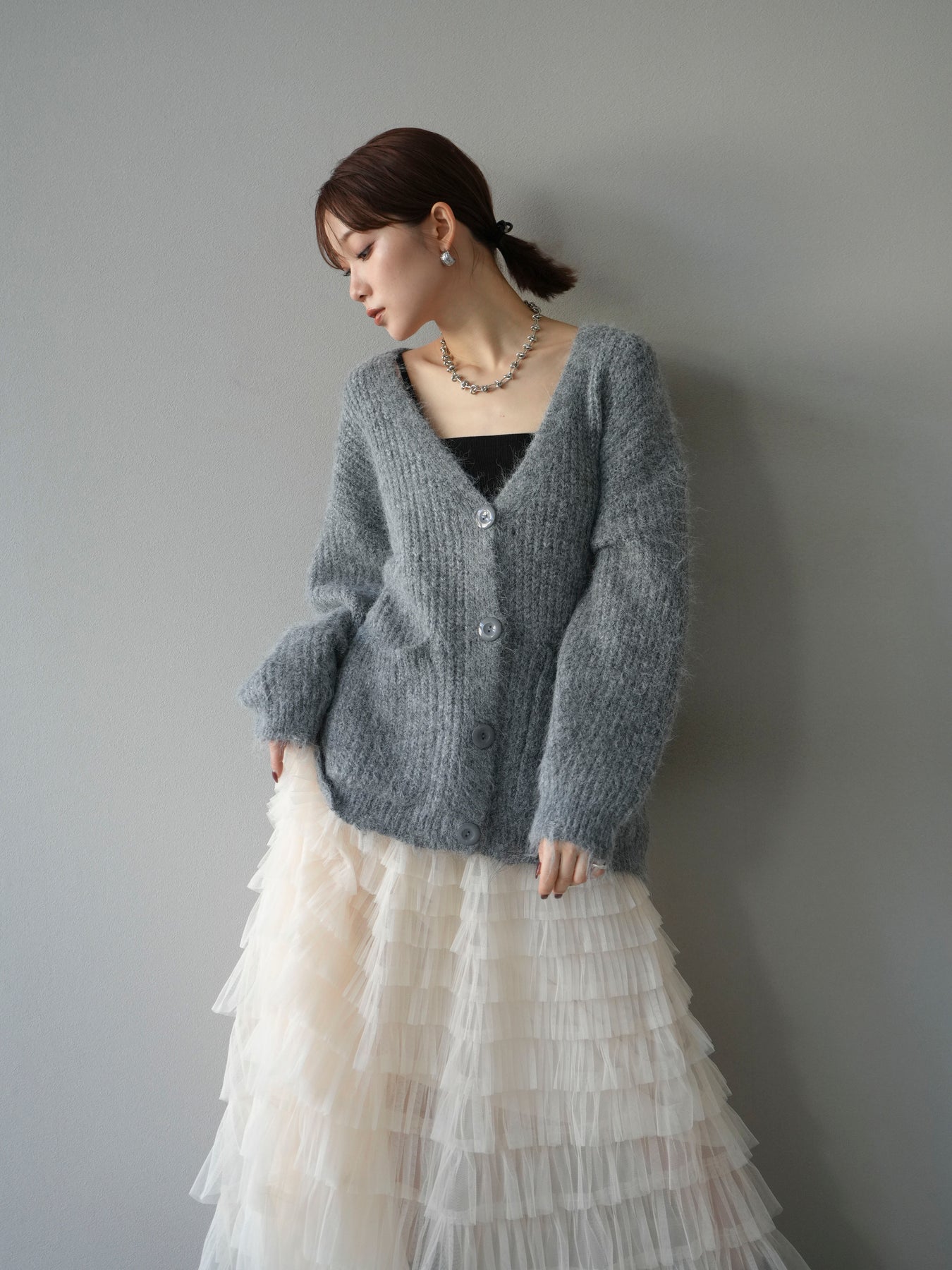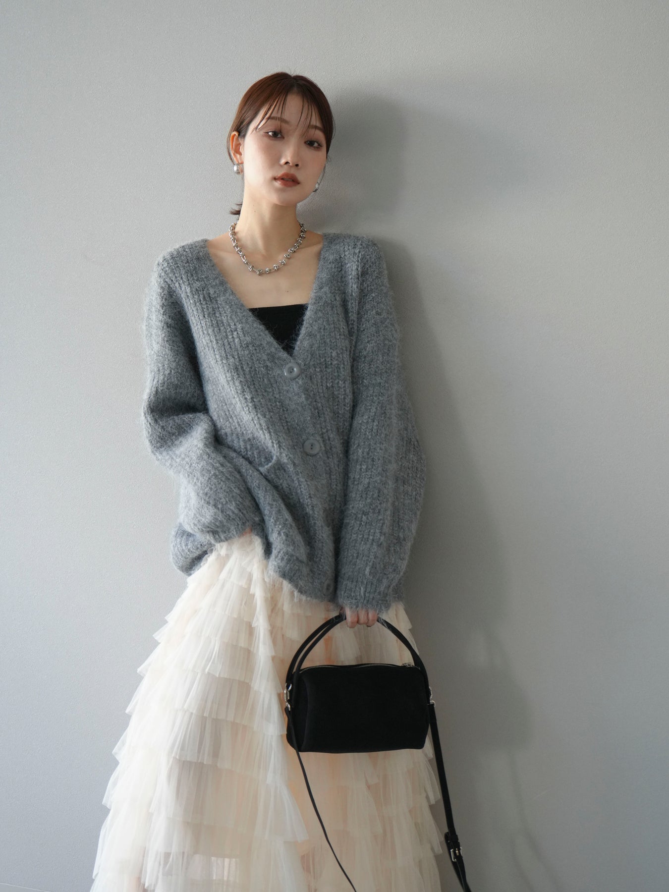 ふんわりとしたウール混素材を使用したオーバーニットカーディガン。柔らかな風合いと程よい毛足のある表情が、シーズンムードを高めてくれます。ゆったりとしたオーバーシルエットでリラックス感がありながらも、深めのVネックがすっきりとした印象をプラス。シンプルなデザインに大きめのボタンをあしらい、羽織るだけでこなれ感のあるスタイルが完成します。パンツにもスカートにも合わせやすく、デイリーから休日のお出かけまで幅広く活躍する一着です。 ※ボトムス、キャミソール(インナー)以外の商品は一律でインナーは付属していません。