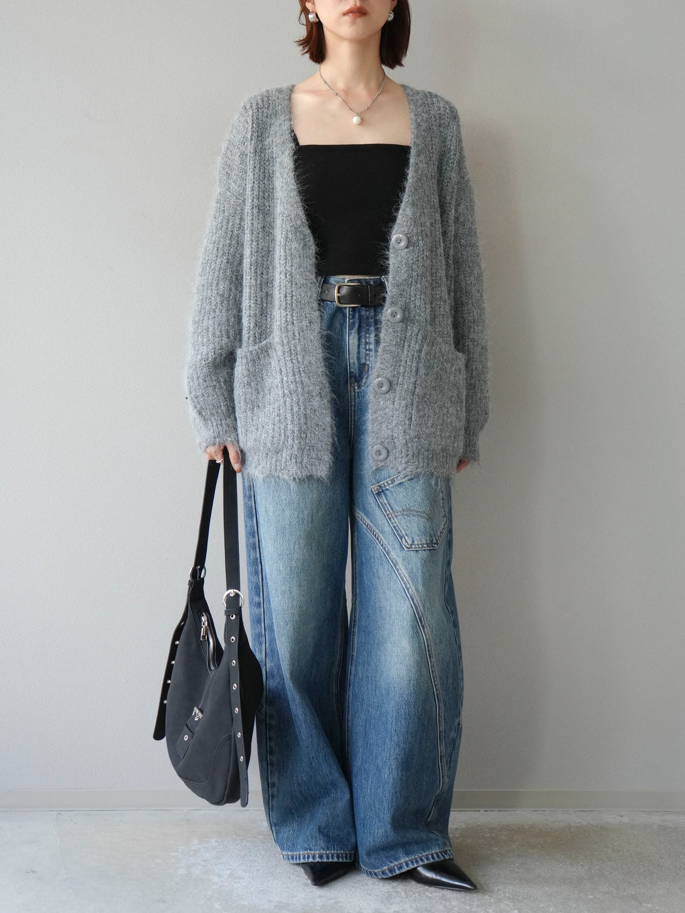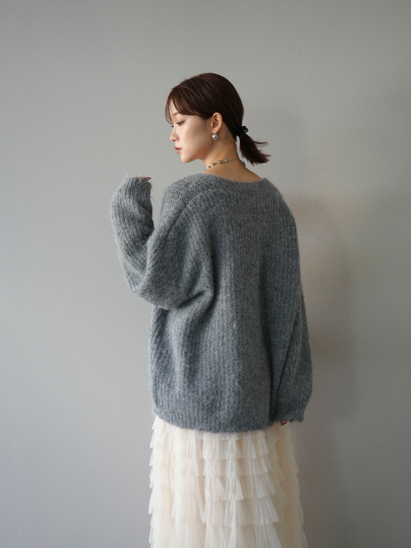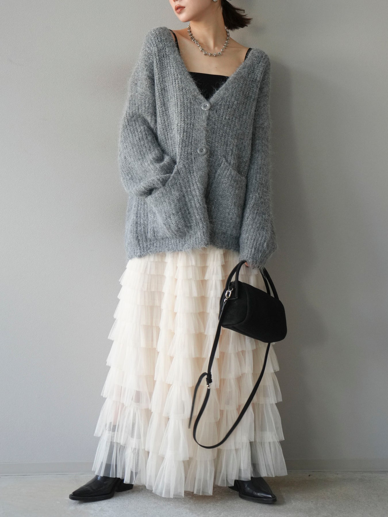 ふんわりとしたウール混素材を使用したオーバーニットカーディガン。柔らかな風合いと程よい毛足のある表情が、シーズンムードを高めてくれます。ゆったりとしたオーバーシルエットでリラックス感がありながらも、深めのVネックがすっきりとした印象をプラス。シンプルなデザインに大きめのボタンをあしらい、羽織るだけでこなれ感のあるスタイルが完成します。パンツにもスカートにも合わせやすく、デイリーから休日のお出かけまで幅広く活躍する一着です。 ※ボトムス、キャミソール(インナー)以外の商品は一律でインナーは付属していません。