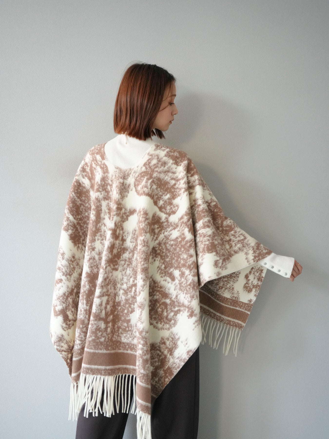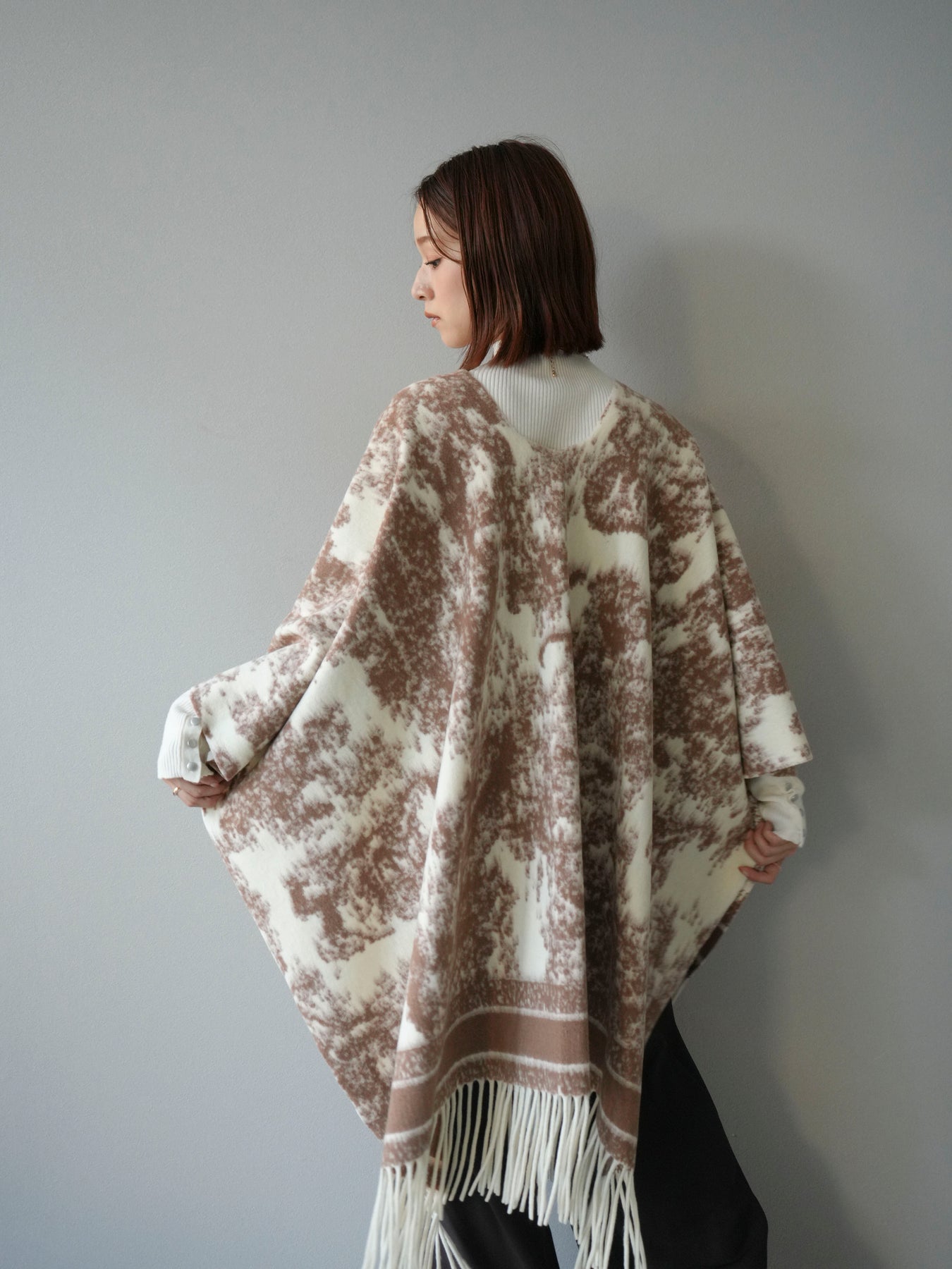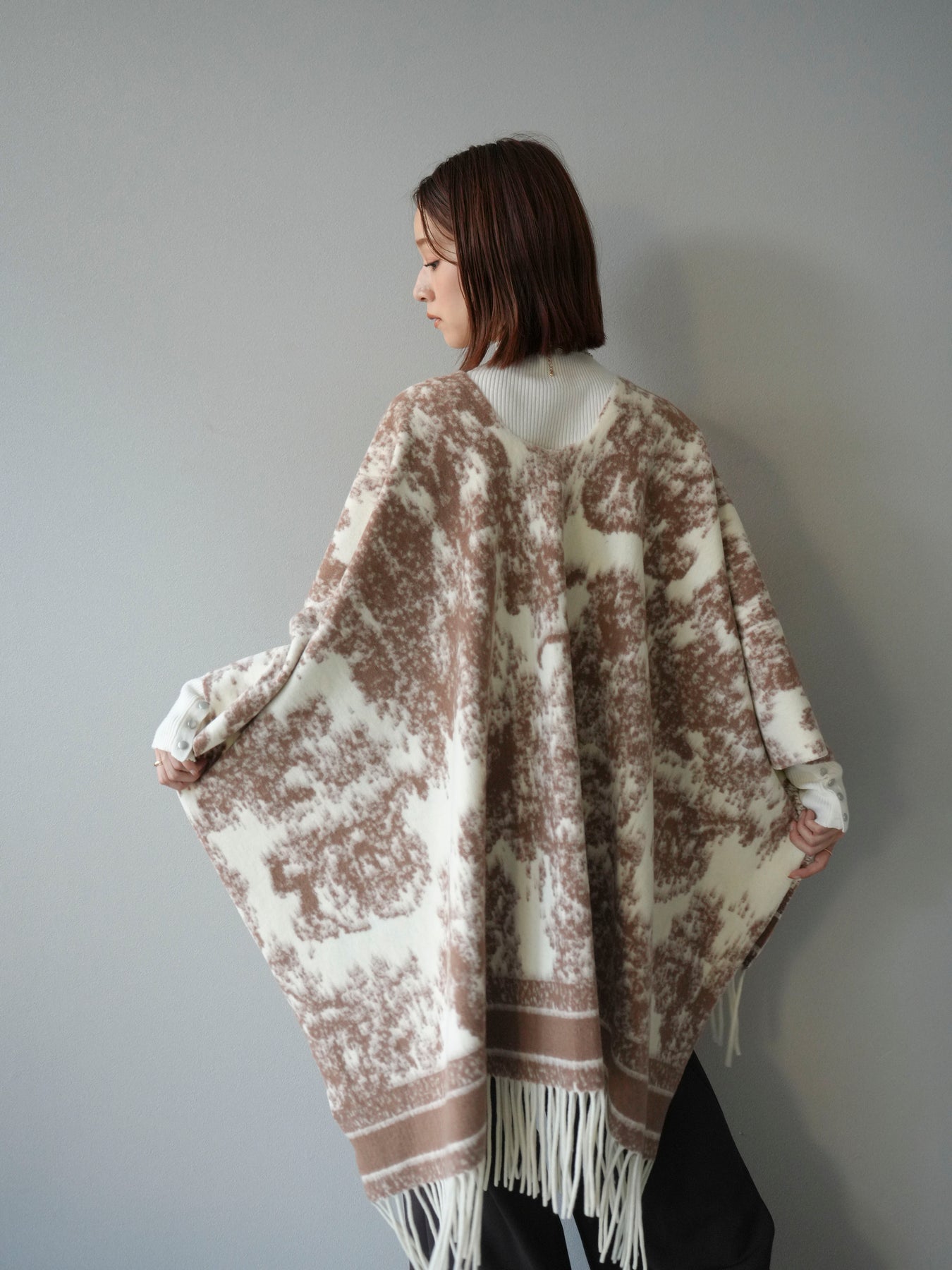 抽象的なアブストラクト柄が目を惹くストールポンチョ。やわらかな肌触りと程よいボリューム感で、羽織るだけでこなれた印象を演出します。両サイドにフリンジをあしらい、動きのあるデザインに仕上げました。肩からふんわりと掛けるだけで、コートいらずの軽やかなアウター代わりとしても活躍。デイリー使いはもちろん、旅行やお出かけにもぴったりな万能アイテムです。 ※ボトムス、キャミソール(インナー)以外の商品は一律でインナーは付属していません。
