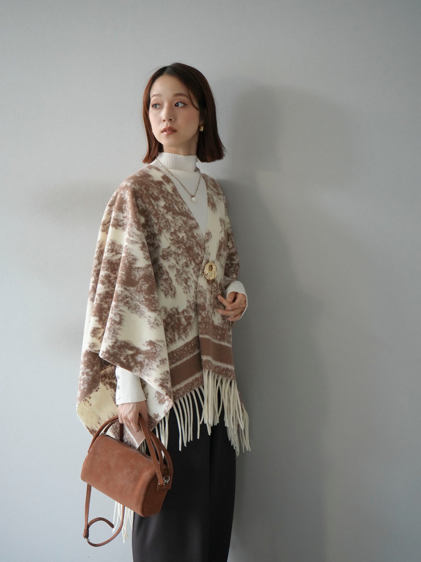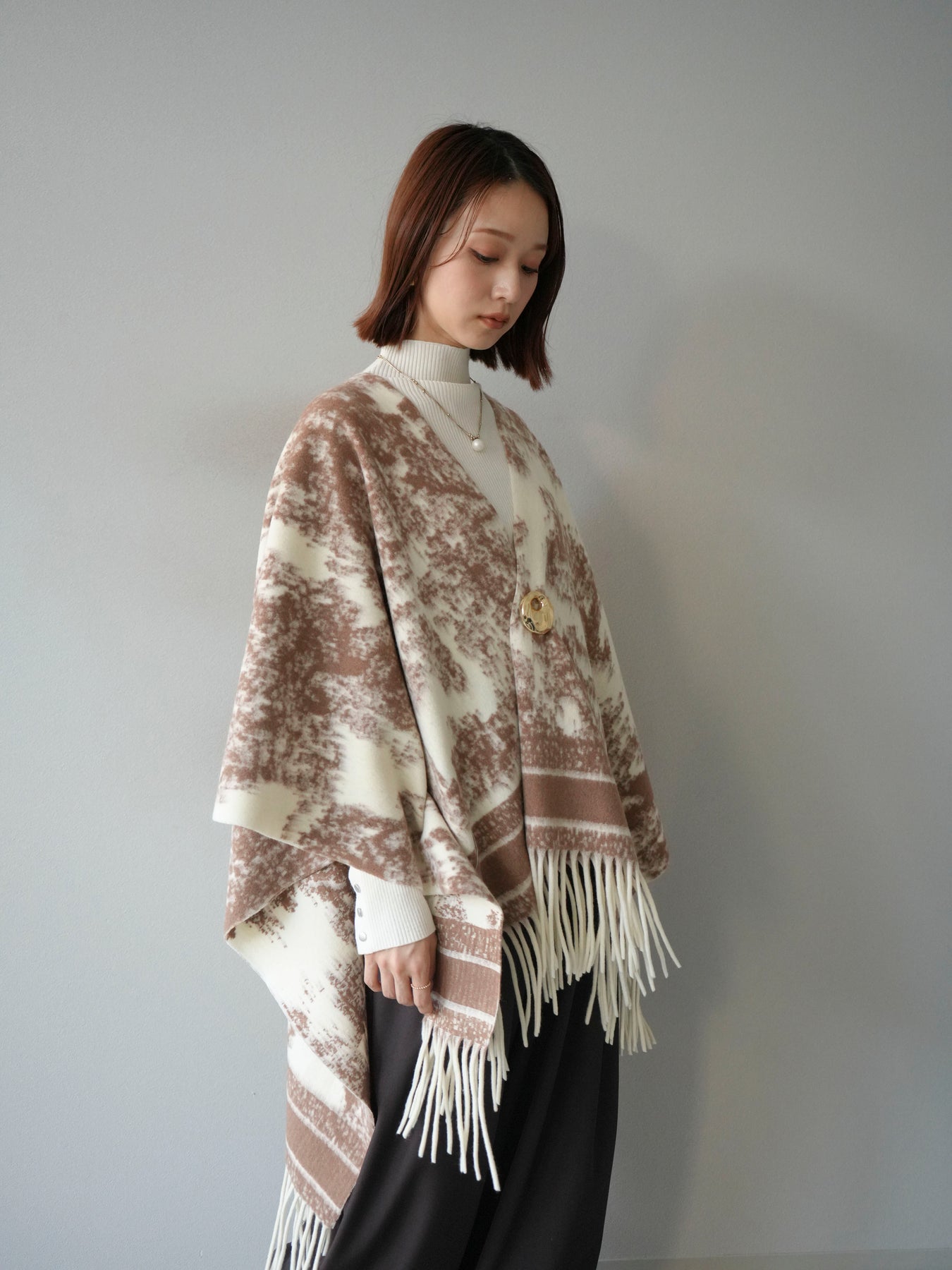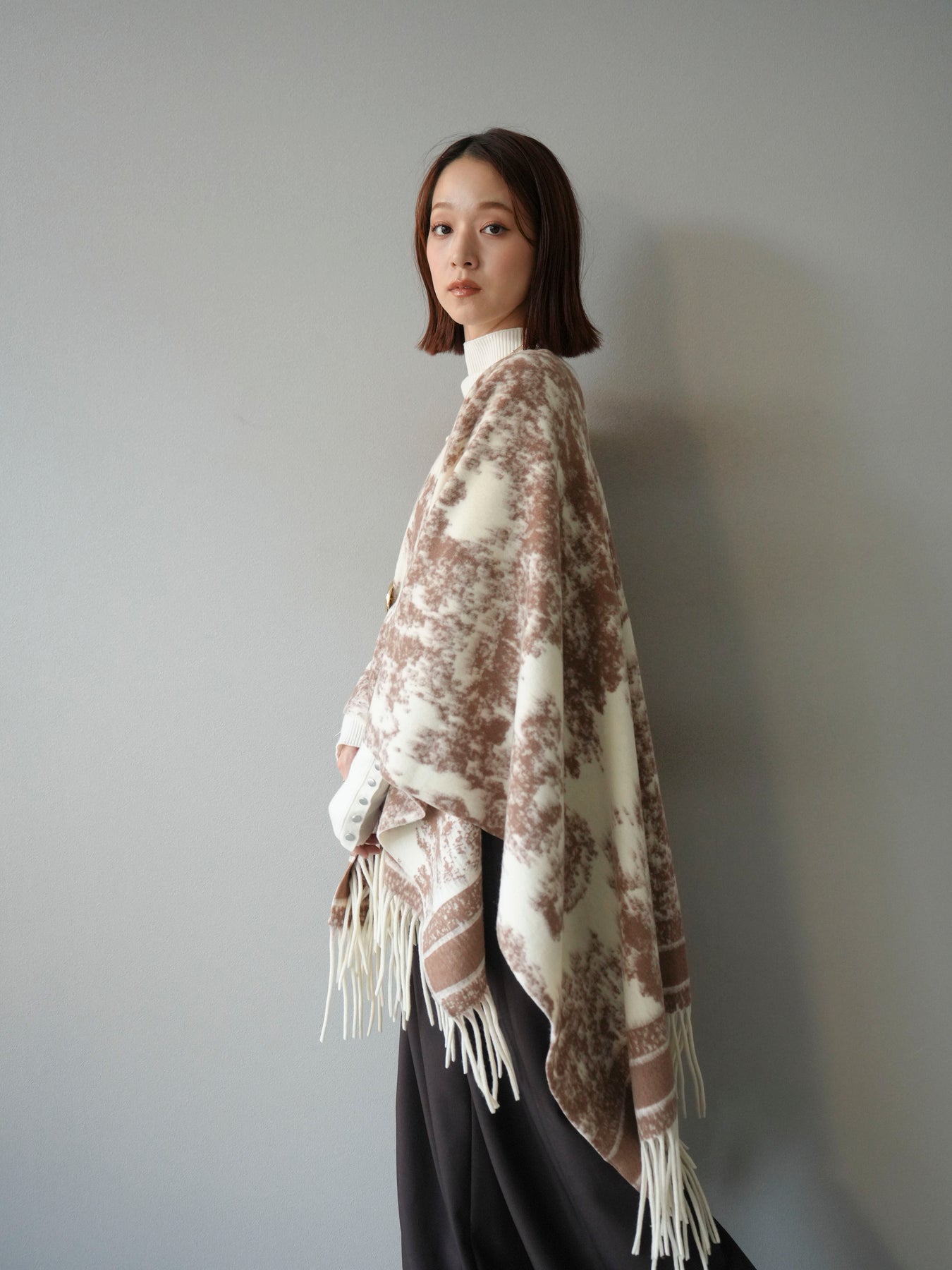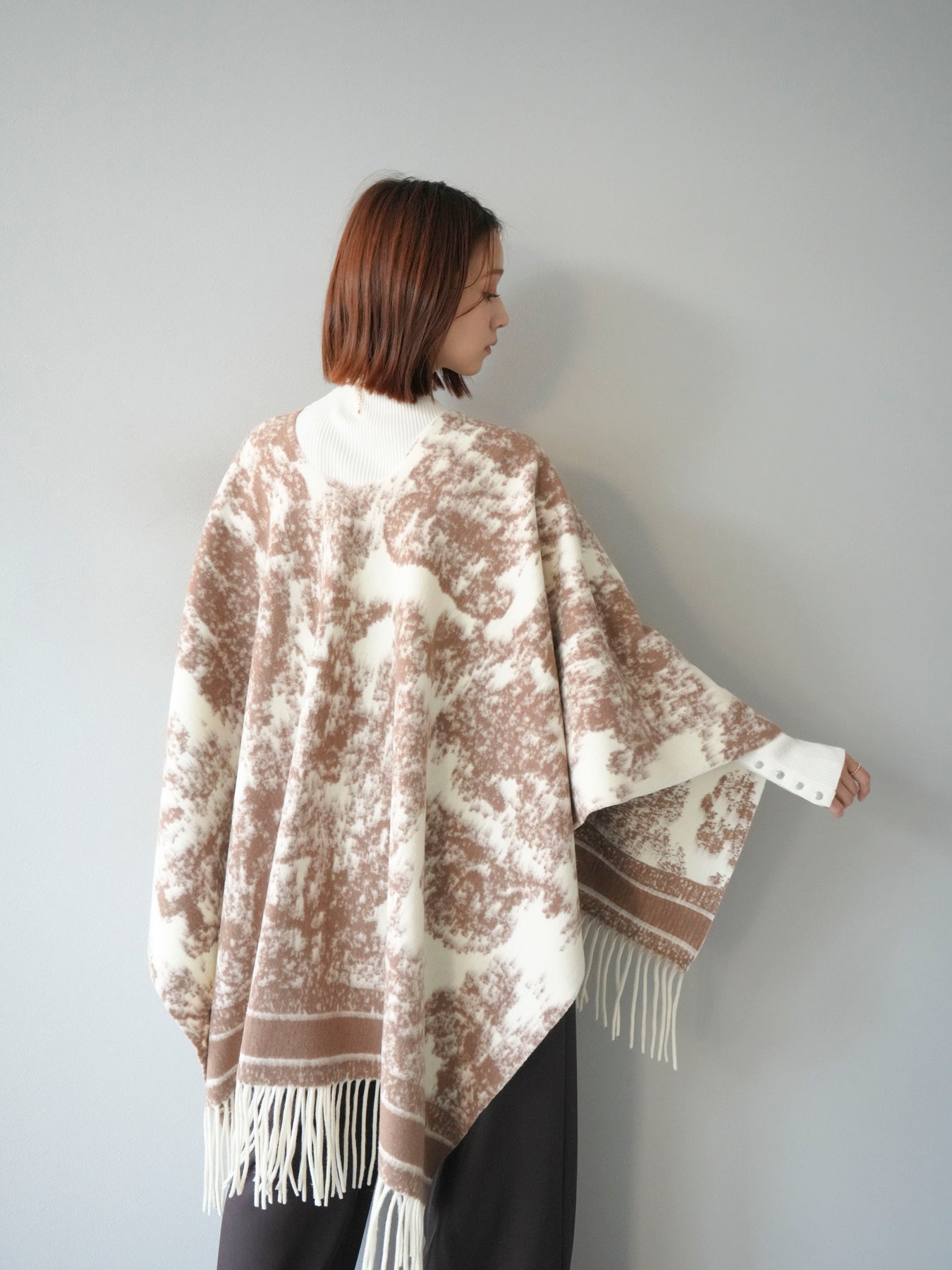 抽象的なアブストラクト柄が目を惹くストールポンチョ。やわらかな肌触りと程よいボリューム感で、羽織るだけでこなれた印象を演出します。両サイドにフリンジをあしらい、動きのあるデザインに仕上げました。肩からふんわりと掛けるだけで、コートいらずの軽やかなアウター代わりとしても活躍。デイリー使いはもちろん、旅行やお出かけにもぴったりな万能アイテムです。 ※ボトムス、キャミソール(インナー)以外の商品は一律でインナーは付属していません。