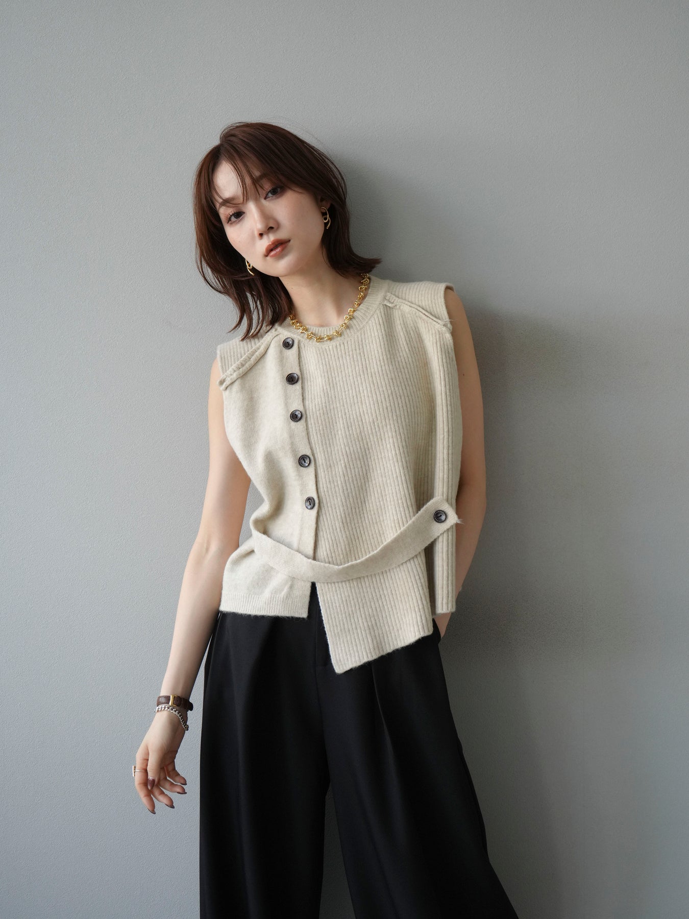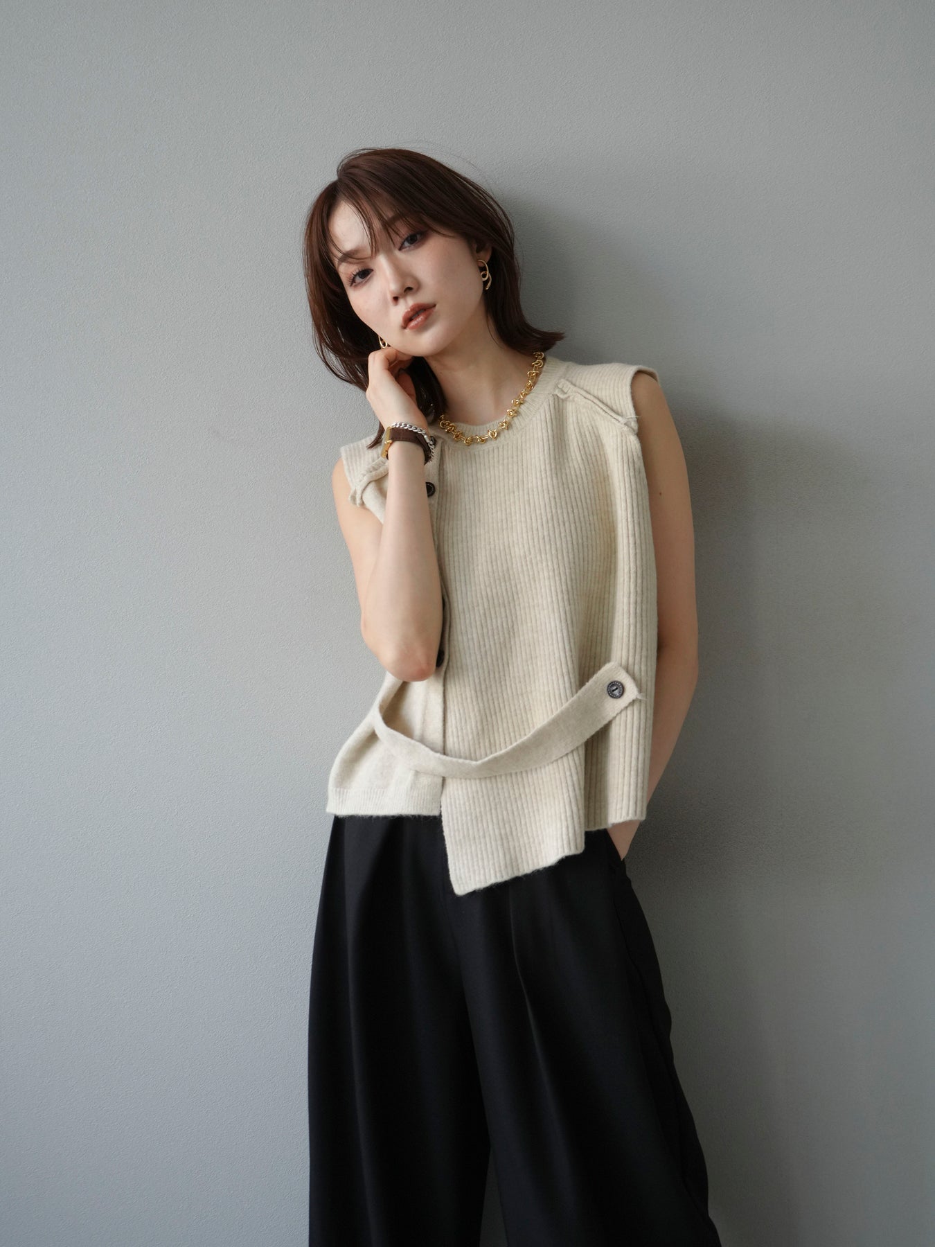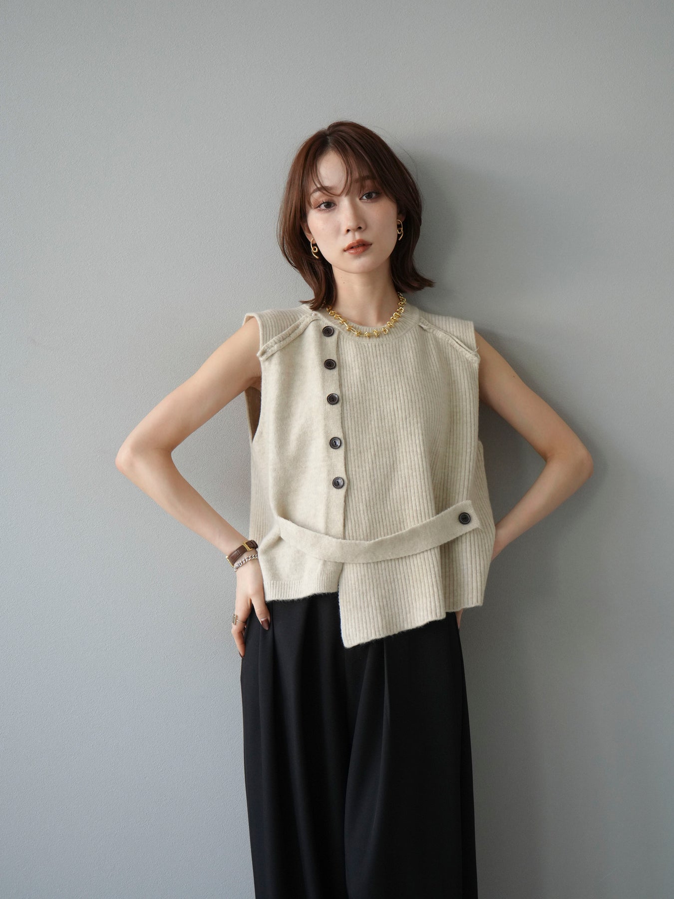 サイドとショルダーにボタンディテールをあしらった、レイヤードデザインのニットベスト。リブ編みの縦ラインがすっきりとした印象を与え、シンプルながらもこなれた雰囲気に仕上げます。程よい厚みでインナーにシャツやカットソーを合わせやすく、季節の変わり目にも活躍。ボタンの開閉によってシルエットの変化も楽しめる一枚です。ベーシックながら着映えする万能アイテム。 ※ボトムス、キャミソール(インナー)以外の商品は一律でインナーは付属していません。