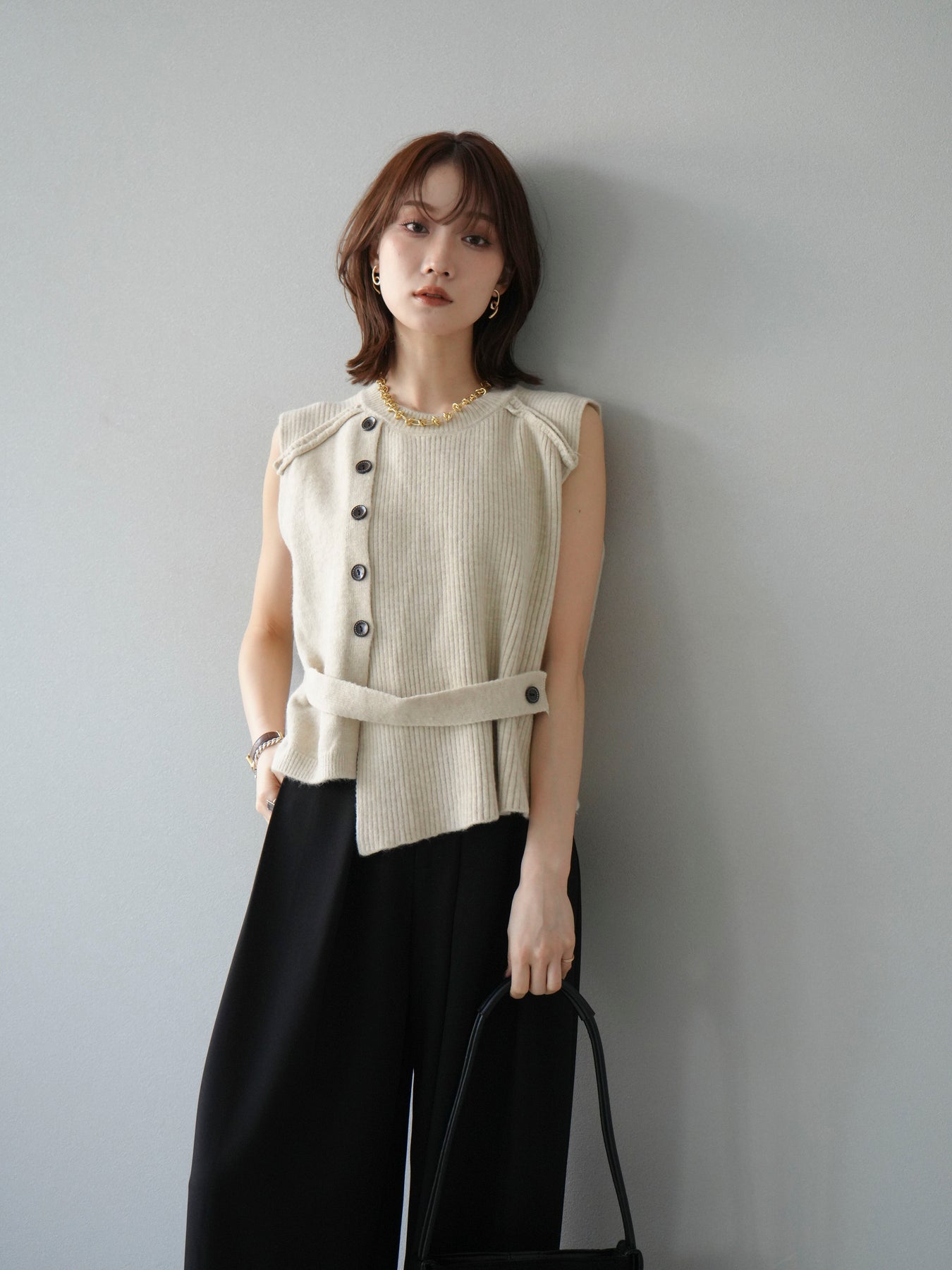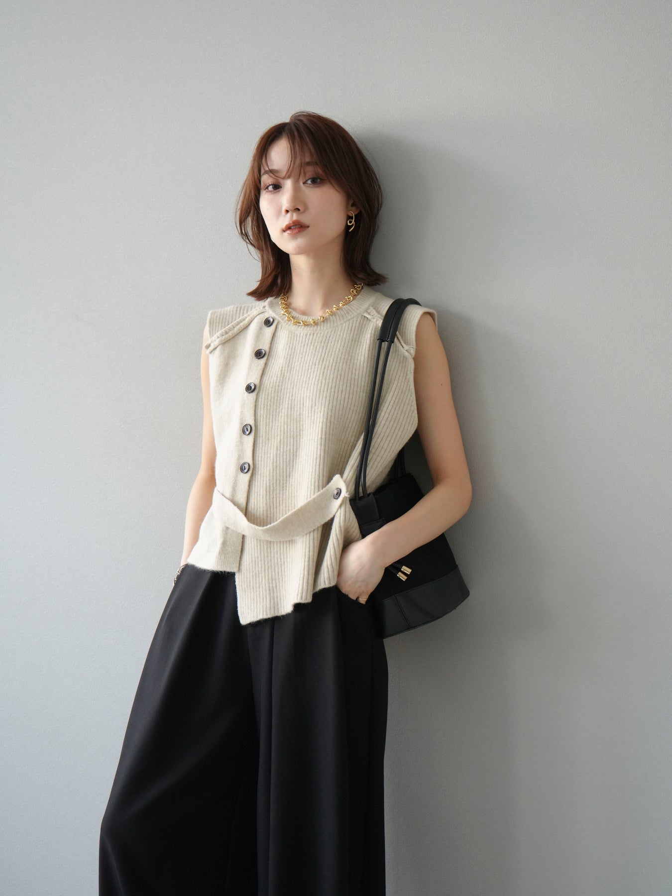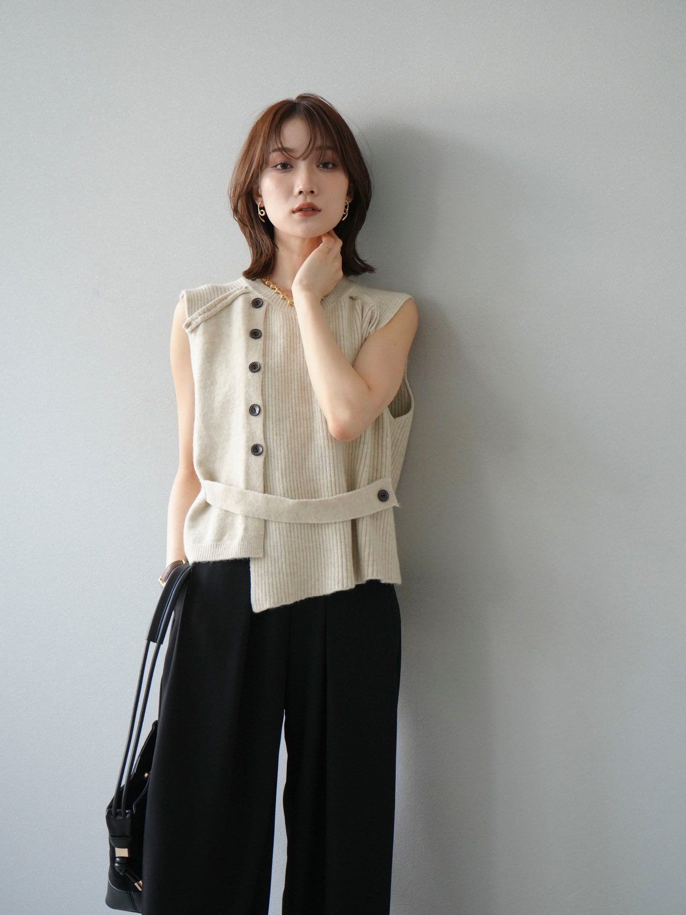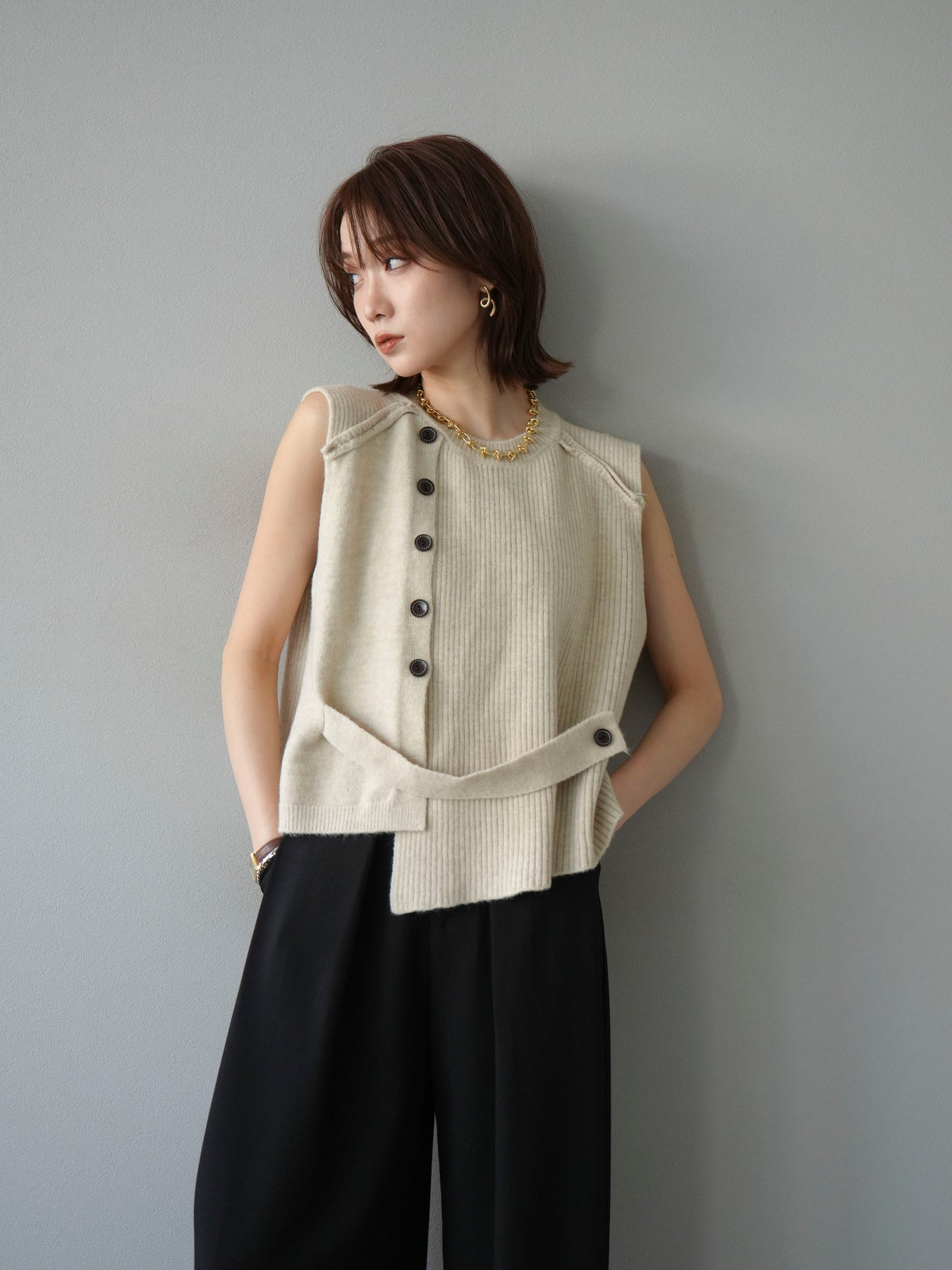 サイドとショルダーにボタンディテールをあしらった、レイヤードデザインのニットベスト。リブ編みの縦ラインがすっきりとした印象を与え、シンプルながらもこなれた雰囲気に仕上げます。程よい厚みでインナーにシャツやカットソーを合わせやすく、季節の変わり目にも活躍。ボタンの開閉によってシルエットの変化も楽しめる一枚です。ベーシックながら着映えする万能アイテム。 ※ボトムス、キャミソール(インナー)以外の商品は一律でインナーは付属していません。