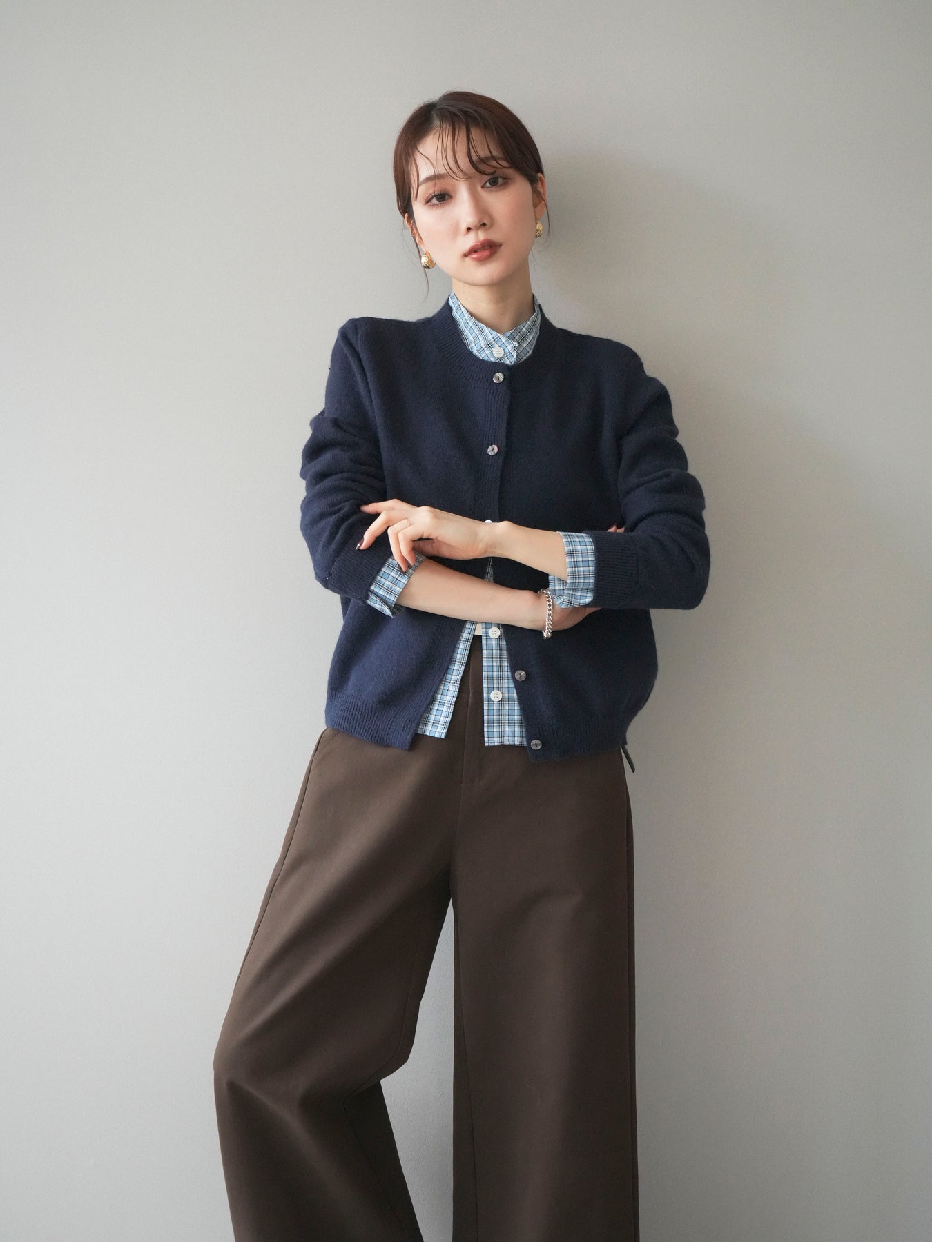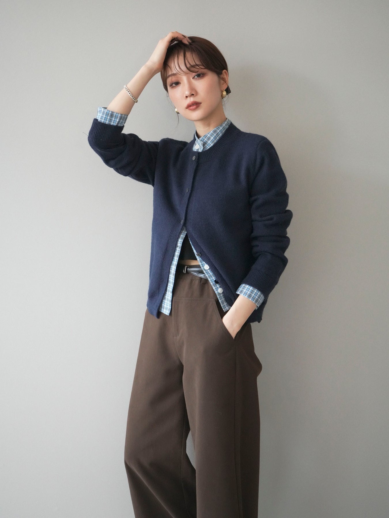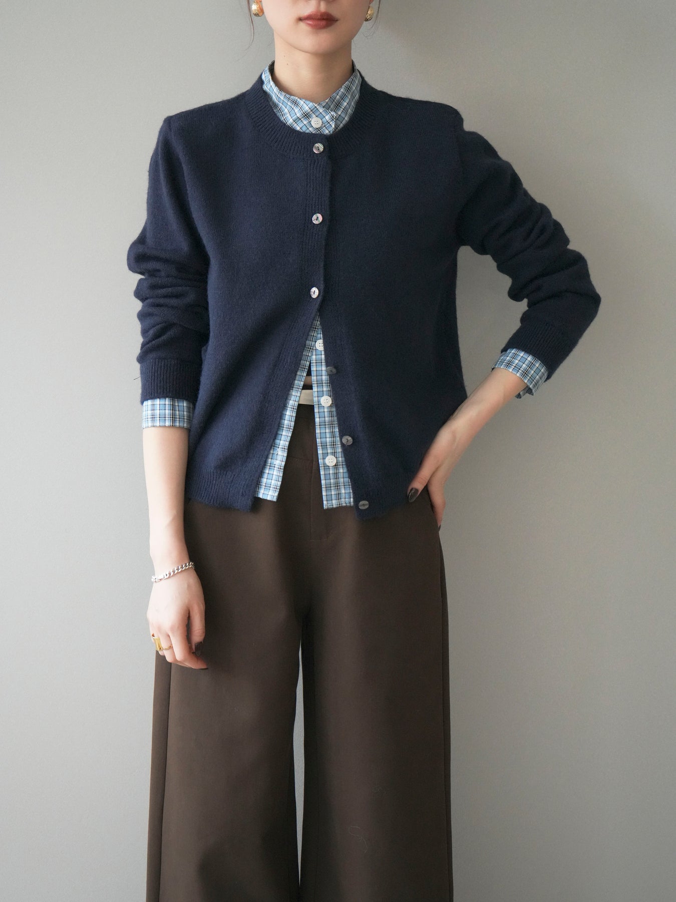 [予約]チェックシャツレイヤードデザインニットカーディガン/navy