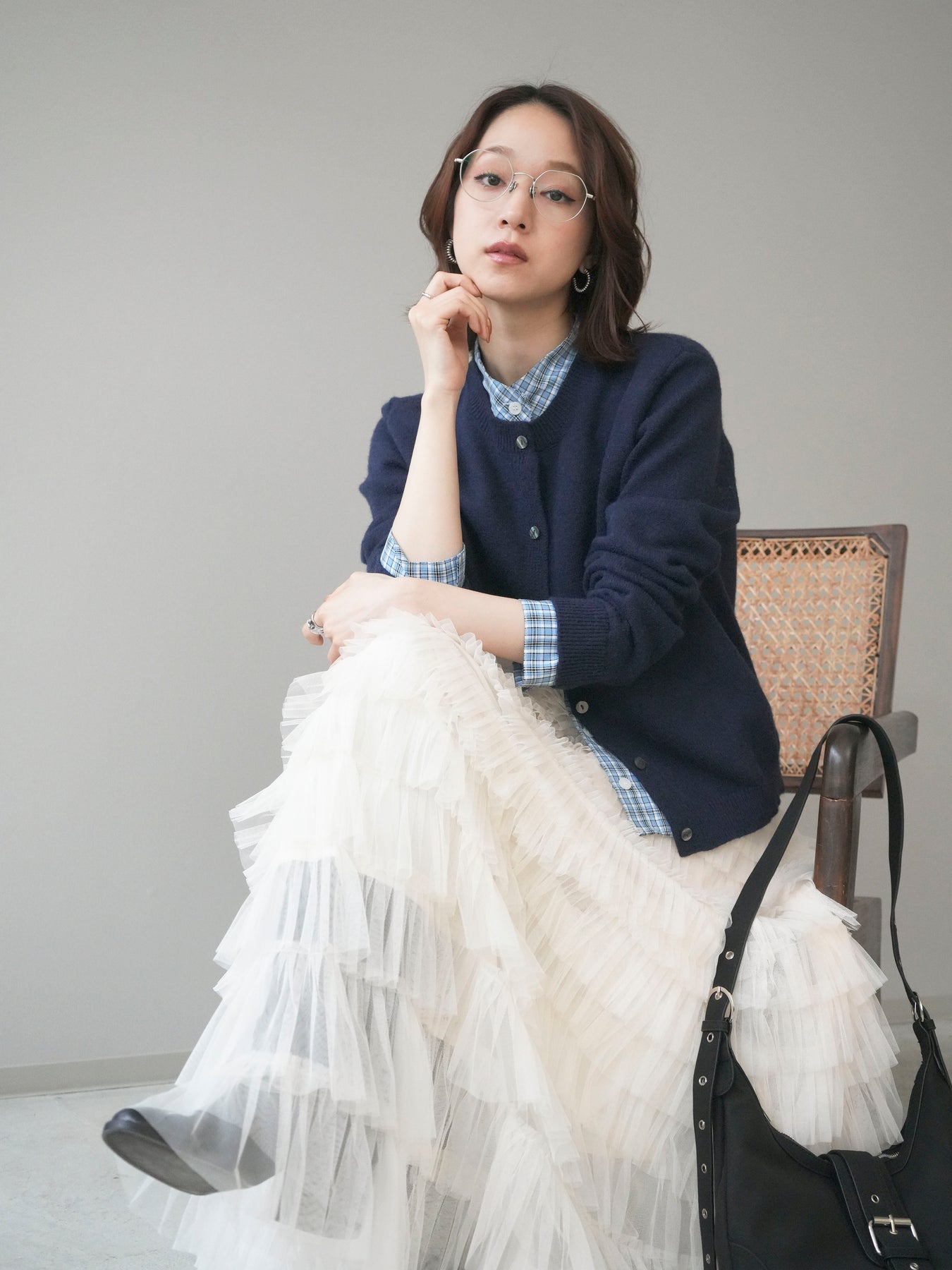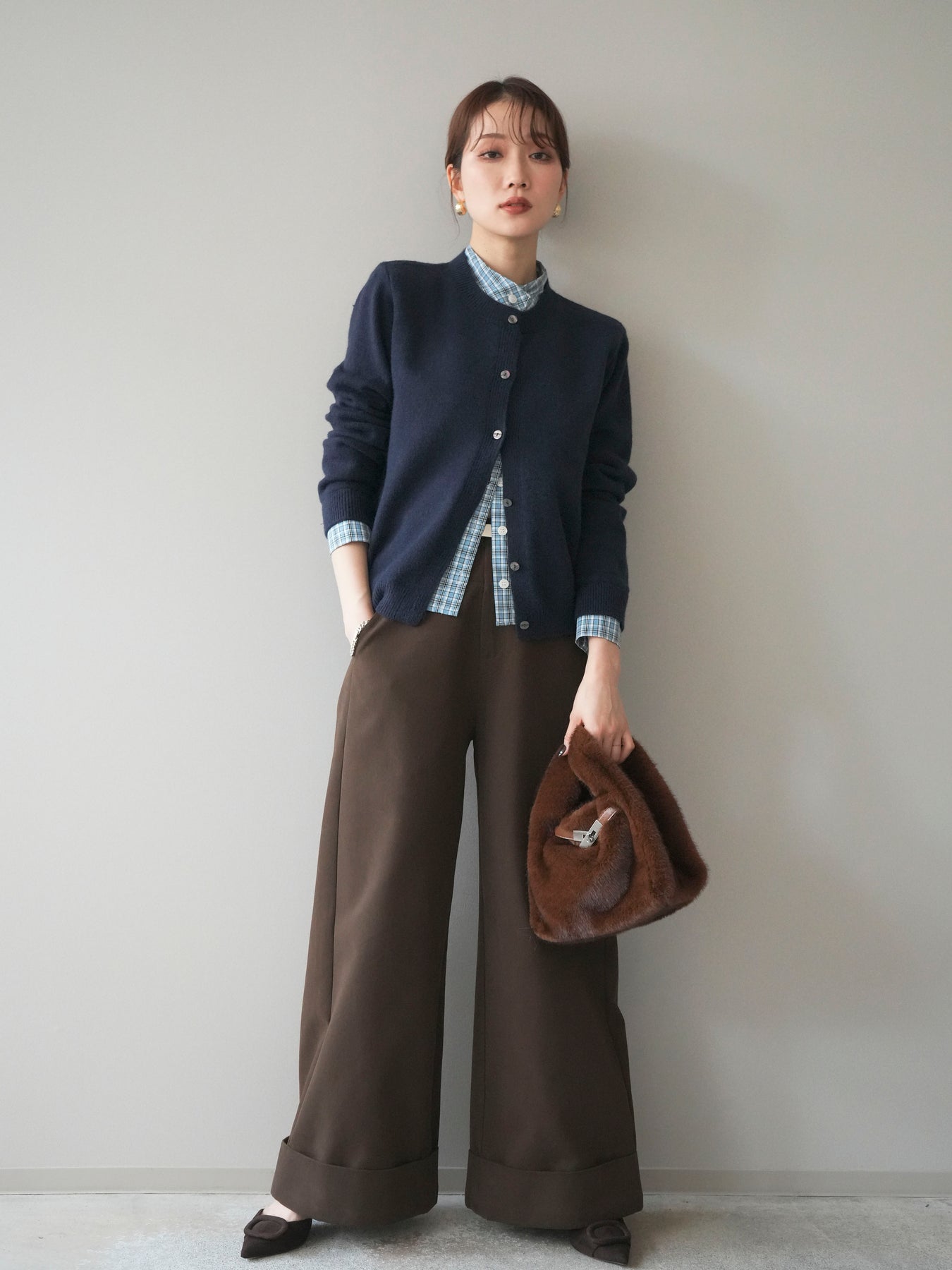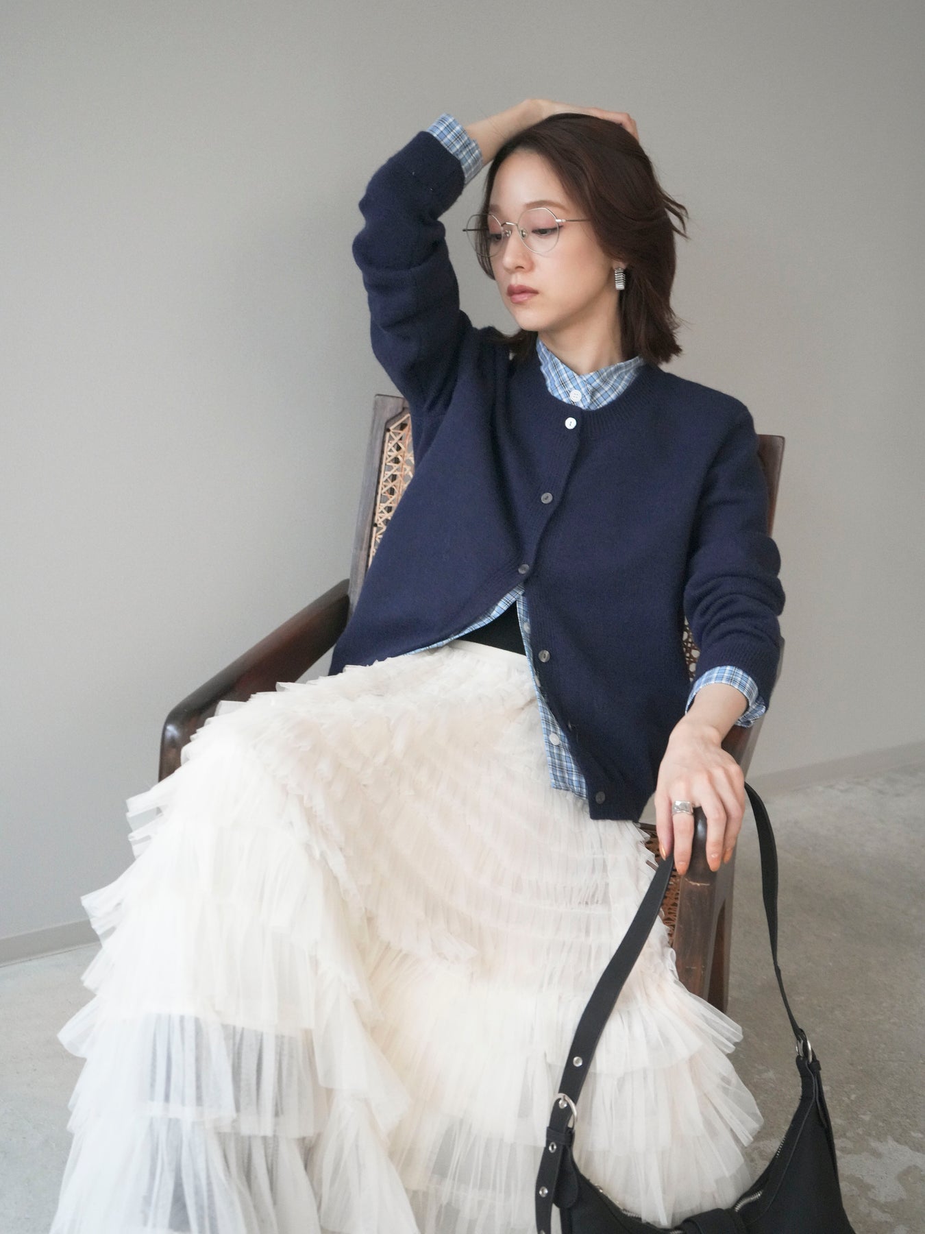 [予約]チェックシャツレイヤードデザインニットカーディガン/navy