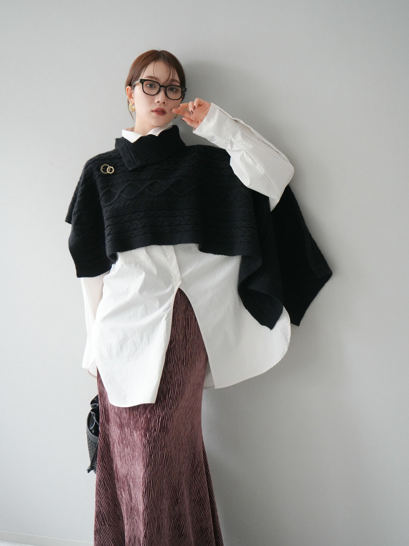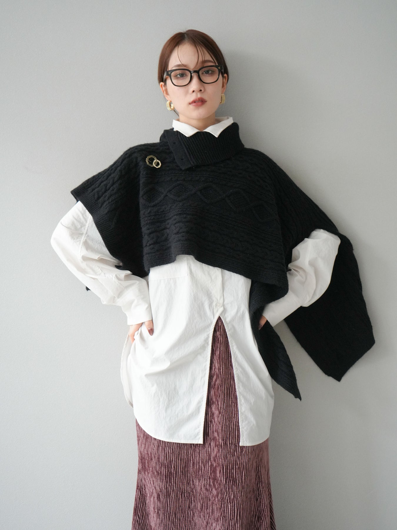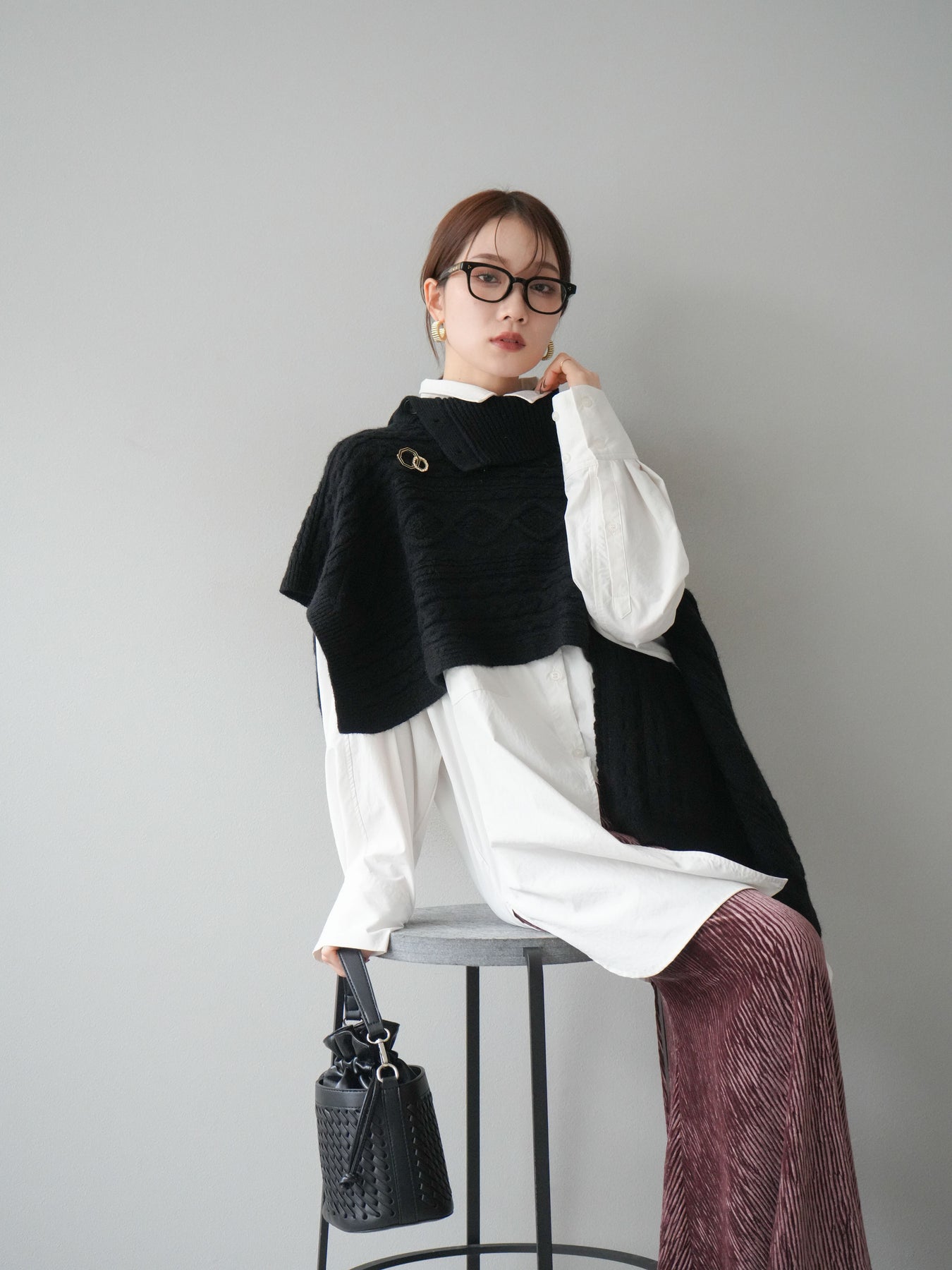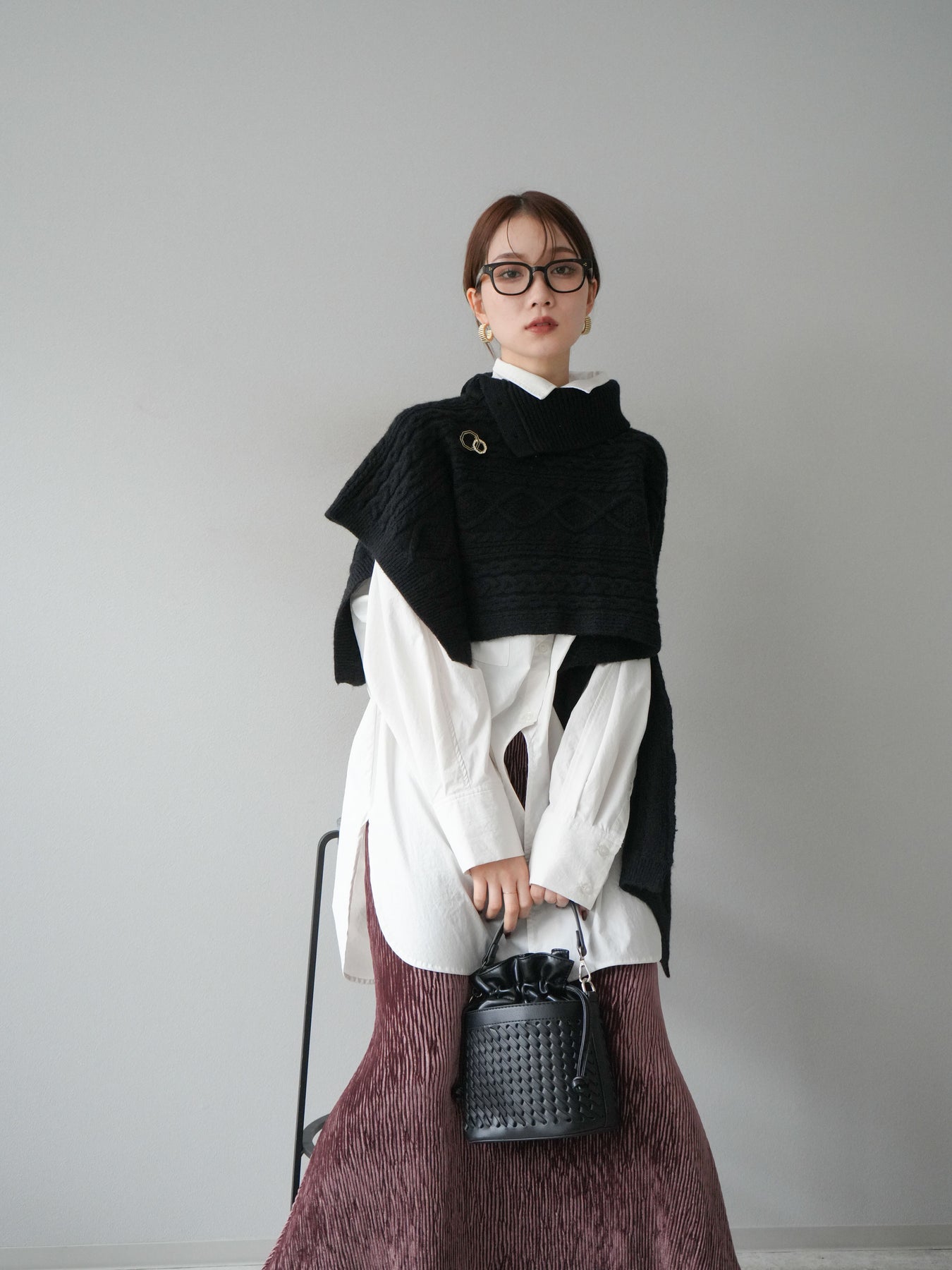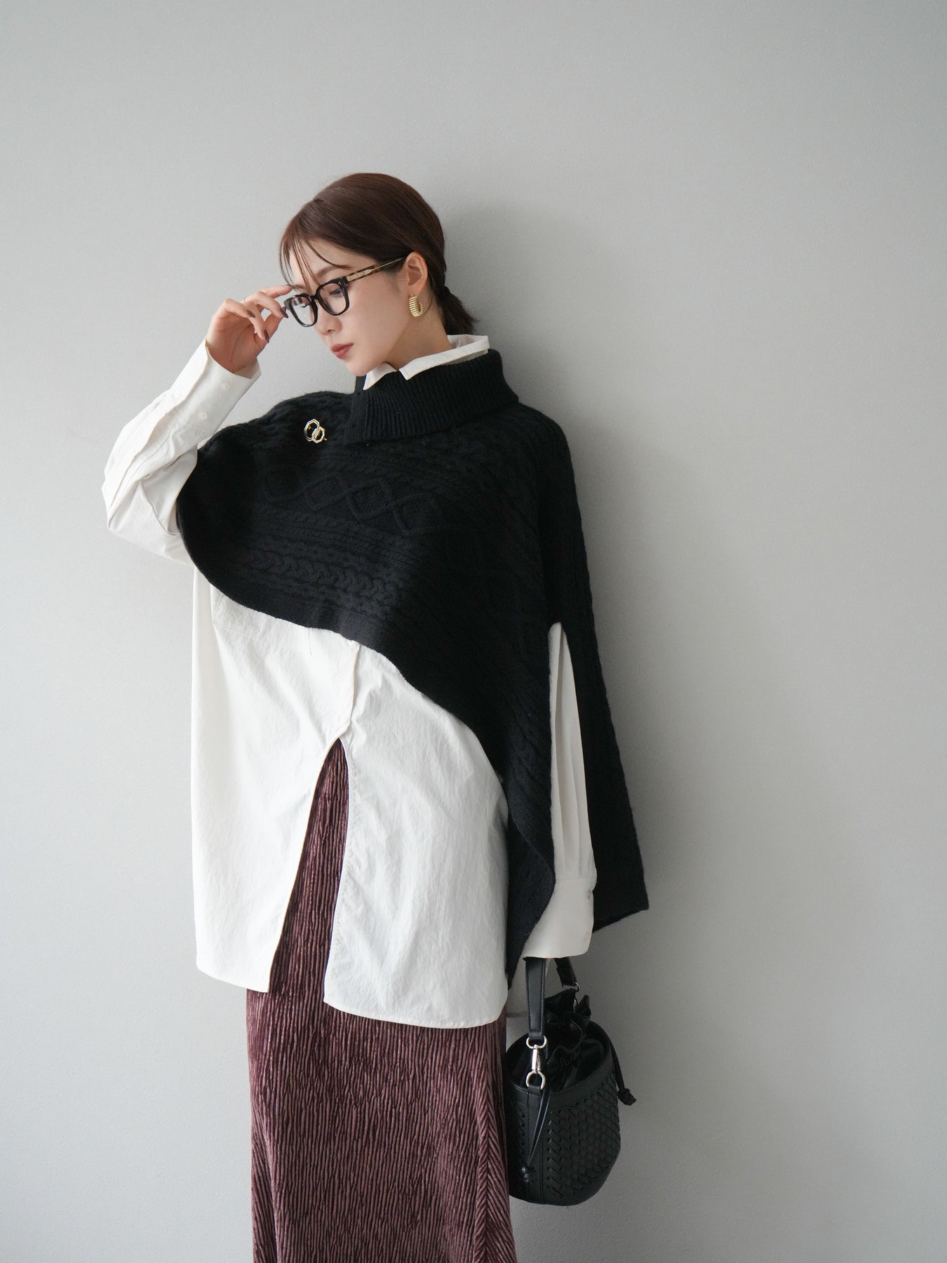立体感のあるケーブル編みが目を惹くニットケープ。柔らかな風合いと程よいボリューム感で、羽織るだけでシーズンムードを高めてくれます。肩を包み込むようなシルエットが女性らしく、シャツやタートルネックに重ねるだけでこなれた印象に。襟付きデザインが上品さをプラスし、カジュアルにもきれいめにも合わせやすい万能アイテムです。ライトアウター感覚で着られる、秋冬のレイヤードスタイルにぴったりな一枚。 ※ボトムス、キャミソール(インナー)以外の商品は一律でインナーは付属していません。