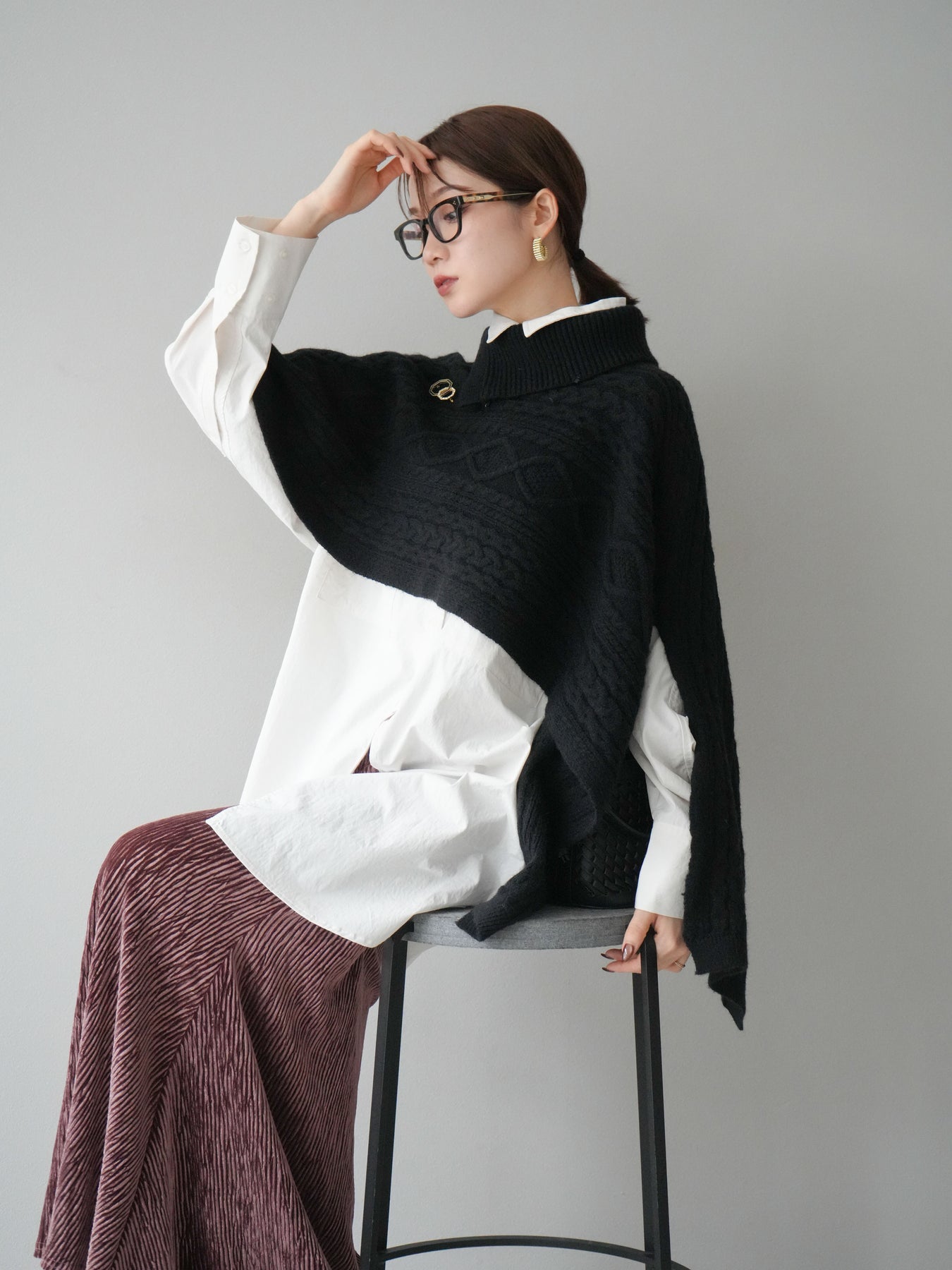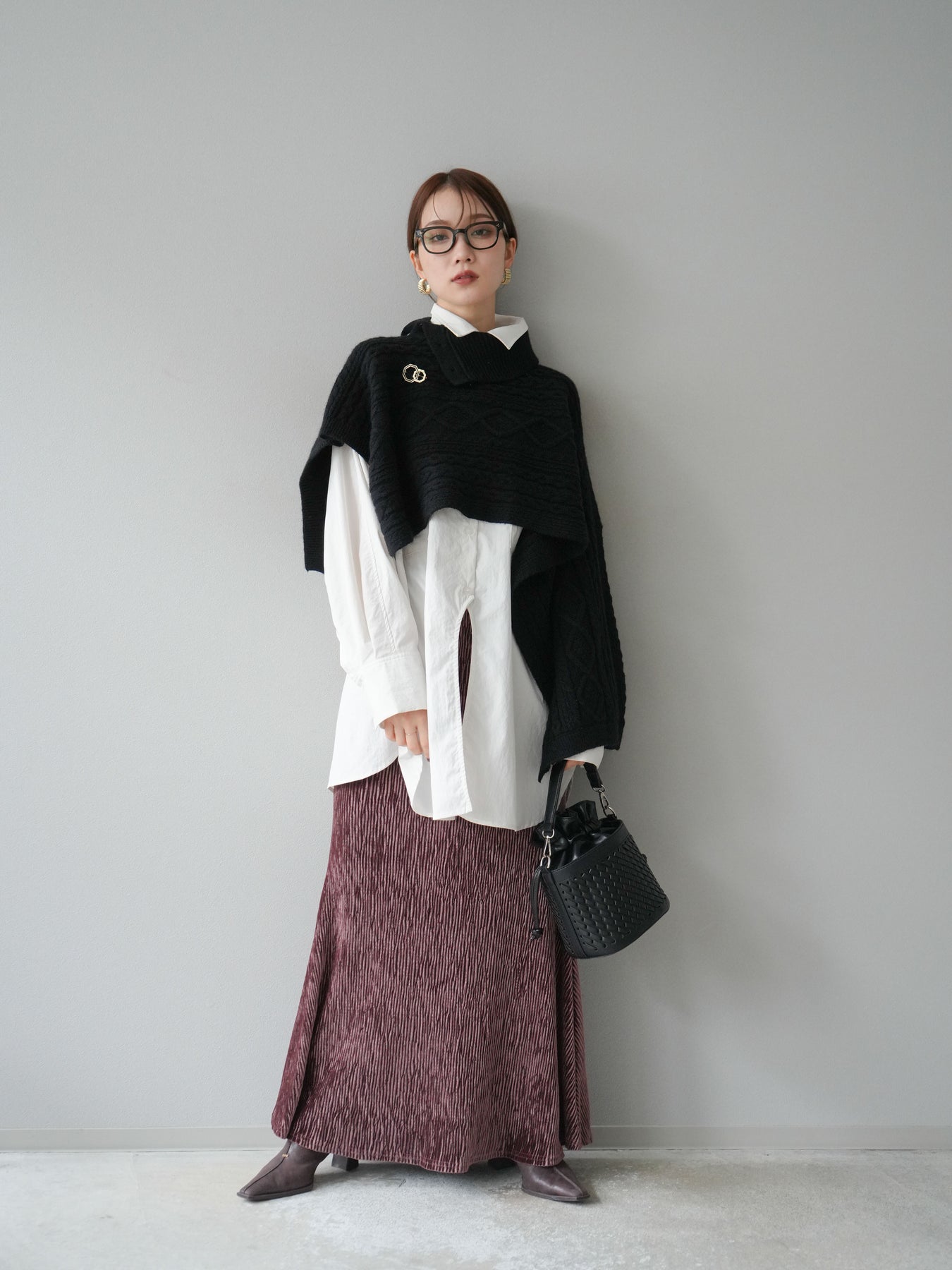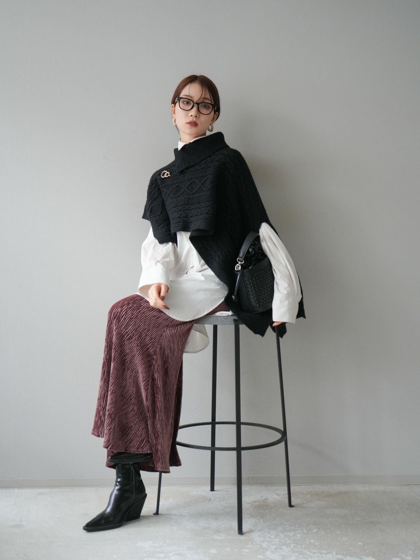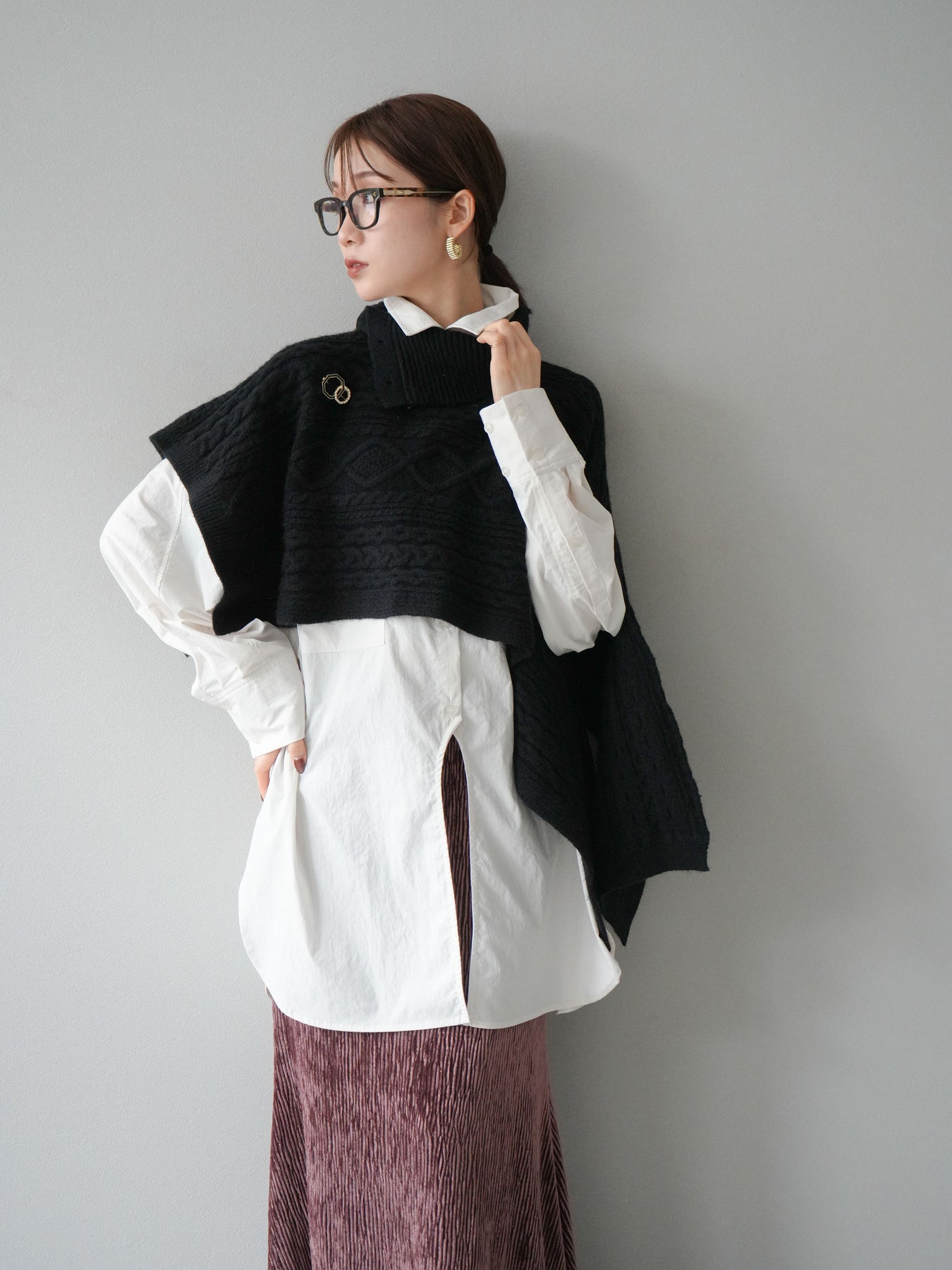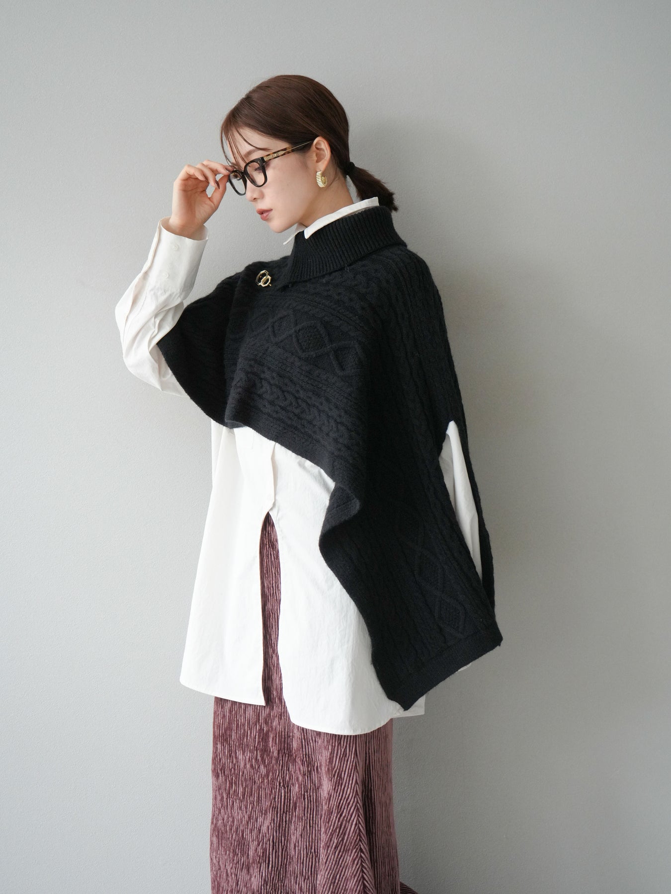 立体感のあるケーブル編みが目を惹くニットケープ。柔らかな風合いと程よいボリューム感で、羽織るだけでシーズンムードを高めてくれます。肩を包み込むようなシルエットが女性らしく、シャツやタートルネックに重ねるだけでこなれた印象に。襟付きデザインが上品さをプラスし、カジュアルにもきれいめにも合わせやすい万能アイテムです。ライトアウター感覚で着られる、秋冬のレイヤードスタイルにぴったりな一枚。 ※ボトムス、キャミソール(インナー)以外の商品は一律でインナーは付属していません。