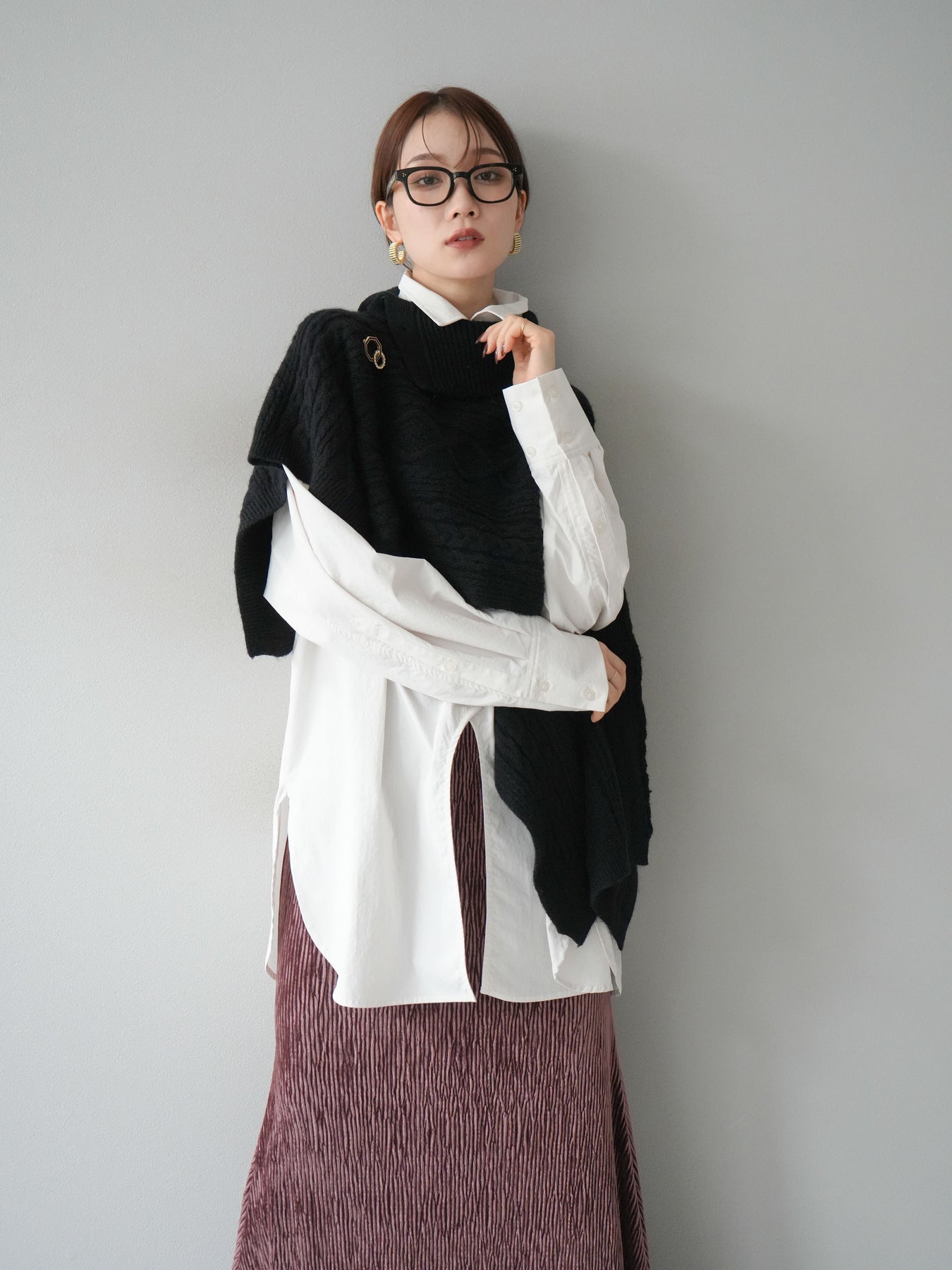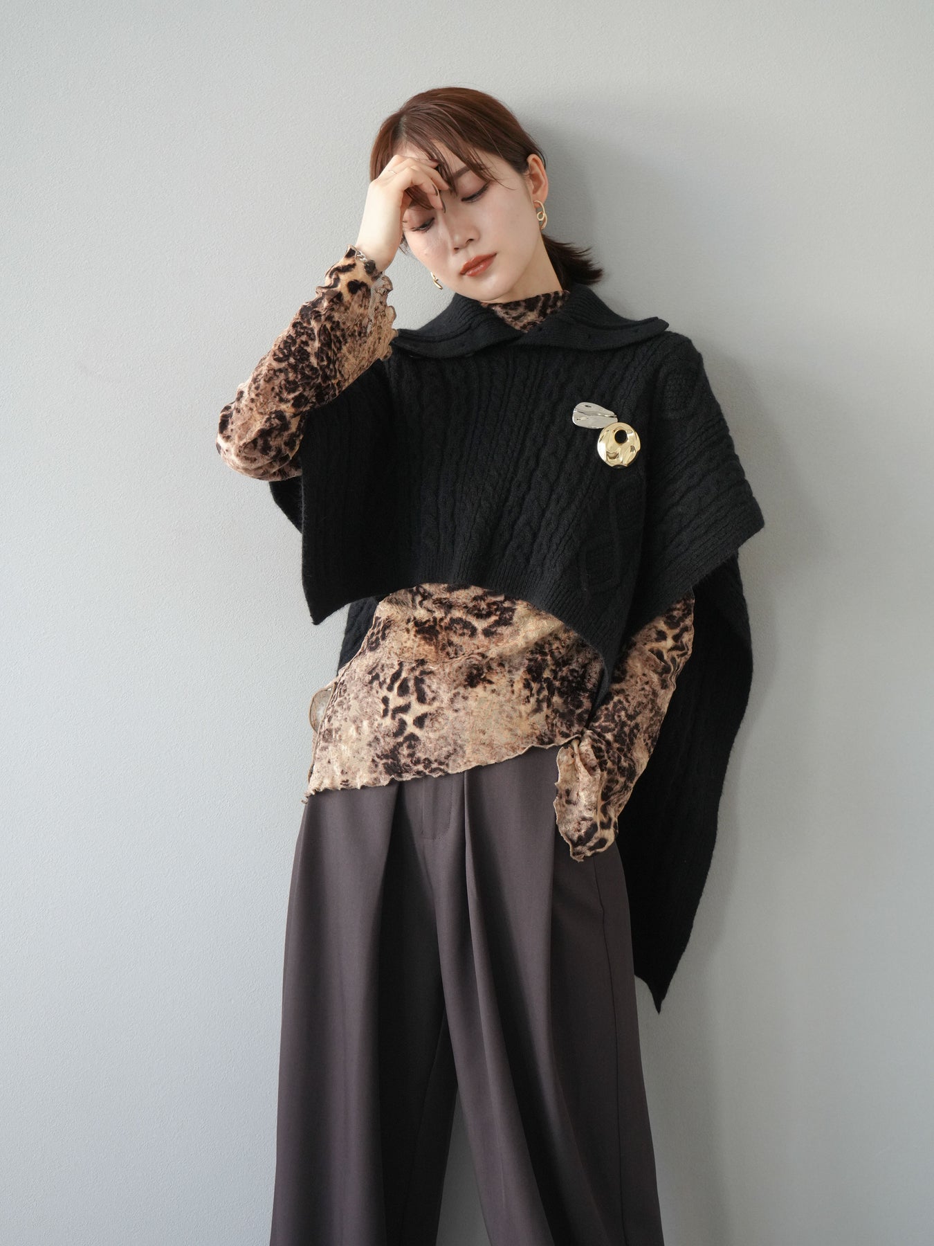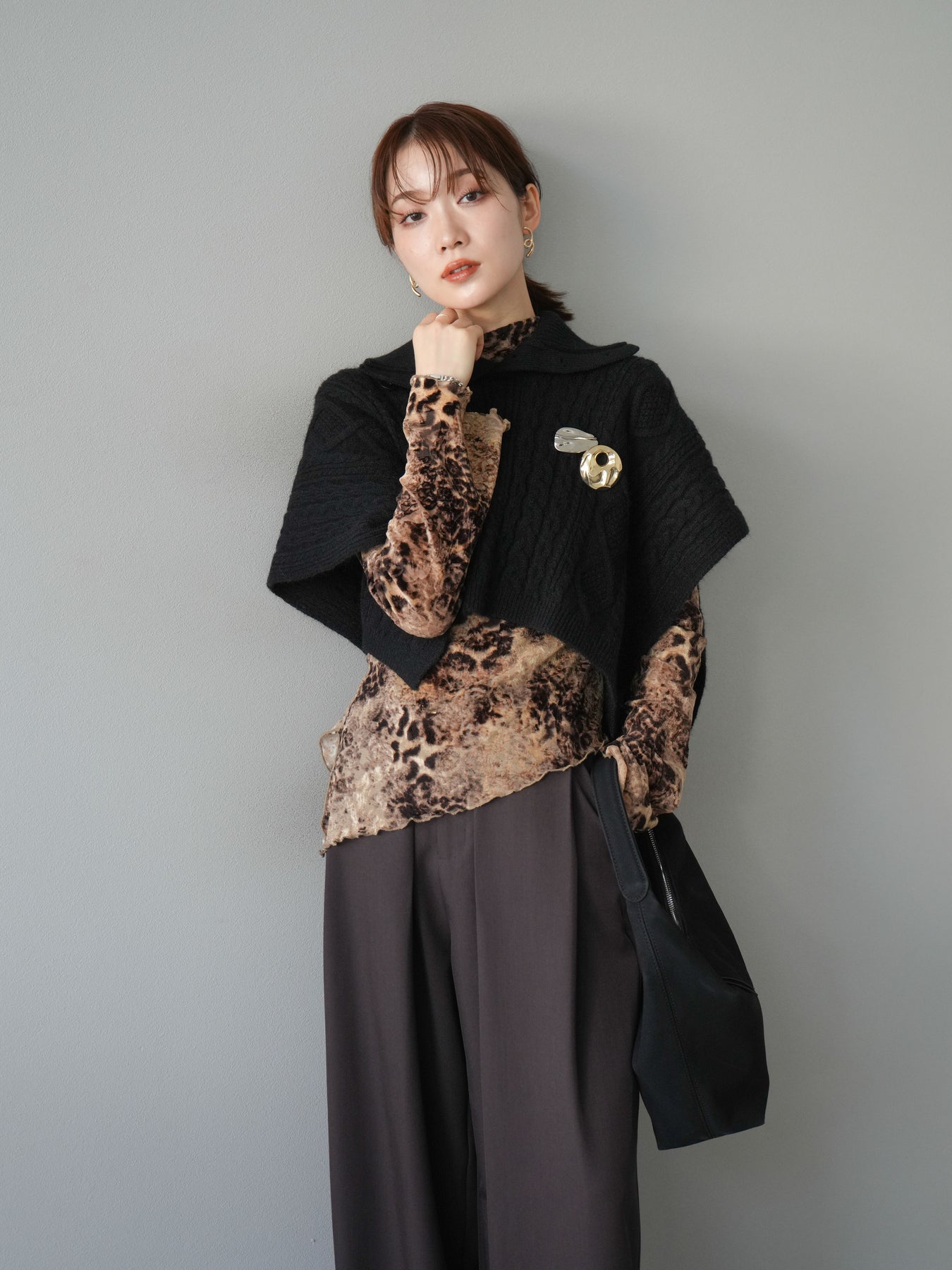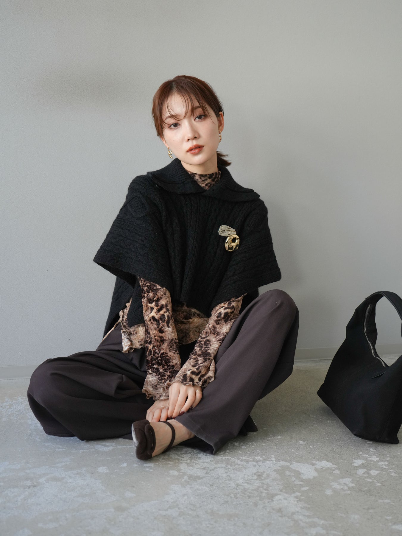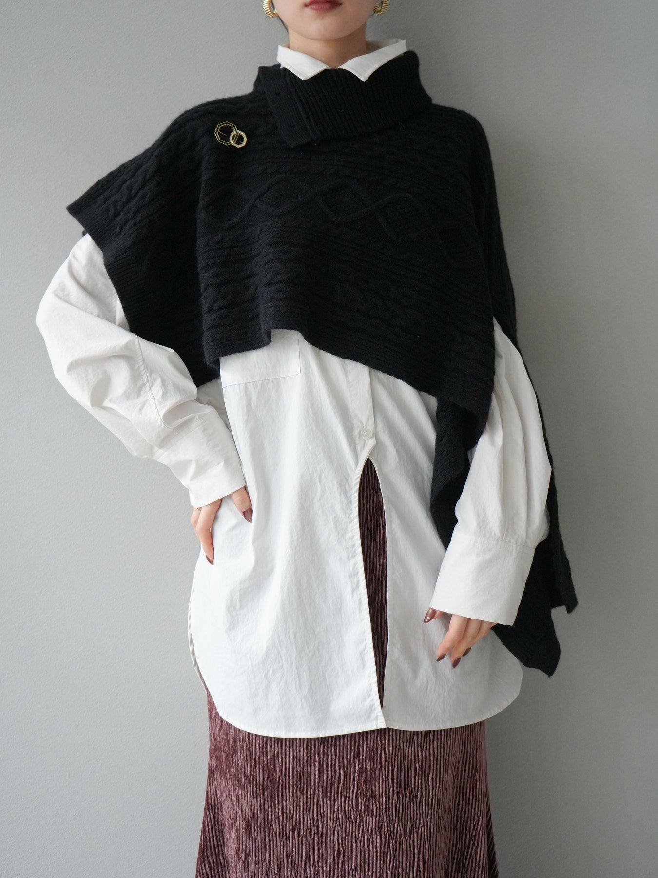 立体感のあるケーブル編みが目を惹くニットケープ。柔らかな風合いと程よいボリューム感で、羽織るだけでシーズンムードを高めてくれます。肩を包み込むようなシルエットが女性らしく、シャツやタートルネックに重ねるだけでこなれた印象に。襟付きデザインが上品さをプラスし、カジュアルにもきれいめにも合わせやすい万能アイテムです。ライトアウター感覚で着られる、秋冬のレイヤードスタイルにぴったりな一枚。 ※ボトムス、キャミソール(インナー)以外の商品は一律でインナーは付属していません。