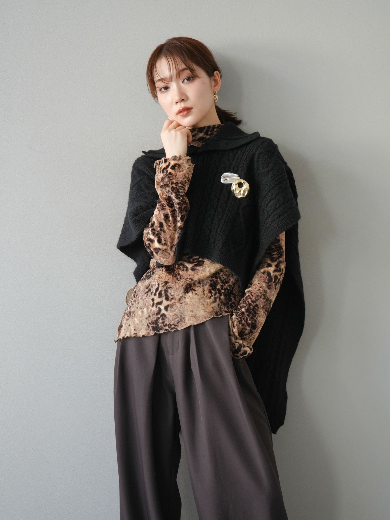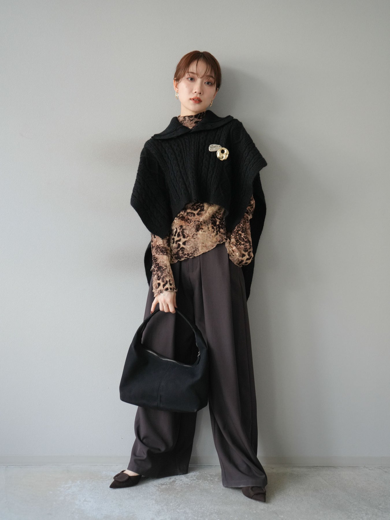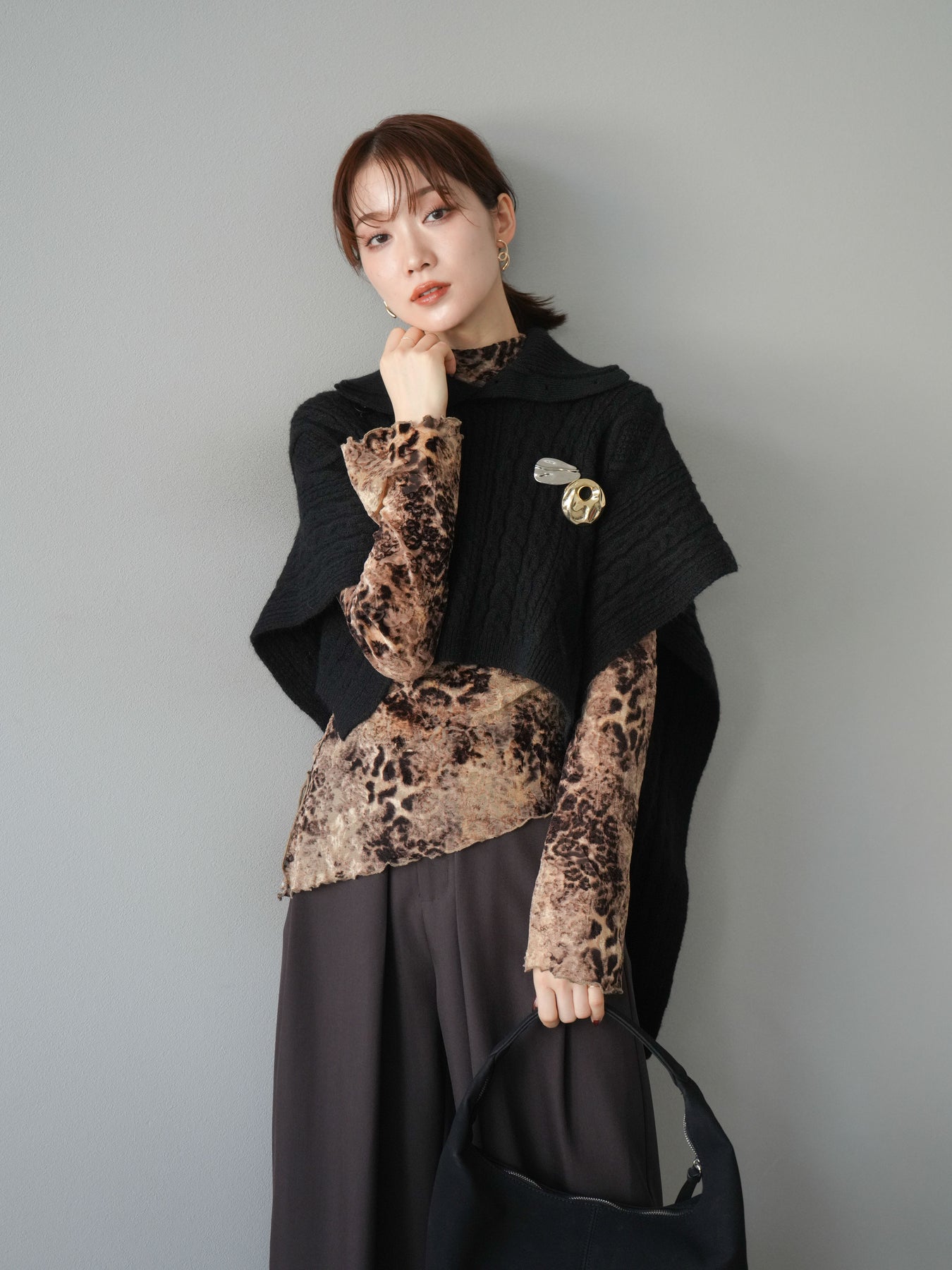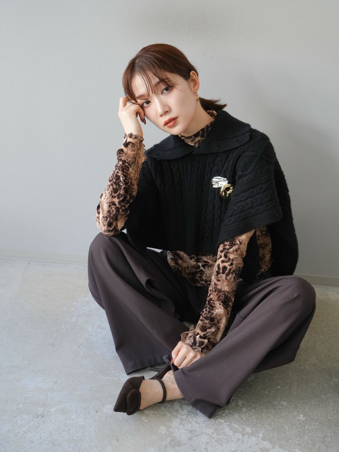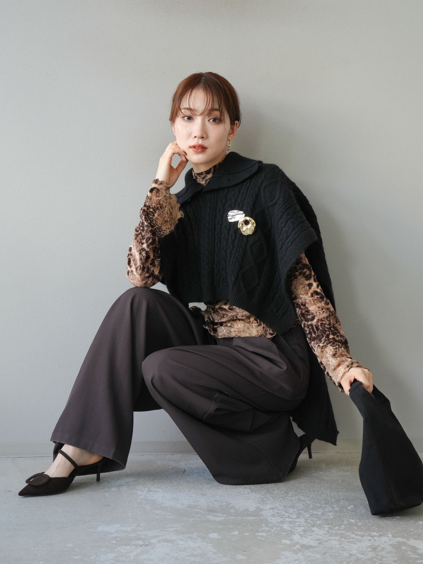 立体感のあるケーブル編みが目を惹くニットケープ。柔らかな風合いと程よいボリューム感で、羽織るだけでシーズンムードを高めてくれます。肩を包み込むようなシルエットが女性らしく、シャツやタートルネックに重ねるだけでこなれた印象に。襟付きデザインが上品さをプラスし、カジュアルにもきれいめにも合わせやすい万能アイテムです。ライトアウター感覚で着られる、秋冬のレイヤードスタイルにぴったりな一枚。 ※ボトムス、キャミソール(インナー)以外の商品は一律でインナーは付属していません。