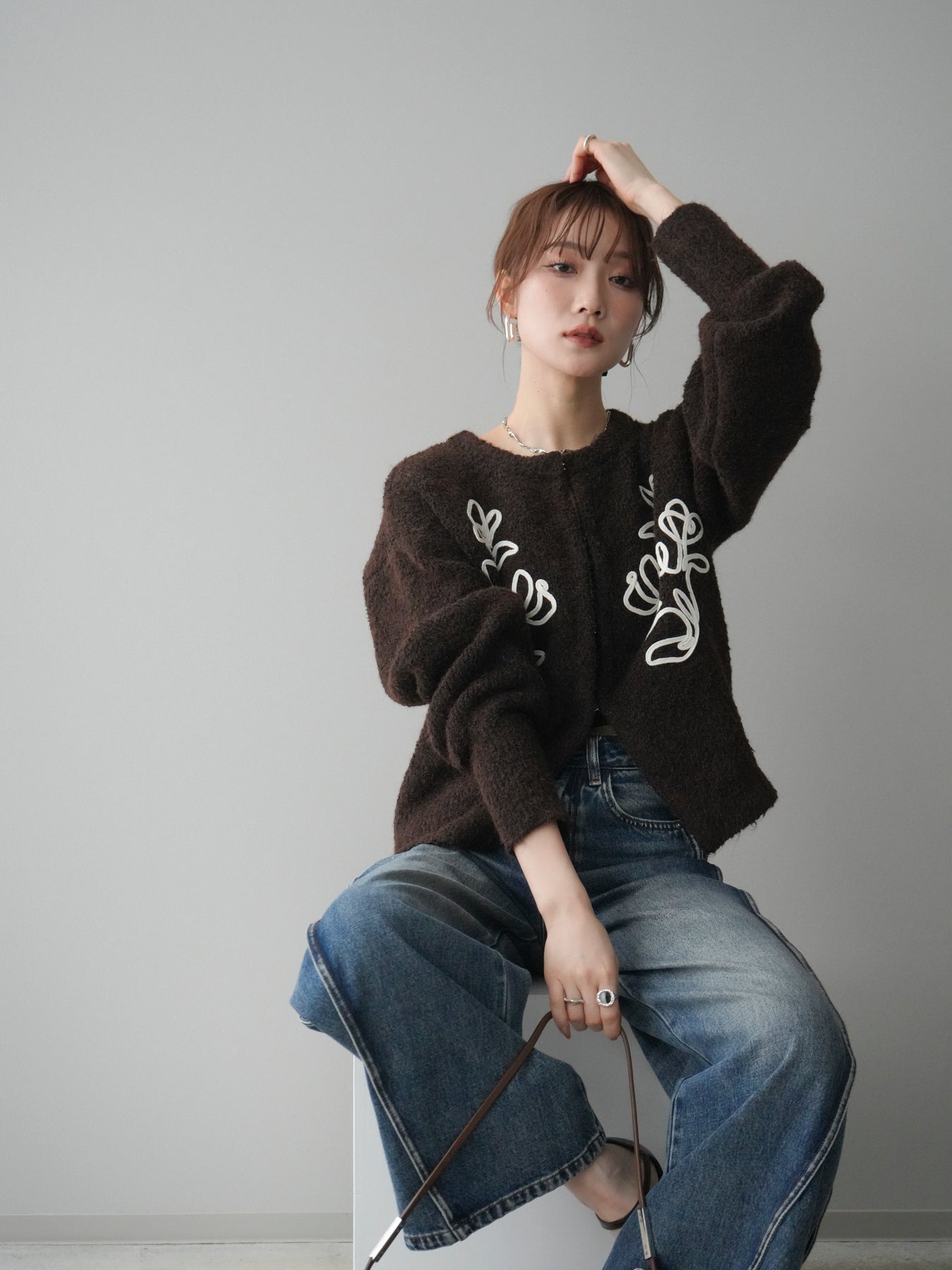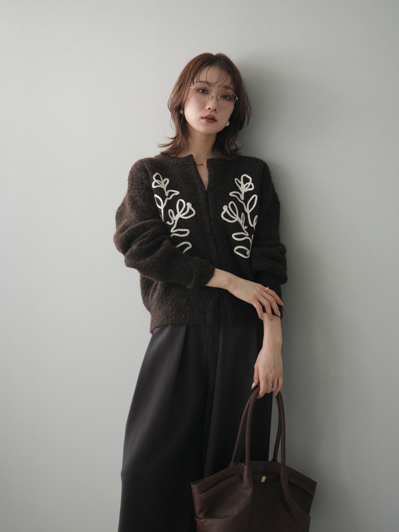 立体感のあるブークレ素材に、線画のようなテープ刺繍をあしらった存在感のあるニットカーディガン。 シンプルながらも印象的なモチーフが、コーディネートに程よいアクセントをプラスします。 フロントはホック仕様ですっきりとした印象に仕上げ、前を閉じても開けてもバランスよく着用可能。 ややコンパクトな丈感で、ワイドパンツやスカートとも相性が良く、スタイルアップ効果も期待できます。 カラーは落ち着いたトーン展開で、大人っぽく着こなせるのもポイント。 デイリーからお出かけまで幅広く活躍する、主役級ニットカーディガンです。